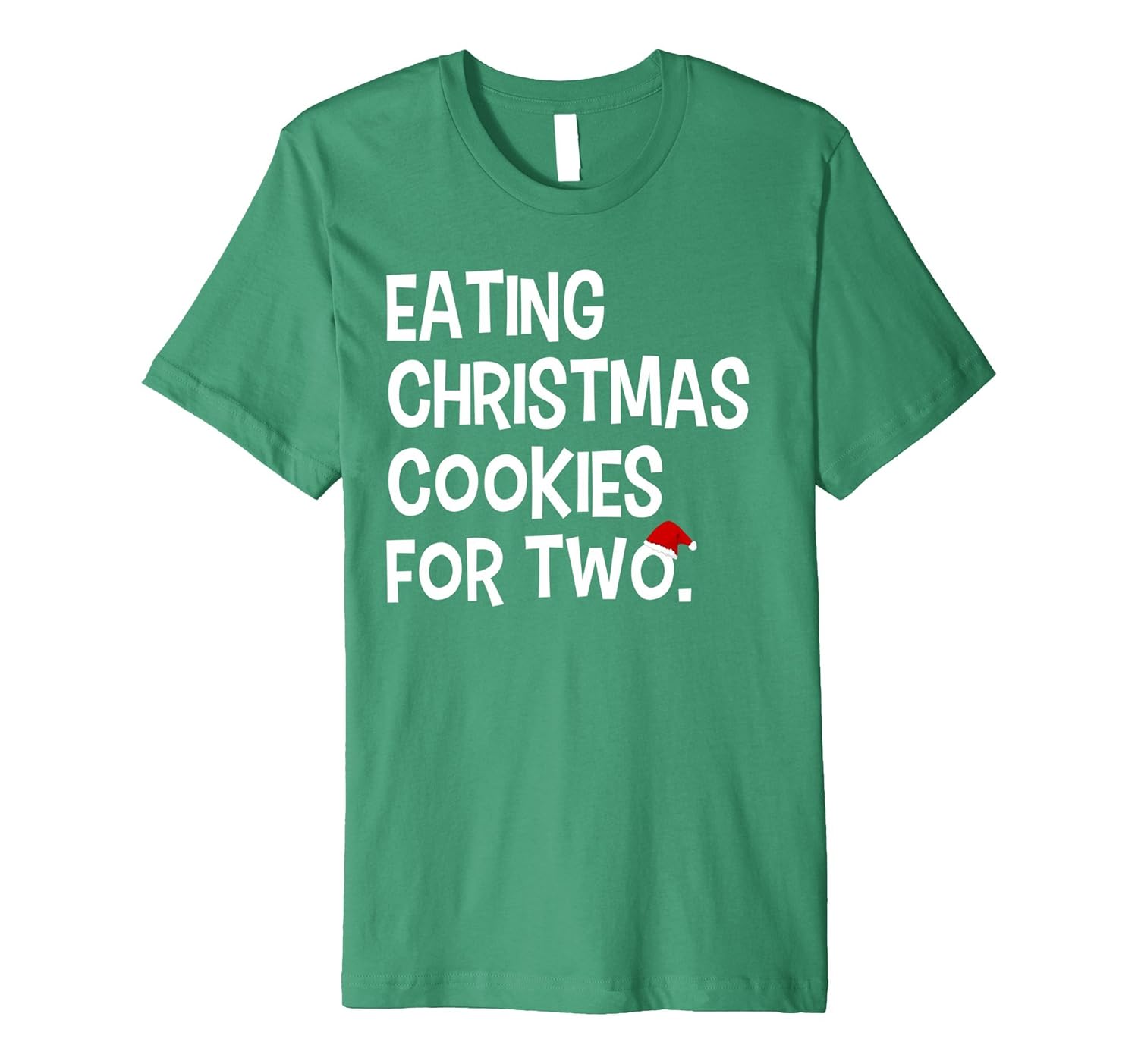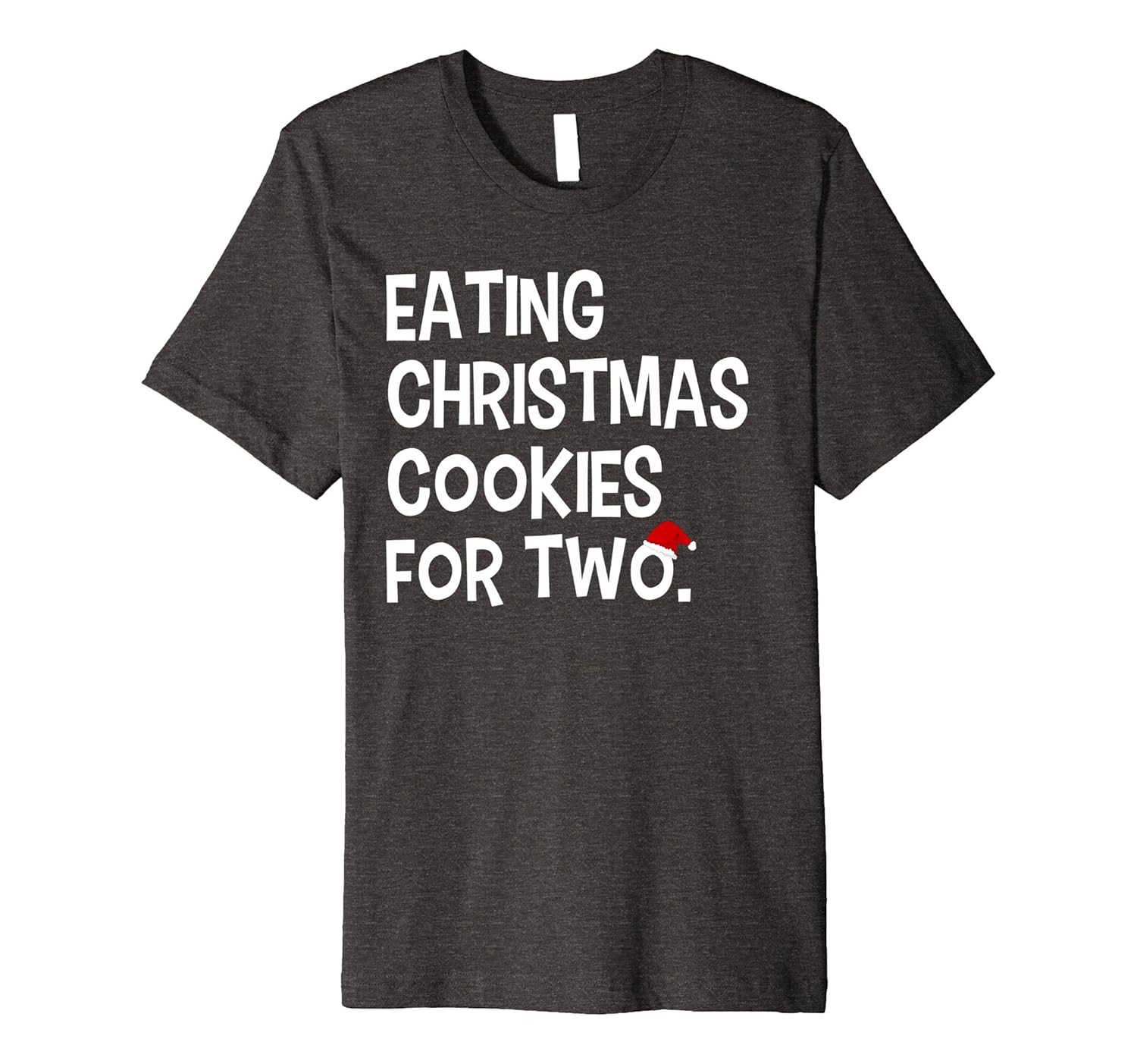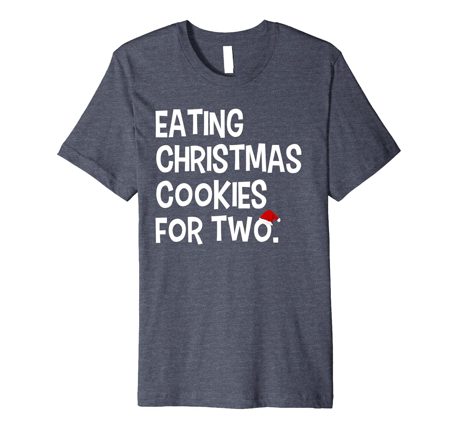 Solid colors: 100% Cotton; Heather Grey: 90% Cotton, 10% Polyester; All Other Heathers: 58% Cotton, 42% Polyester; Imported; Machine wash cold with like colors, dry low heat; Shirt reads Eating Christmas Cookies For Two This tshirt is a great christmas pregnancy announcement shirt. Great for women who are due in 2018 and want to let everyone know theyre pregnant!; Fit: Slim (consider ordering a larger size for a looser fit); Pair with pregnancy announcement cards, and Christmas pregnancy announcement onesie for a complete surprise!; This premium t-shirt is made of lightweight fine jersey fabric