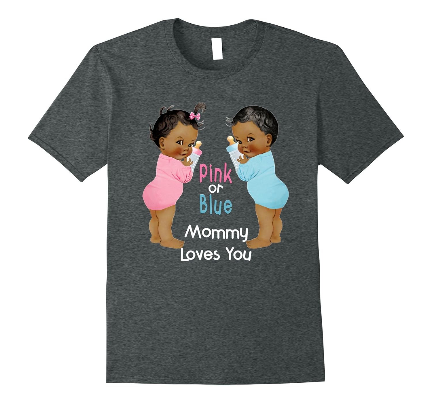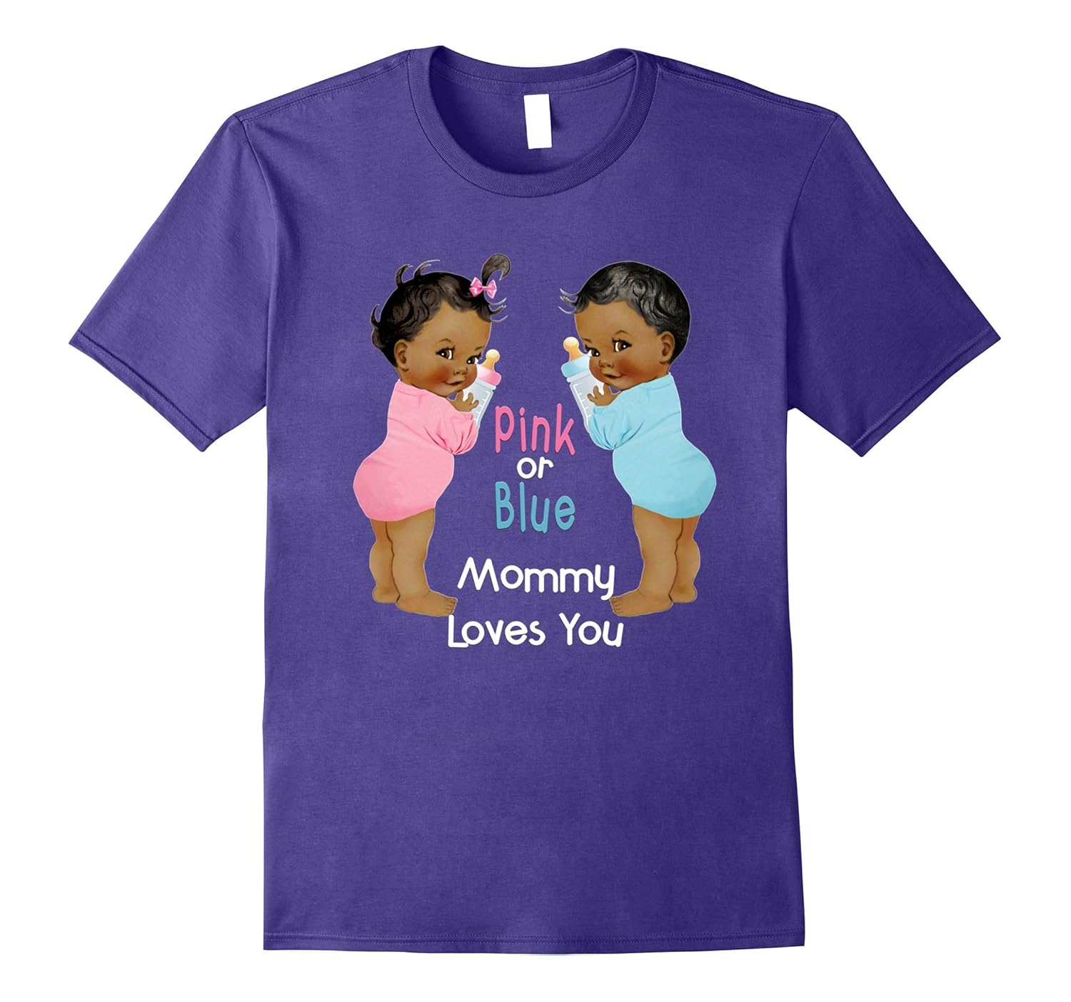 Solid colors: 100% Cotton; Heather Grey: 90% Cotton, 10% Polyester; All Other Heathers: 50% Cotton, 50% Polyester; Imported; Machine wash cold with like colors, dry low heat; Fun African American girl and boy babies gender reveal party baby shower tee for Mommy, Mom, Mother. Cute baby shower party favors for guests. Funny gender reveal baby shower idea, baby shower gift item, baby shower party supplies.; Team pink or team blue? Team boy or team girl? Pink or Blue Mommy loves you retro vintage ethnic boy and girl baby gender reveal family shirt. Designed and printed to be fitted. For a more loose fit, please order a size up.; Lightweight, Classic fit, Double-needle sleeve and bottom hem