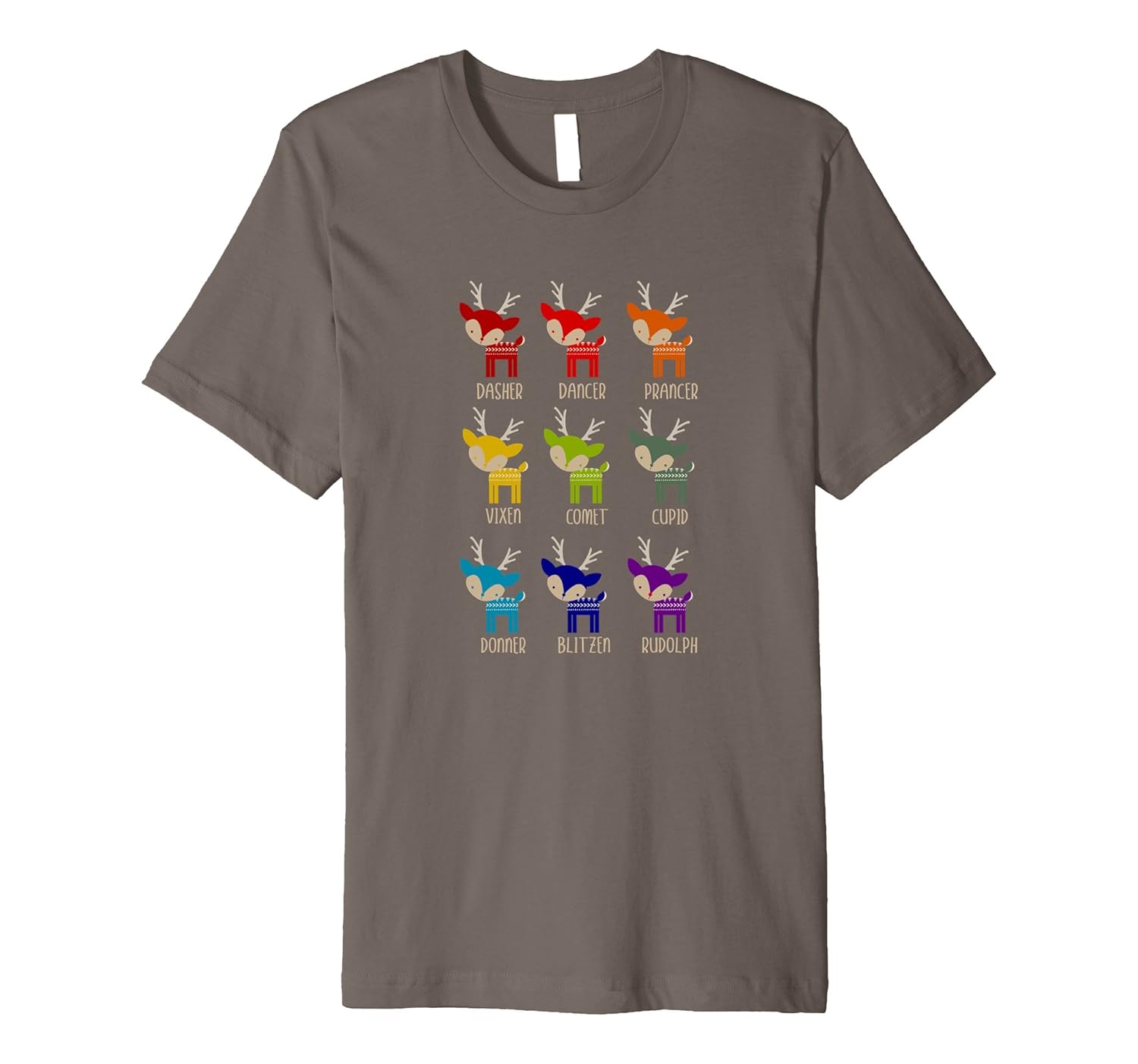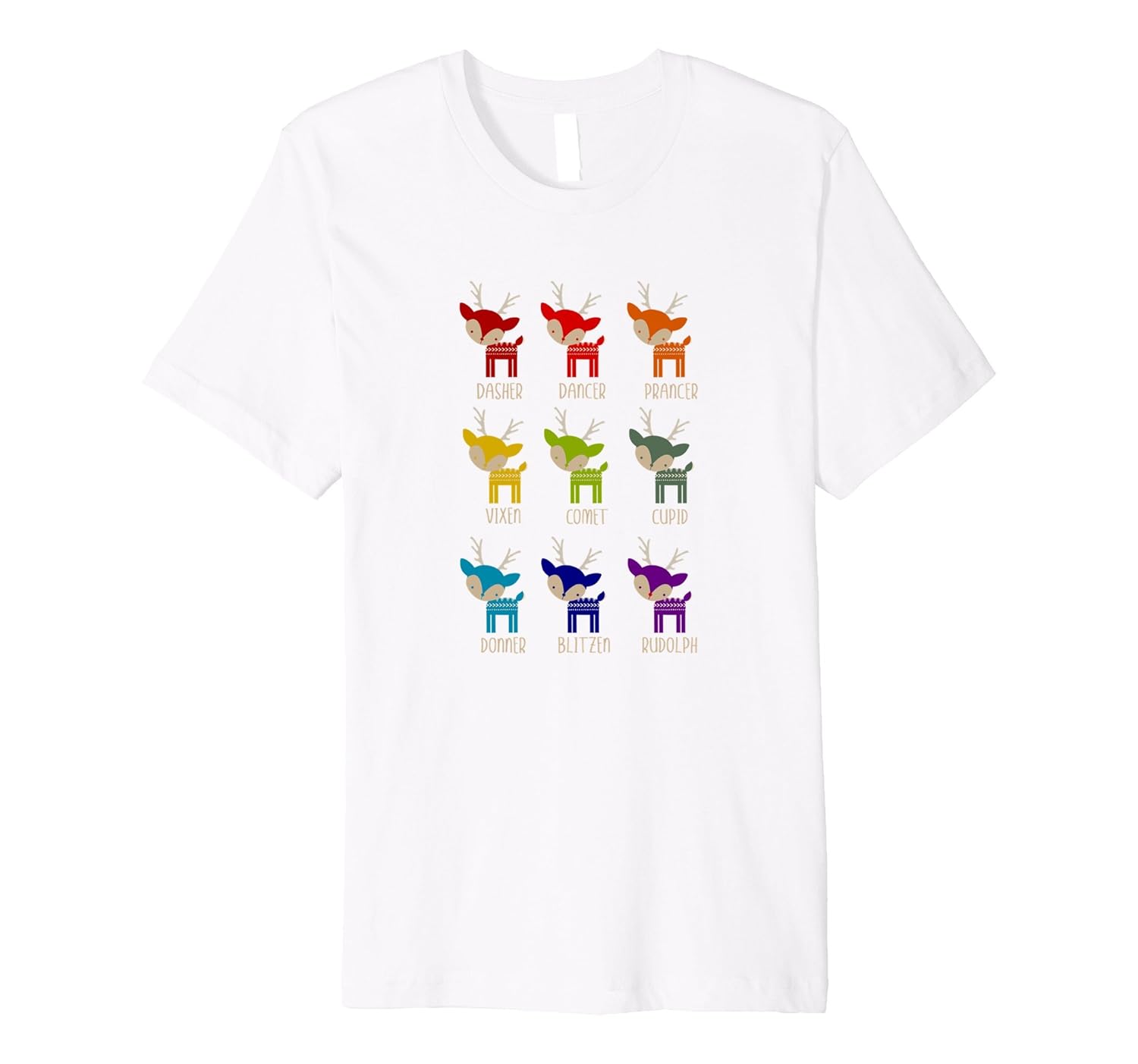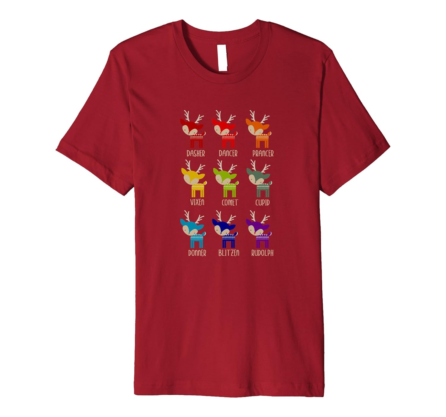 100% Cotton; Imported; Machine wash cold with like colors, dry low heat; Never forget the names of all the reindeer again with this adorable t-shirt. Its perfect for sending festive holiday cheer. Wear it to your office Christmas party, a tacky sweater party or while wrapping up Christmas presents.; Fit: Slim (consider ordering a larger size for a looser fit); Dasher, Dancer, Prancer, Vixen, Comet, Cupid, Donner, Blitzen and Rudolph are depicted in a full rainbow of colors on this tee shirt. The name of each reindeer is beneath so that you can keep track of them all. This t-shirt makes a great gift for your secret Santa, holiday grab bags or your favorite Christmas fanatic. Tshirt is available in sizes for men, ladies and kids so that everyone can spread a bit of Merry Christmas.; This premium t-shirt is made of lightweight fine jersey fabric