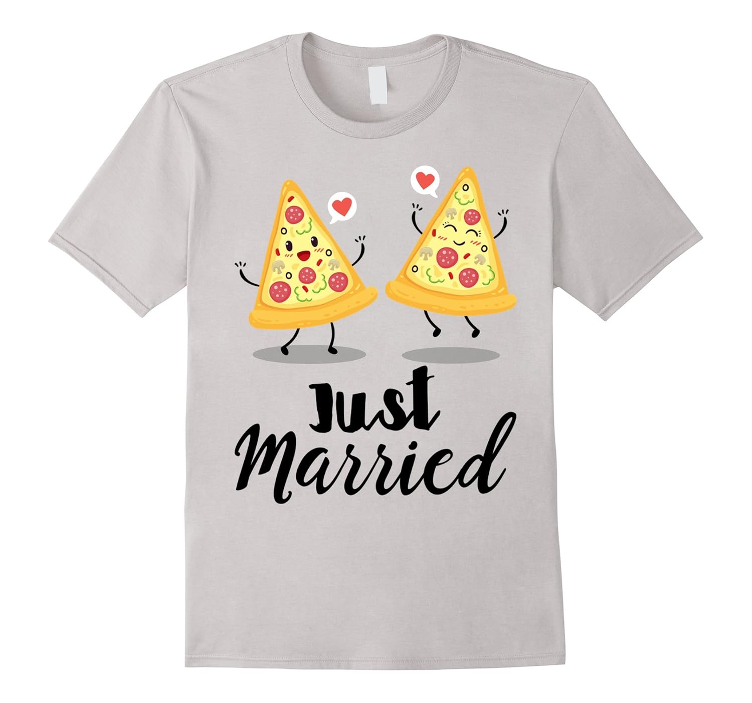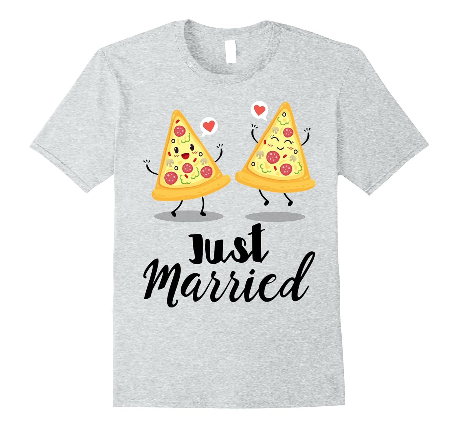 Solid colors: 100% Cotton; Heather Grey: 90% Cotton, 10% Polyester; All Other Heathers: 65% Cotton, 35% Polyester, Imported, Machine wash cold with like colors, dry low heat, Happy pizza couple with hearts “Just Married” t-shirt. His and her couple t-shirt, just married t-shirt. Funny wedding t-shirt for the bride and groom. Lightweight, Classic fit, Double-needle sleeve and bottom hem