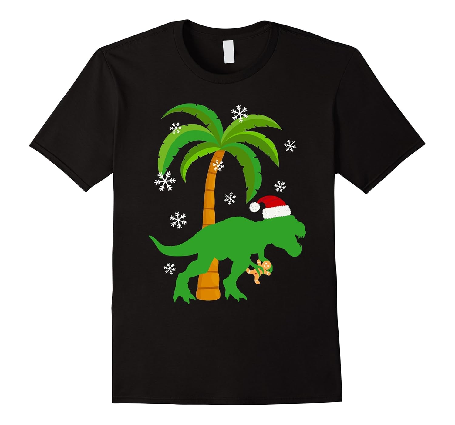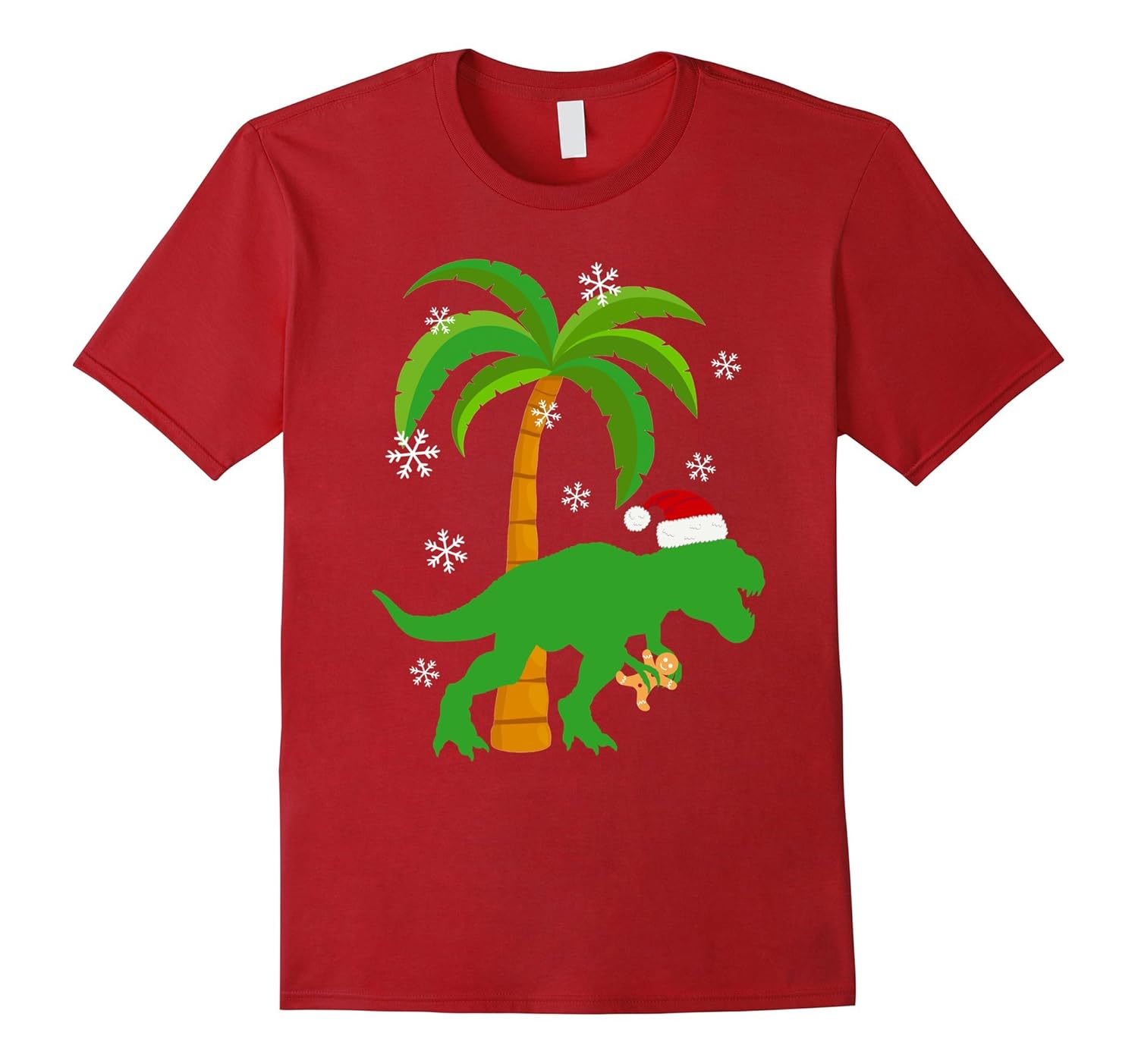 Solid colors: 100% Cotton; Heather Grey: 90% Cotton, 10% Polyester; All Other Heathers: 65% Cotton, 35% Polyester; Imported; Machine wash cold with like colors, dry low heat; Lovely Andamp; cute t-rex wearing Santa hat t-shirt is the perfect Christmas costume for who celebrates a warm Christmas in many countries such as Australia, Mexico, Jamaica, Puerto Rico, Nevada or some states Hawaii, Florida, California.; Great Xmas present for any beach lovers or who loves t-rex, dinosaurs and Christmas decorations, snowflake, coconut tree. Perfect for men, women, family, friends, kids. If youre headed out for a tropical vacation this winter. Youll love this tee.; Lightweight, Classic fit, Double-needle sleeve and bottom hem