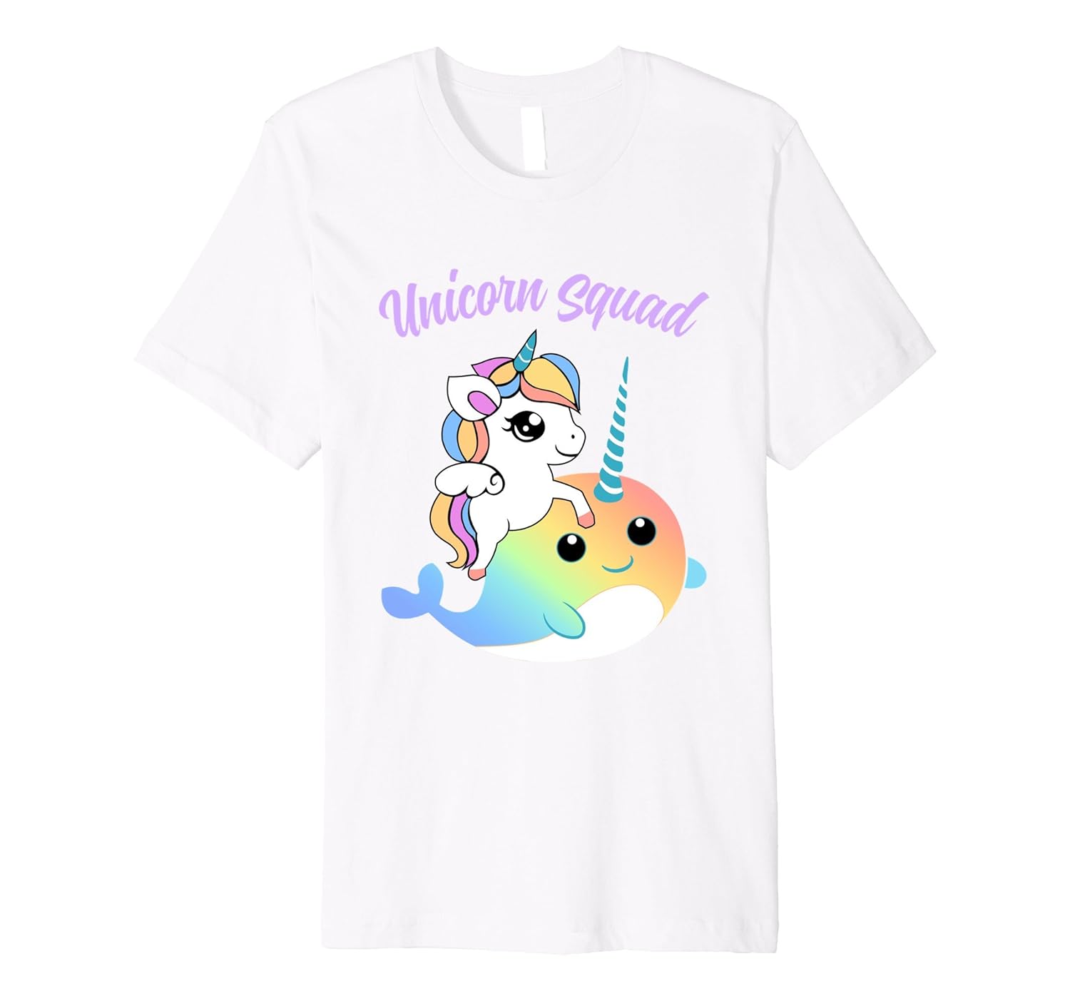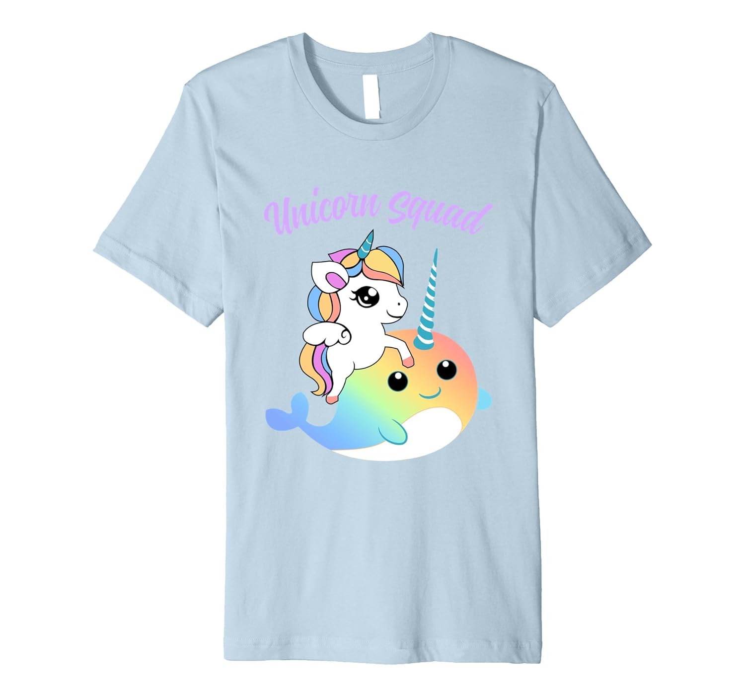 Solid colors: 100% Cotton; Heather Grey: 90% Cotton, 10% Polyester; All Other Heathers: 58% Cotton, 42% Polyester; Imported; Machine wash cold with like colors, dry low heat; Whats better than a unicorn? A unicorn squad, with unicorn and his buddy the narwhal! This adorable tee makes a great gift for kids and adults! This t-shirt is perfect for friends and family who love cute, kawaii unicorns or narwhals!; Fit: Slim (consider ordering a larger size for a looser fit); Shirts tend to run a little tight, for a looser fit, please order a shirt one size up. Unicorns and narwhals, is there anything better? This shirt could make a great present for Christmas or any other Holiday!; This premium t-shirt is made of lightweight fine jersey fabric