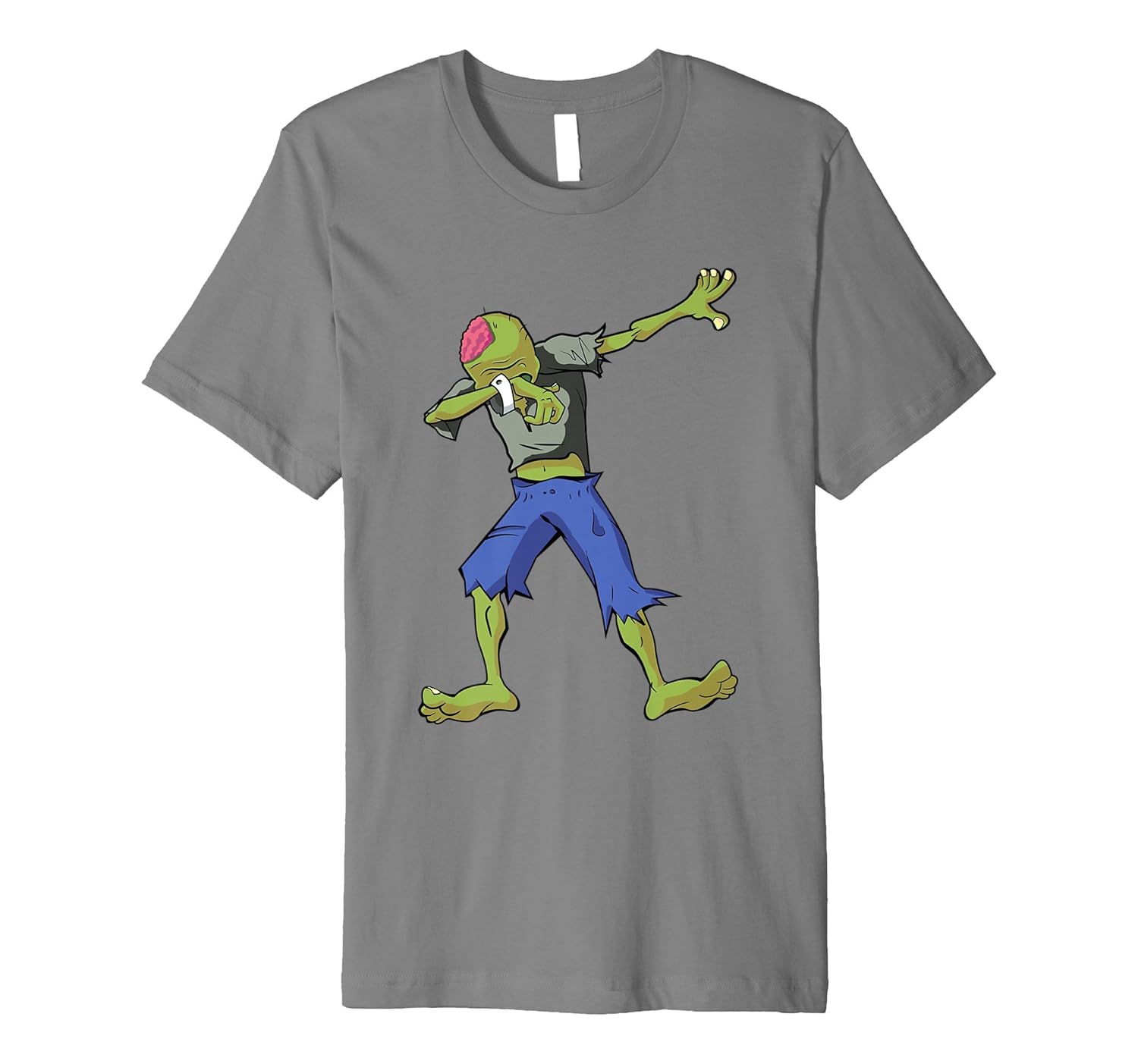 Solid colors: 100% Cotton; Heather Grey: 90% Cotton, 10% Polyester; All Other Heathers: 58% Cotton, 42% Polyester; Imported; Machine wash cold with like colors, dry low heat; TShirt: Funny Dabbing Zombie Shirt. No Dabbing unicorn or pug doing the dab hip hop dance move as cool as this Halloween Zombie. Great funny gift for men, women, kids, toddlers, boys and Girls. This tee is much better than your vampire, pumpkin T-Shirt.; Use this shirt as your Halloween Costume. You will impress the other skeletons, mummies and zombies. Perfect in addition with zombie toys, party supplies, knife, survival guide, movies, stickers, slippers, coloring books, cake decorations, …; This premium t-shirt is made of lightweight fine jersey fabric; Fit: Slim (consider ordering a larger size for a looser fit)