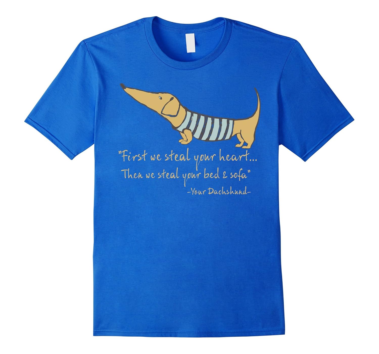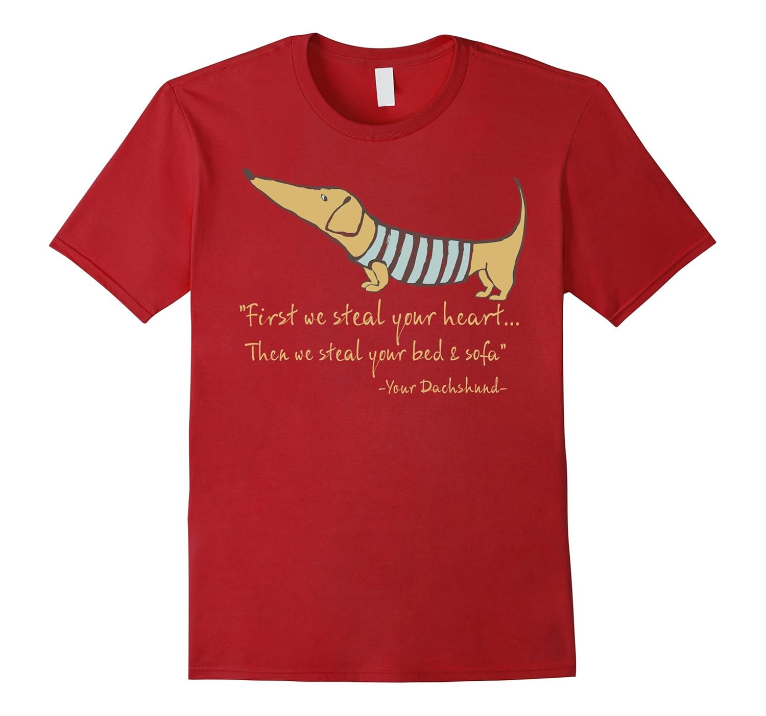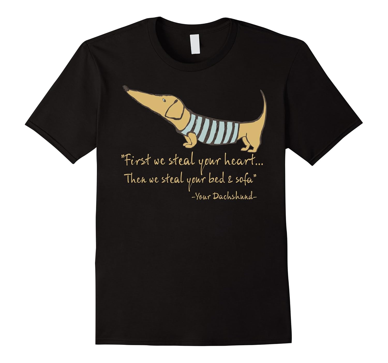Solid colors: 100% Cotton; Heather Grey: 90% Cotton, 10% Polyester; All Other Heathers: 65% Cotton, 35% Polyester, Imported, Machine wash cold with like colors, dry low heat, Dachshund T-shirt First We Steal Your Heart Then We Steal Your Bed And Sofa T-shirt, dachshund shirts, dachshund tshirts, love dachshund shirts, love dachshund tshirts, dachshund lover shirts, dachshund lover tshirts, dog shirts, dog tshirts, dog lover shirts, dog lover tshirts, love dog shirts, love dog tshirts, shirts for dog lover, Lightweight, Classic fit, Double-needle sleeve and bottom hem