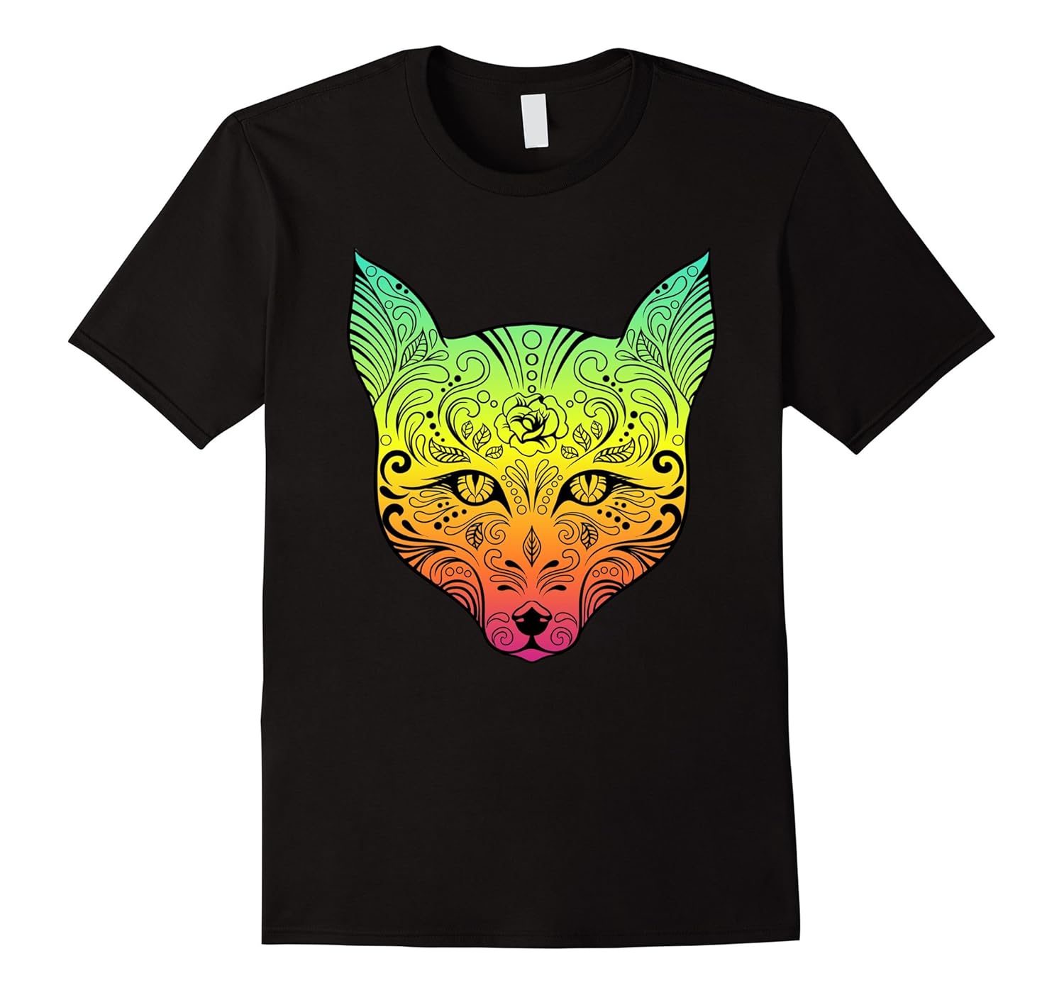 Solid colors: 100% Cotton; Heather Grey: 90% Cotton, 10% Polyester; All Other Heathers: 65% Cotton, 35% Polyester, Imported, Machine wash cold with like colors, dry low heat, Have a great time celebrating Halloween, Day of the Dead or a night on the town with this beautifully designed candy skull tee shirt featuring a fox head with sugar skull markings and a trippy array of colors. Is a great birthday / Christmas gift. Perfect for Halloween, Day of the Dead celebrations, Dia de los Muertos fiestas, trick or treating, carving pumpkins, clubbing, techno / electronic dance music party, an evening at a nightclub or visiting a haunted house. Very cool and hip design. Lightweight, Classic fit, Double-needle sleeve and bottom hem