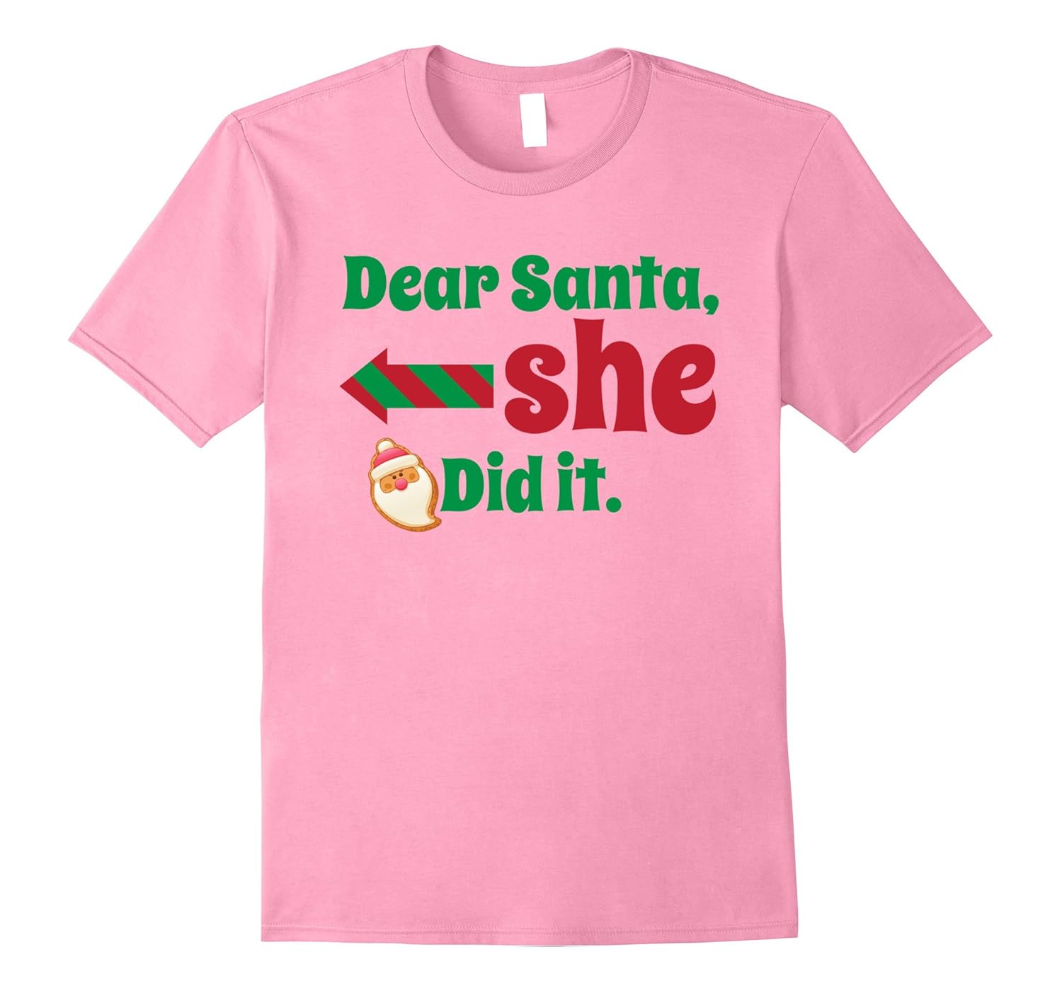 Solid colors: 100% Cotton; Heather Grey: 90% Cotton, 10% Polyester; All Other Heathers: 65% Cotton, 35% Polyester, Imported, Machine wash cold with like colors, dry low heat, This dear santa she did it funny xmas tshirt is part of a set of tees that say he or she did it and points left or right. More matching shirts in the dear santa shirt boutique. Great matching tees for the whole family and/or naughty and nice kids, Features a candy cane style arrow pointing to the left and a gingerbread santa cookie. Great as a christmas gift, to wear to a party, as a family christmas shirt or just for casual wear during the festive season. Bring some christmas cheer to your home, Lightweight, Classic fit, Double-needle sleeve and bottom hem
