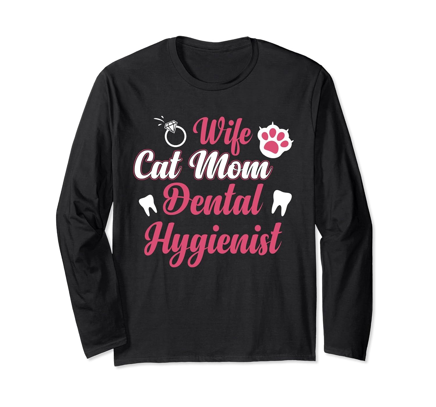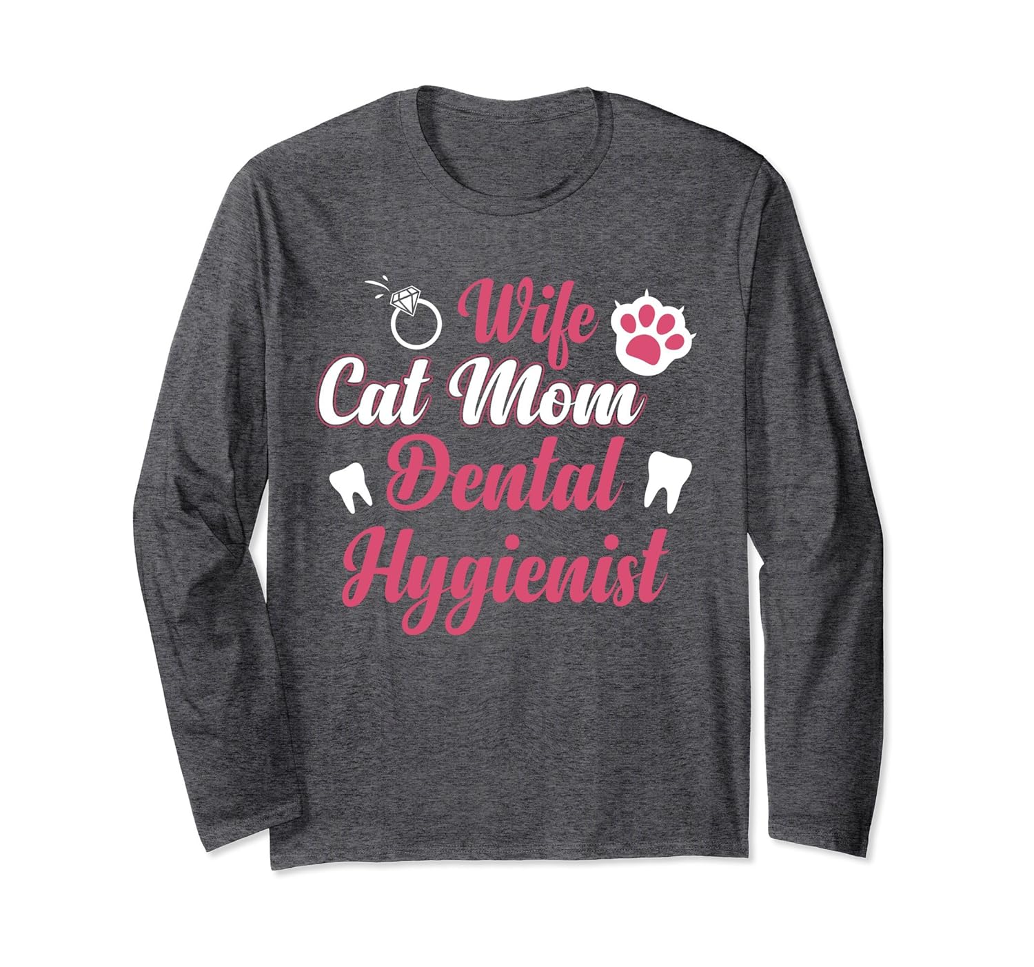 Solid colors: 100% Cotton; Heather Grey: 90% Cotton, 10% Polyester; All Other Heathers: 50% Cotton, 50% Polyester; Imported; Machine wash cold with like colors, dry low heat; This Wife Cat Mom Dental Hygienist Long Sleeve T-shirt is great for mom, auntie, mama, wife, sister, daughter, BFF, girlfriend, besties who love cat, kitten and being a professional legend Dental Hygienist, dental assistants, dental technicians NSNAMP4; Your son or daughter, twins, triplets must be proud of their cat mom. I love my cat wife. I love my cat mom. Best mom ever. I love my family. Proud of being a Dental Hygienist whether youre retired or not, dental therapists, dentists, dental school studen; Lightweight, Classic fit, Double-needle sleeve and bottom hem