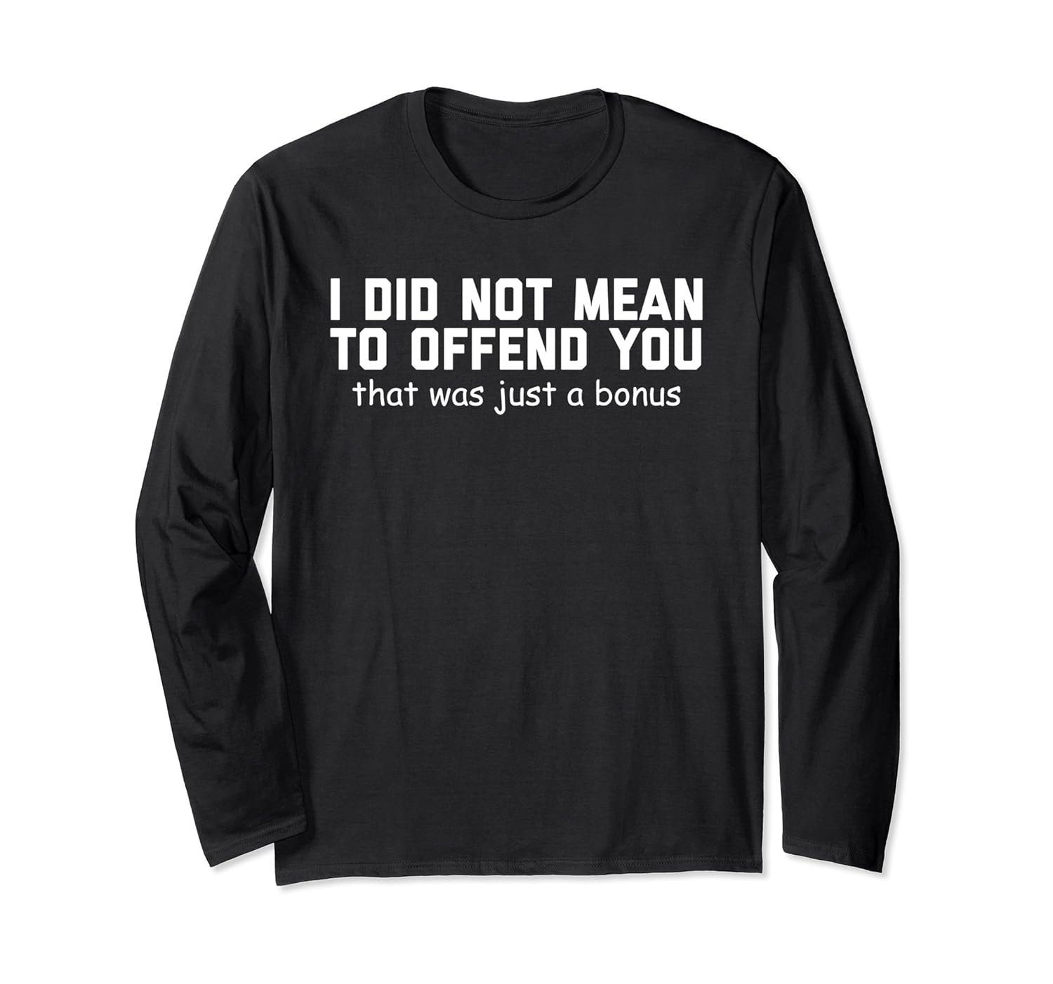 Solid colors: 100% Cotton; Heather Grey: 90% Cotton, 10% Polyester; All Other Heathers: 50% Cotton, 50% Polyester; Imported; Machine wash cold with like colors, dry low heat; I Did Not Mean To Offend You That Was Just A Bonus Long Sleeved Tee Shirt.; Unisex Long Sleeve TShirt Sizes Fit Mens, Womens and Big Kids. See Size Chart for details.; Lightweight, Classic fit, Double-needle sleeve and bottom hem