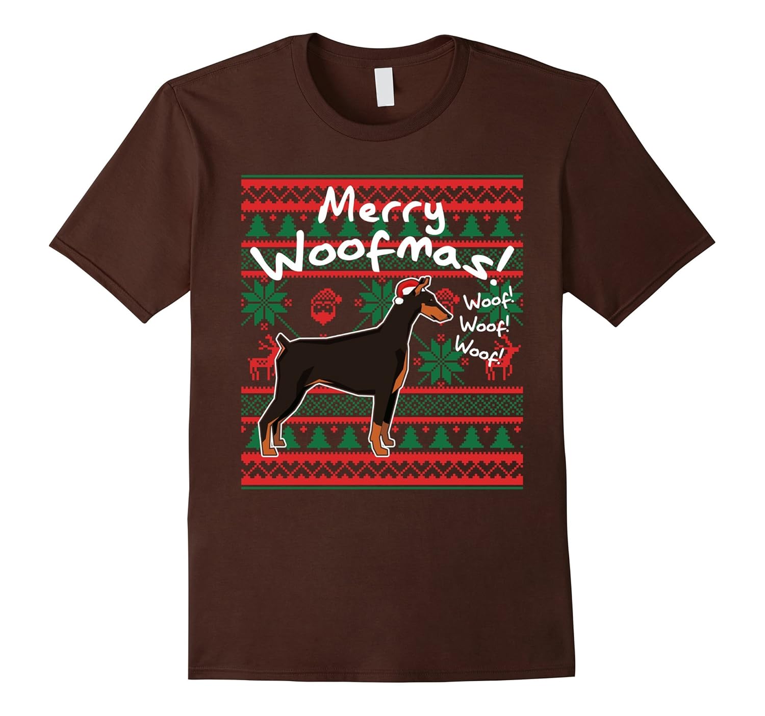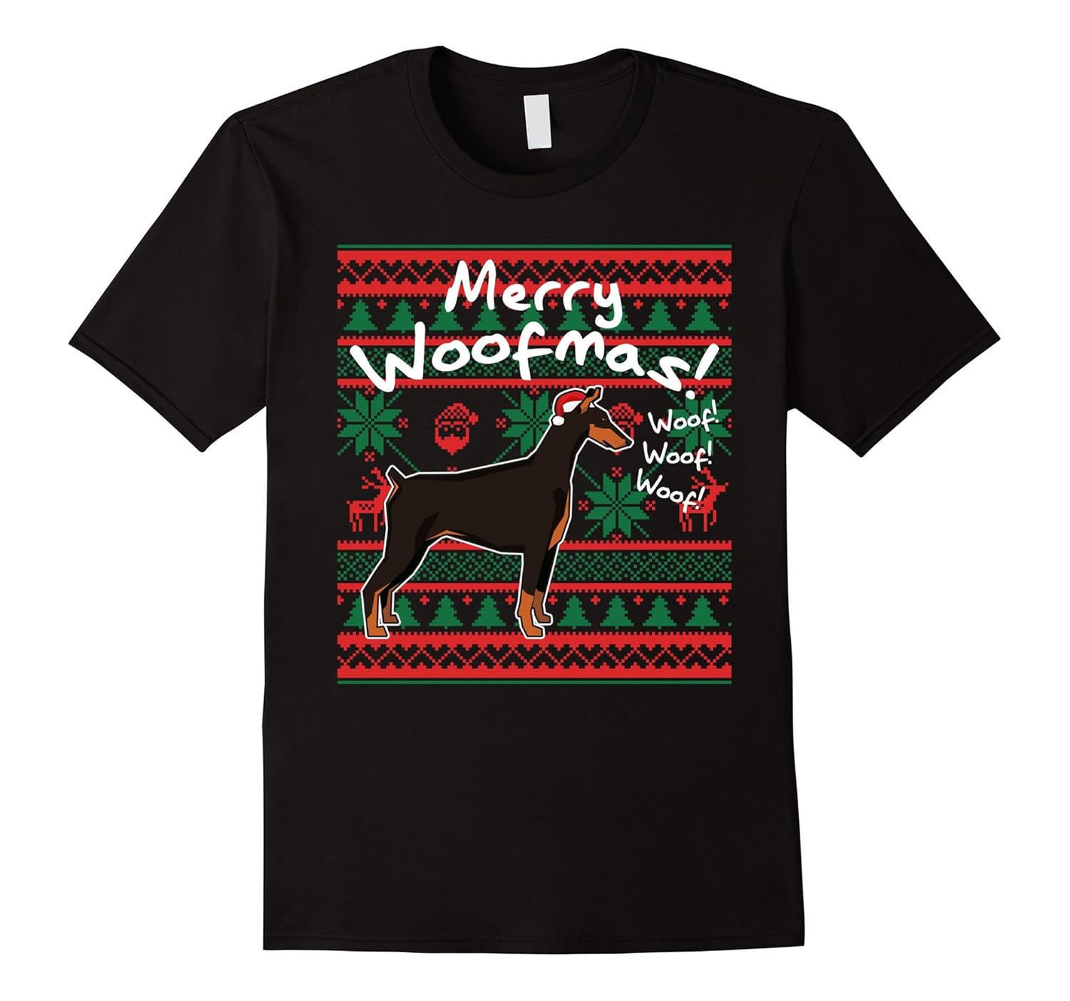 Solid colors: 100% Cotton; Heather Grey: 90% Cotton, 10% Polyester; All Other Heathers: 65% Cotton, 35% Polyester; Imported; Machine wash cold with like colors, dry low heat; Doberman Christmas T-Shirt wishing you Merry Woofmas! Woof! Woof! Woof!; This Doberman dog with a santa hat is a great christmas gift for dog lovers specialy the Doberman dog breed. The shirt has an ugly christmas pattern (xmas ugly sweater style) ready to the christmas season. Dog owner t shirt. Gifts for dog owners.; Lightweight, Classic fit, Double-needle sleeve and bottom hem