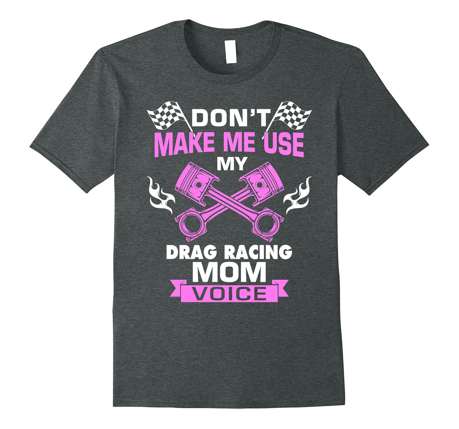 Solid colors: 100% Cotton; Heather Grey: 90% Cotton, 10% Polyester; All Other Heathers: 65% Cotton, 35% Polyester, Imported, Machine wash cold with like colors, dry low heat, This funny distressed tee shirt says “Don”t Make Me Use My Drag Racing Mom Voice.” Perfect for mothers who are coaches or cheer from the sidelines. Makes a great birthday gift or cute Christmas present for friends and family, especially those who are a fan of the sport. Lightweight, Classic fit, Double-needle sleeve and bottom hem