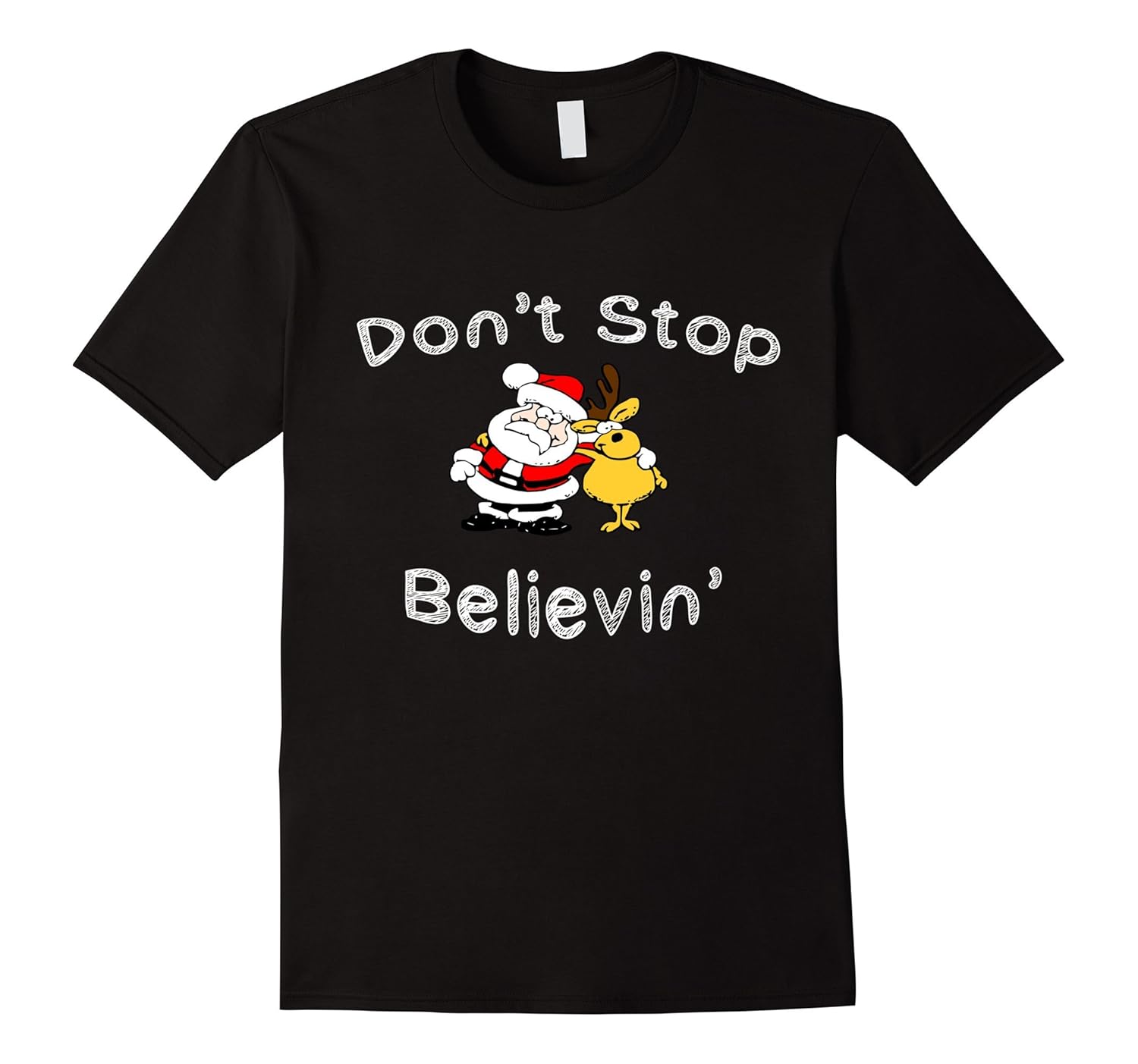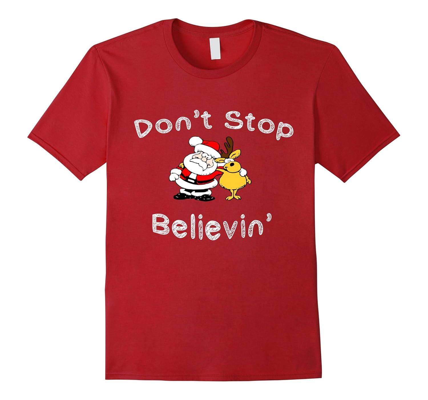 Solid colors: 100% Cotton; Heather Grey: 90% Cotton, 10% Polyester; All Other Heathers: 65% Cotton, 35% Polyester; Imported; Machine wash cold with like colors, dry low heat; Dont Stop Believing Christmas Holiday Short Sleeve T-Shirt; Santa Claus Reindeer T-Shirt; Lightweight, Classic fit, Double-needle sleeve and bottom hem