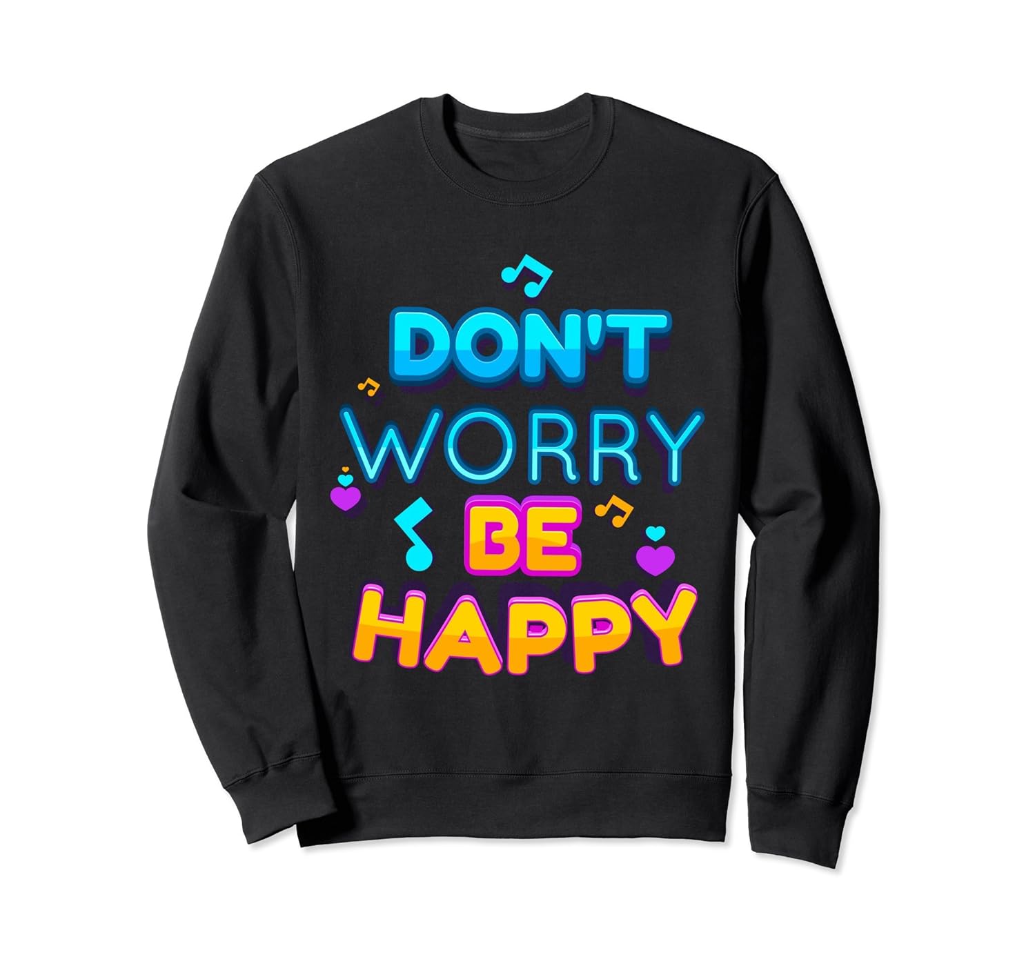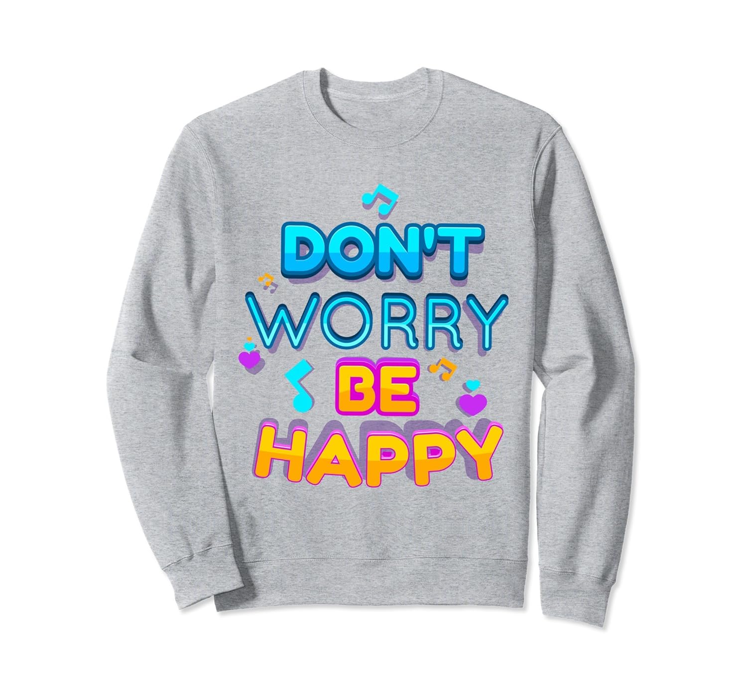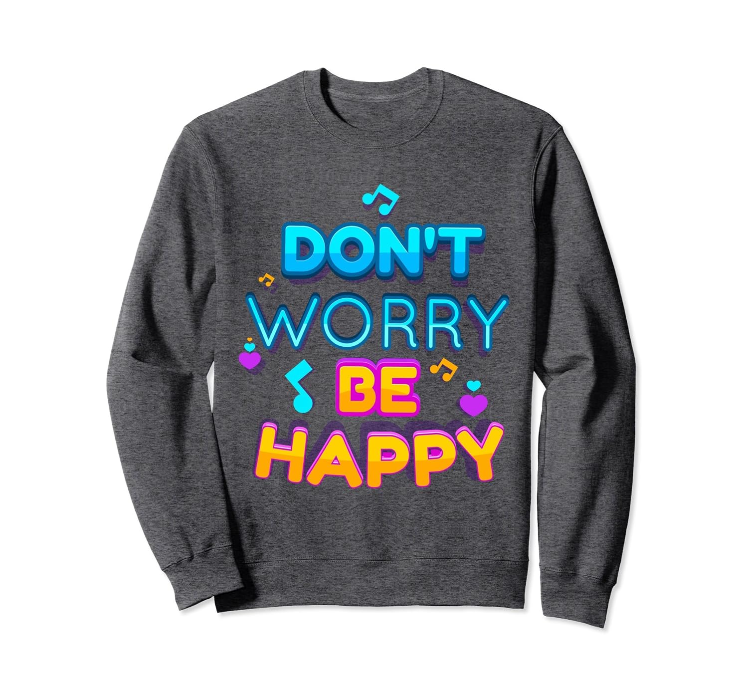 Solid colors: 80% Cotton, 20% Polyester; Heather Grey: 78% Cotton, 22% Poly; Dark Heather: 50% Cotton, 50% Polyester; Imported; Machine wash cold with like colors, dry low heat; Dont worry be happy inspirational quote cute sweatshirt; Sweet sweat shirt with musical notes, hearts and a motivational quote; 8.5 oz, Classic fit, Twill-taped neck