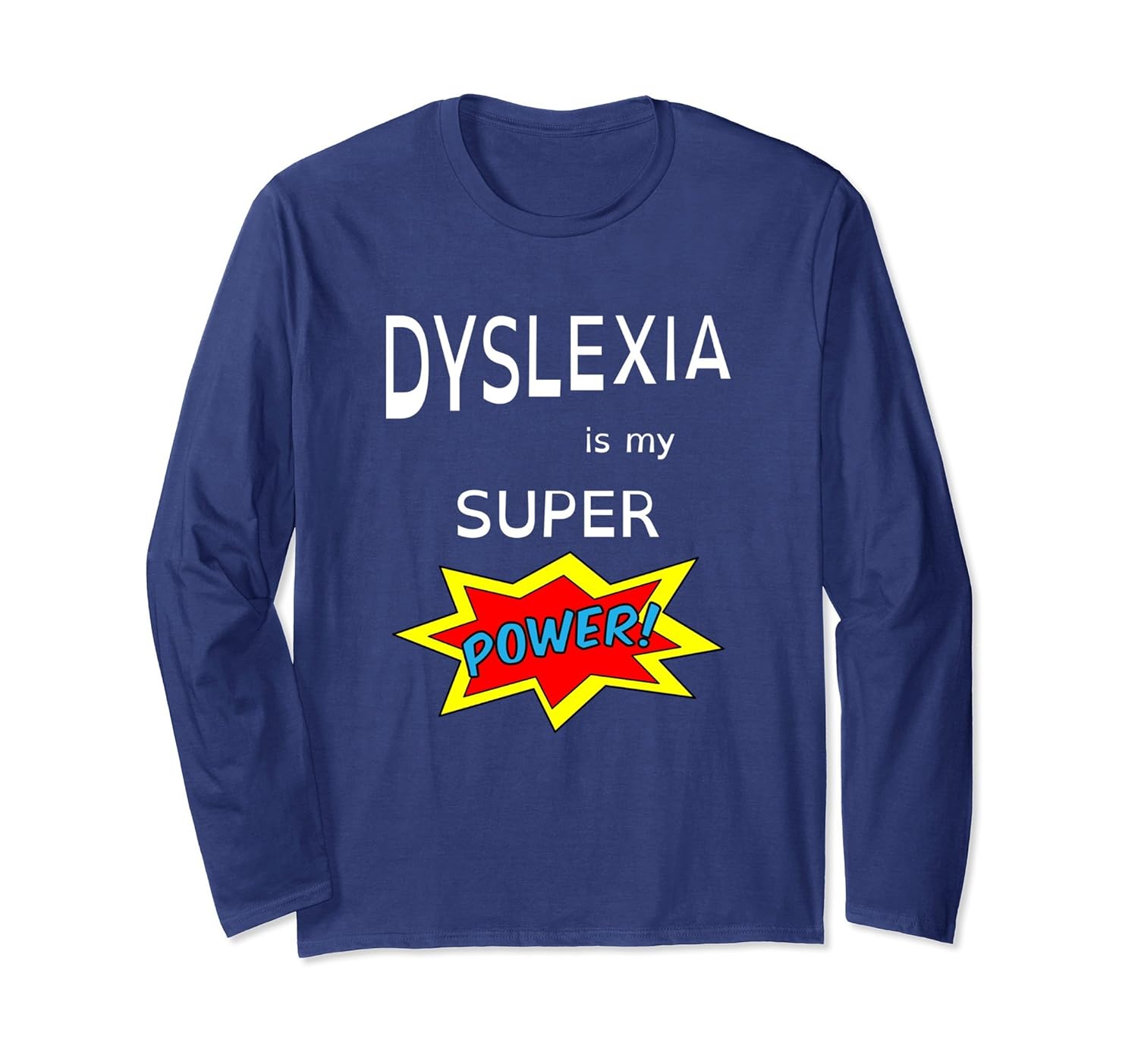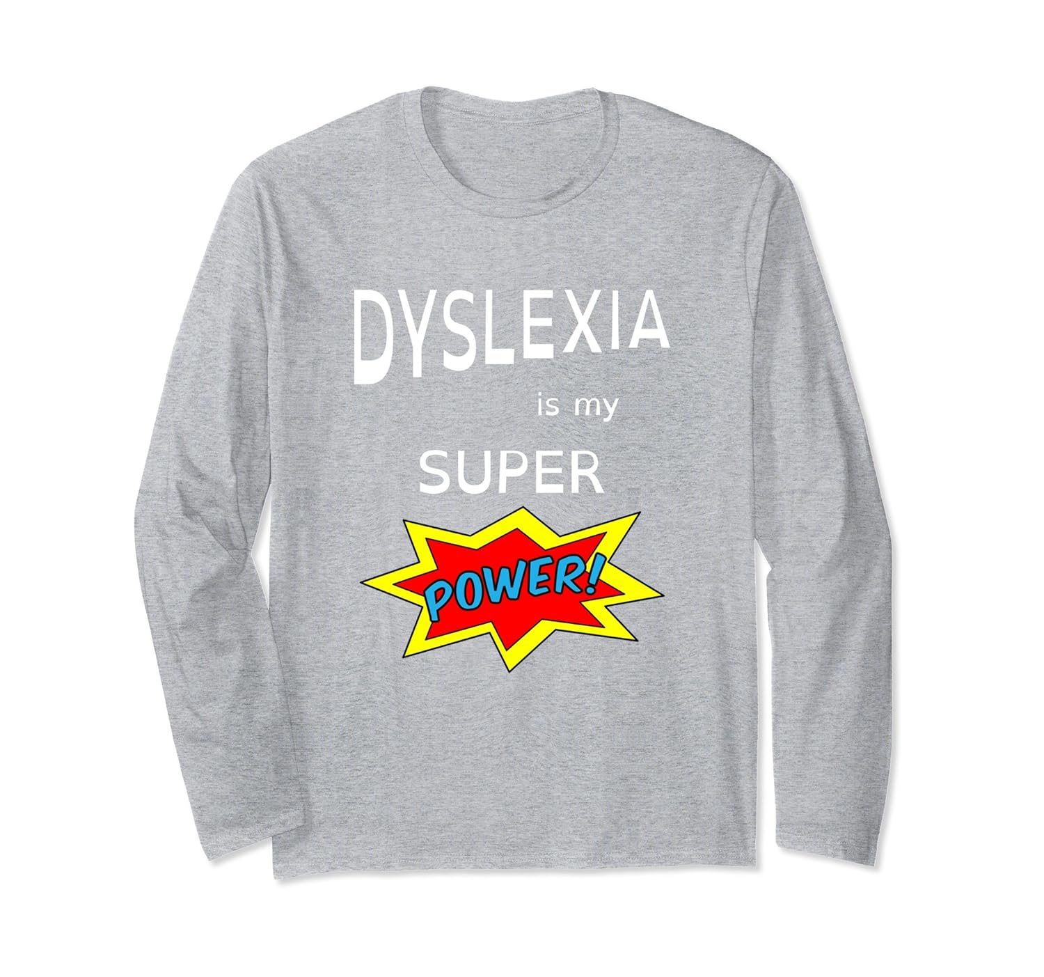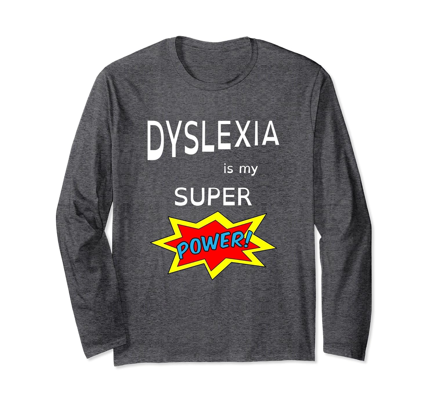 Solid colors: 100% Cotton; Heather Grey: 90% Cotton, 10% Polyester; All Other Heathers: 50% Cotton, 50% Polyester; Imported; Machine wash cold with like colors, dry low heat; If you are dyslexic or you have friends or family with dyslexia this long sleeve shirt is a great choice. The t-shirt includes a dyslexia font that helps dyslexics who have trouble reading other fonts.; October is National Dyslexia Month but wear this Dyslexia is my Super Power shirt whenever your feeling your super power.; Lightweight, Classic fit, Double-needle sleeve and bottom hem