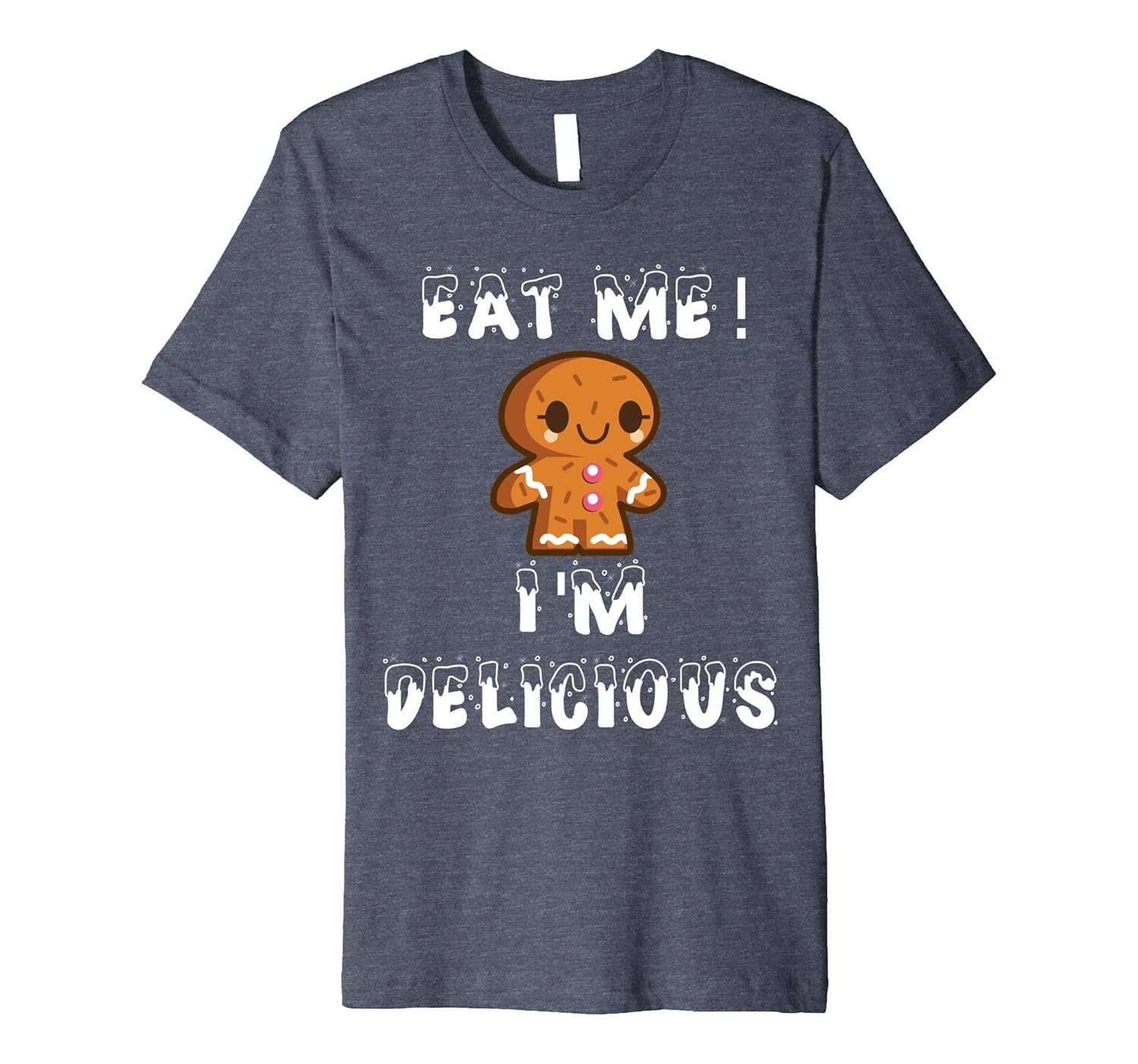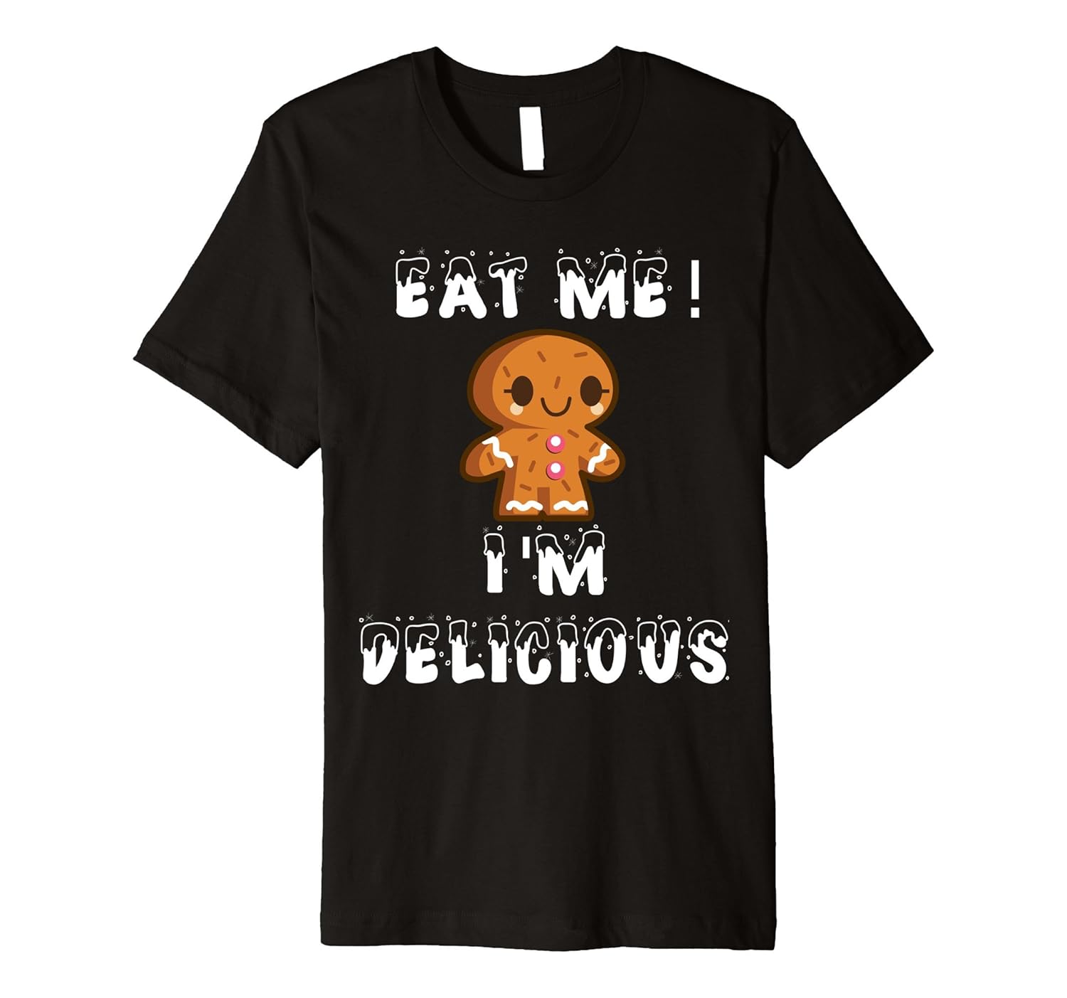 Solid colors: 100% Cotton; Heather Grey: 90% Cotton, 10% Polyester; All Other Heathers: 58% Cotton, 42% Polyester; Imported; Machine wash cold with like colors, dry low heat; Unique gift idea for women, girlfriend, wife, sister, aunt, mom, mother, grandma. Features a yummy gingerbread man next to font that invokes the Christmas spirit. Make him smile with this funny eat me shirt for her. Perfect for a Christmas wedding party.; Fit: Slim (consider ordering a larger size for a looser fit); Eat Me Tee with a gingerbread man. Fun adult humor innuendo tee for women. Sarcastic and hilarious Christmas shirt for her. Great gift for your girl friends or for a Christmas bar crawl event. Great ice breaker. Show you know how to have a good time; This premium t-shirt is made of lightweight fine jersey fabric