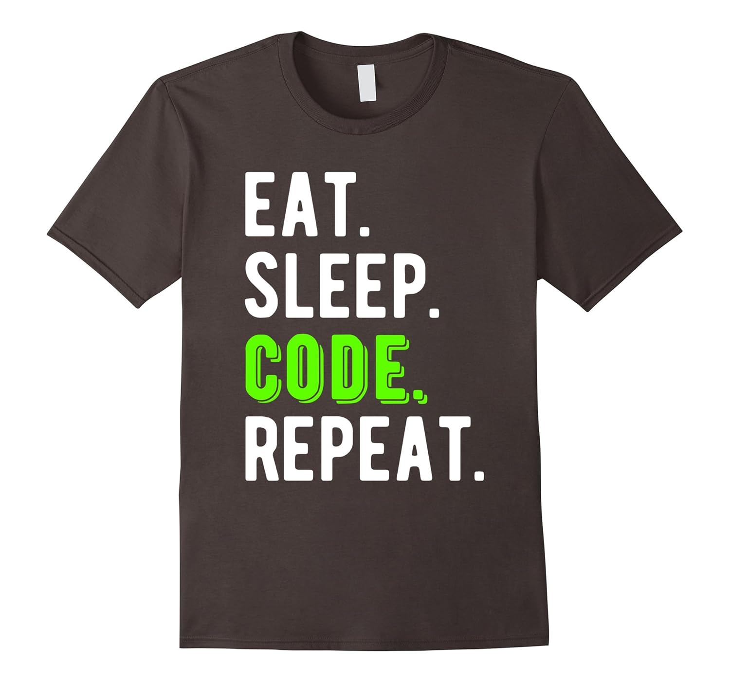 Solid colors: 100% Cotton; Heather Grey: 90% Cotton, 10% Polyester; All Other Heathers: 65% Cotton, 35% Polyester; Imported; Machine wash cold with like colors, dry low heat; eat sleep code repeat code coding coder programming computer geek nerd developer software engineer; quote textual slogan saying cool gift ideas joke funny humor sarcastic; Lightweight, Classic fit, Double-needle sleeve and bottom hem