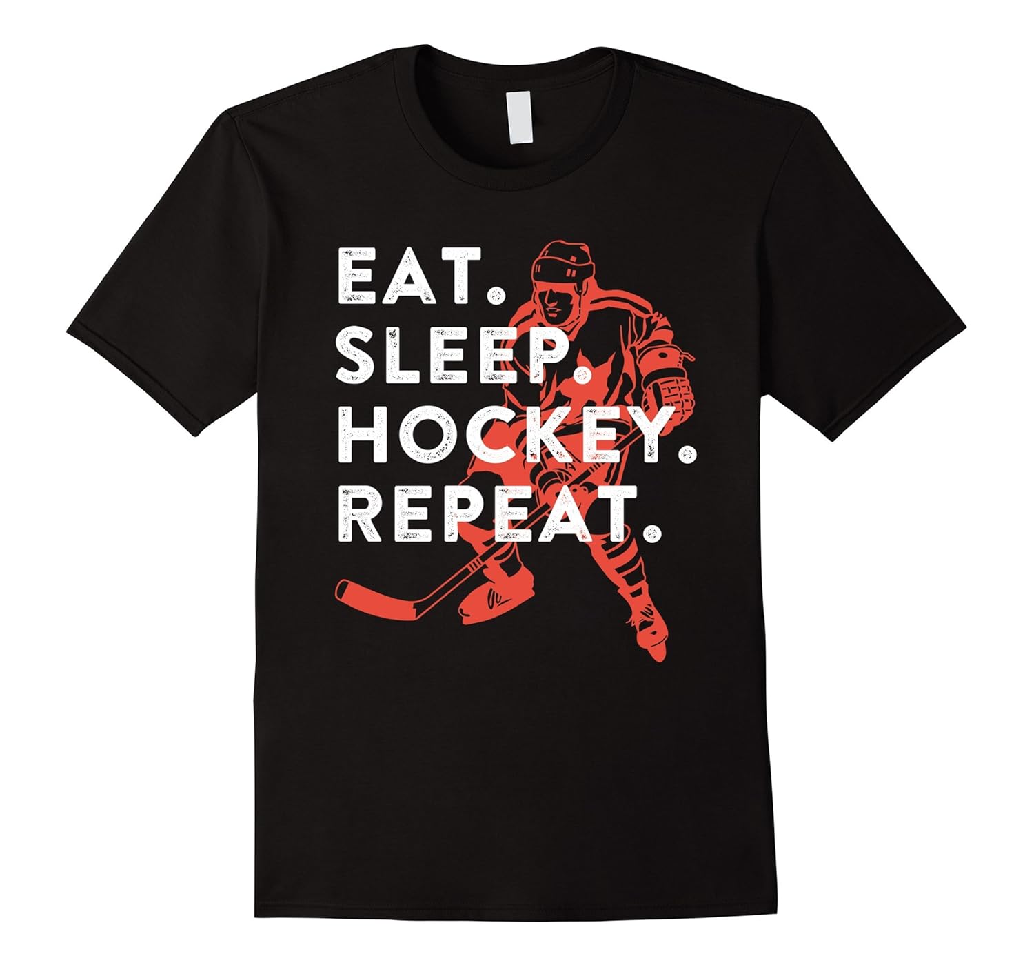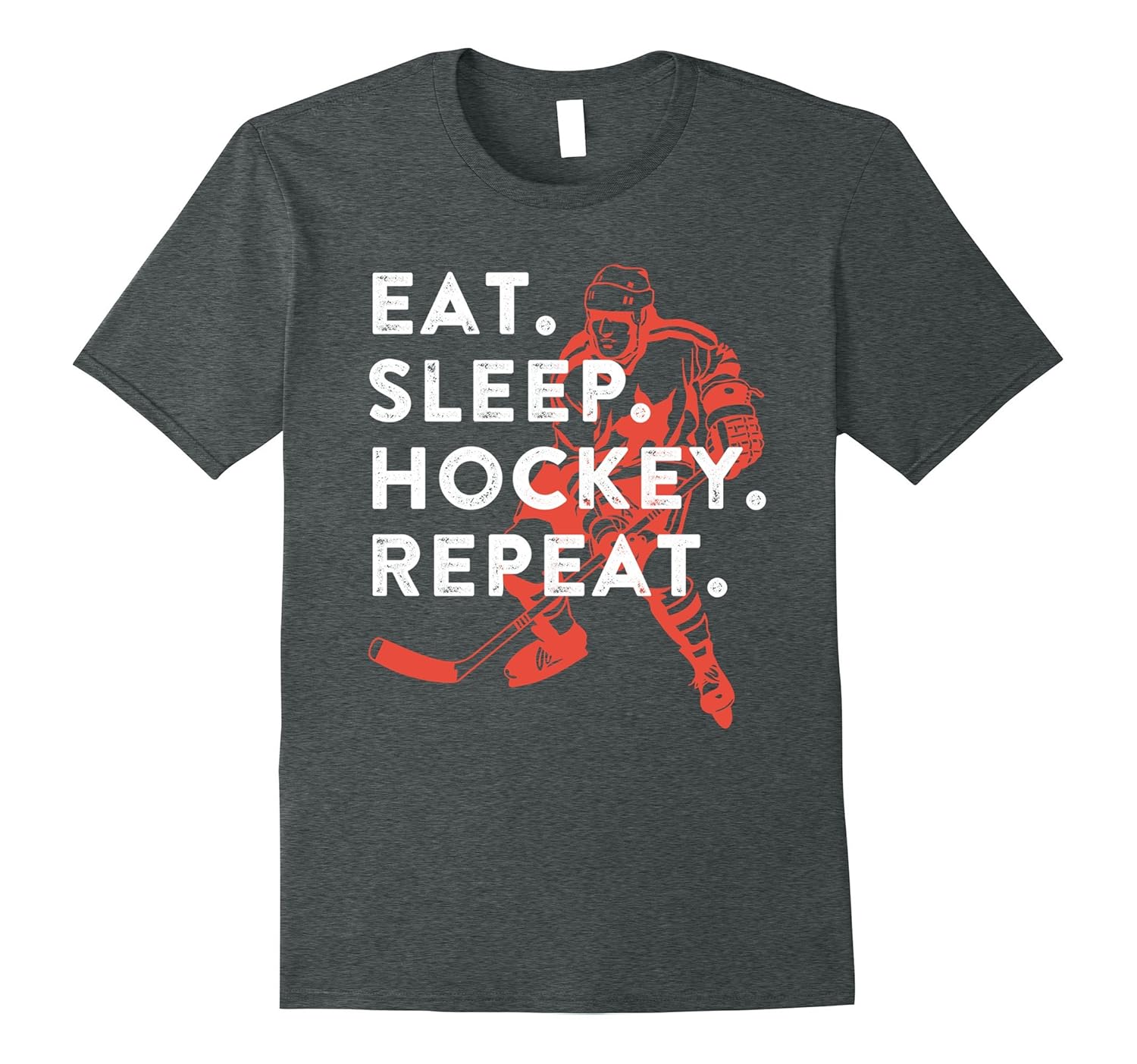 Solid colors: 100% Cotton; Heather Grey: 90% Cotton, 10% Polyester; All Other Heathers: 65% Cotton, 35% Polyester, Imported, Machine wash cold with like colors, dry low heat, Hockey T-Shirt – Eat Sleep Hockey Repeat, Whether you play in a little league, college, professional or anything in between, wear this shirt to your training, to a game or just to show everyone that hockey is life, Lightweight, Classic fit, Double-needle sleeve and bottom hem