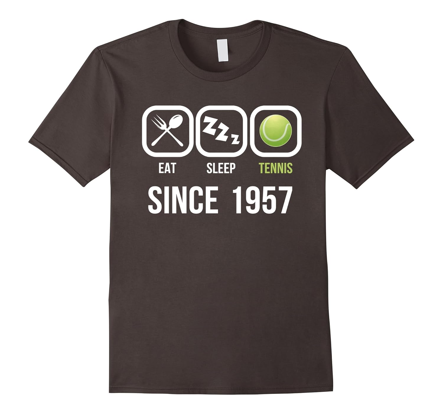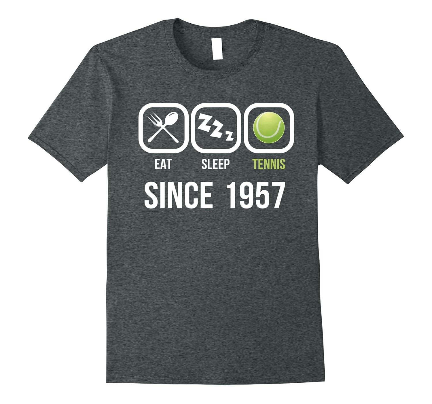 Solid colors: 100% Cotton; Heather Grey: 90% Cotton, 10% Polyester; All Other Heathers: 65% Cotton, 35% Polyester, Imported, Machine wash cold with like colors, dry low heat, Perfect Birthday Gift for people who are born in 1957 and loves Tennis. Eat Sleep Tennis. Tennis Ball Graphic Tee Shirt for Aged 60 years old bday. This shirt is great for people who eat, breathe and live for Tennis, Premium Quality shirt looks great in five amazing color of your choices and also available different sizes for men women, him her mom dad, ladies girls boys teens, grandma and grandpa. Lightweight, Classic fit, Double-needle sleeve and bottom hem