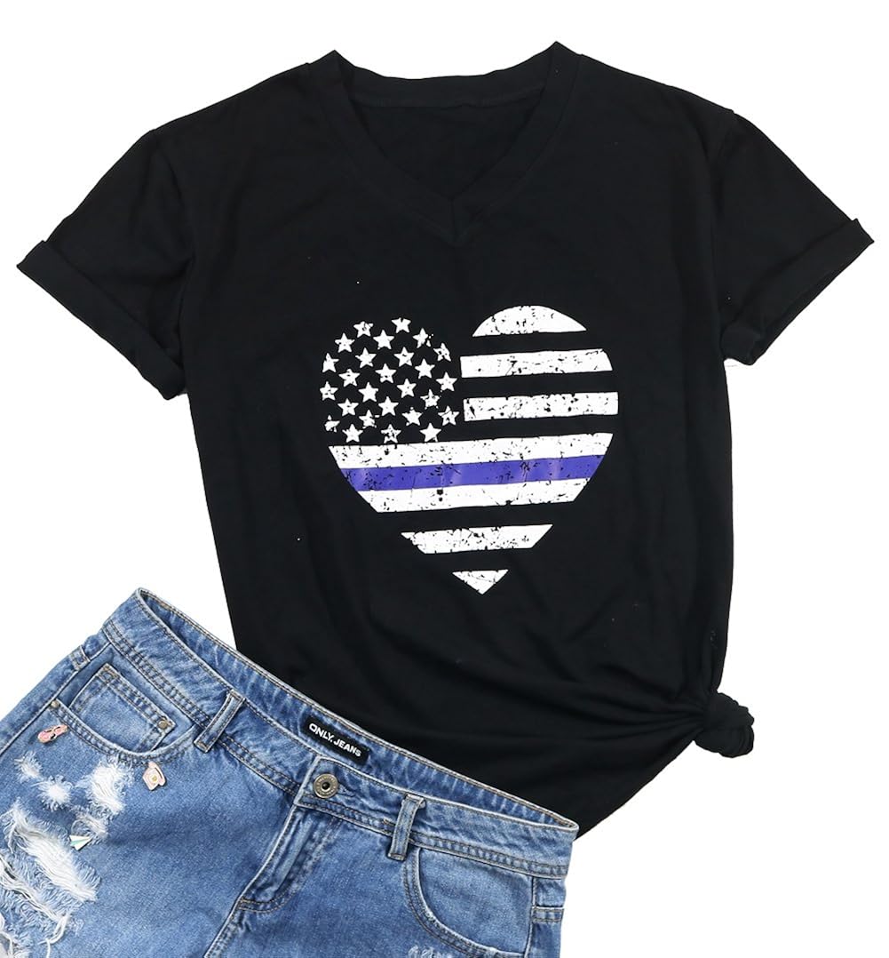 Material: Cotton Blend; Style: Heart Shaped American Flag Shirt,V-Neck,Print American Flag; Buy This Shirt For Yourself or Gift It To A Friend,Makes A Great Gift For Your Mom,Sister,Daughter,Aunt,or Your Best Friend; Perfect for Casual Sports Holiday or Work Wear,Good Choice To Match With Your Favorite Skinny Jeans or Shorts; Included: 1* Women American Flag Print V Neck Tops Shirt