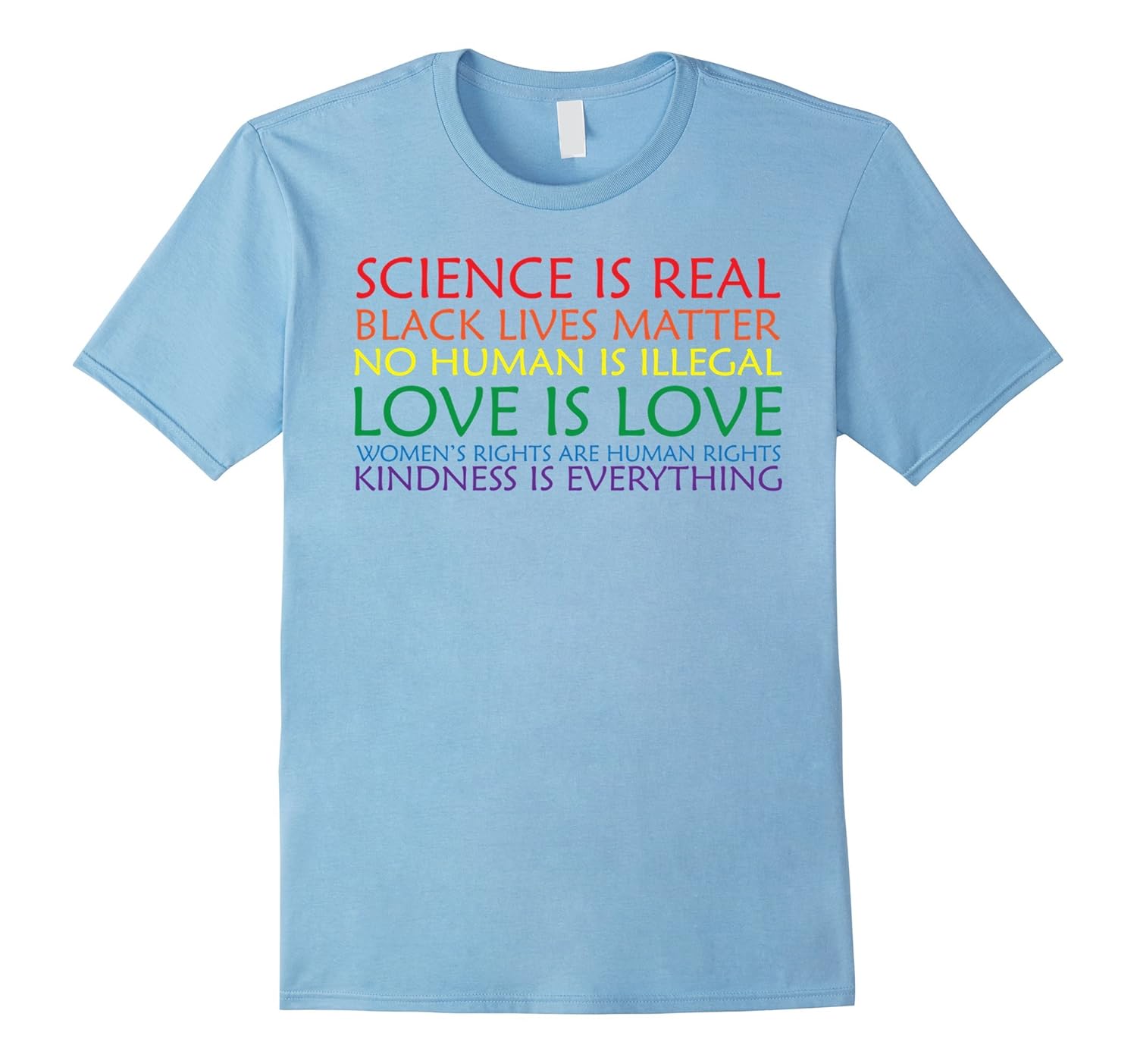 Solid colors: 100% Cotton; Heather Grey: 90% Cotton, 10% Polyester; All Other Heathers: 65% Cotton, 35% Polyester, Imported, Machine wash cold with like colors, dry low heat, Science is real, black lives matter, no human is illegal, love is love, women”s rights are human rights, kindness is everything. The inspirational quote on this tshirt should promote equality, acceptance among human beings. No matter whether you are gay, lesbian, feminist, bisexual or trasgender, LGBT activist, show your pride and support the cause with this message. Get it for your friends or loved ones. Fits both men and women. Wear it on Halloween, Christmas or birthdays. Lightweight, Classic fit, Double-needle sleeve and bottom hem