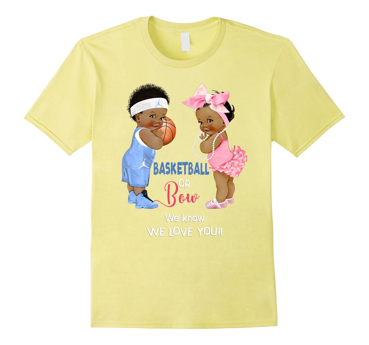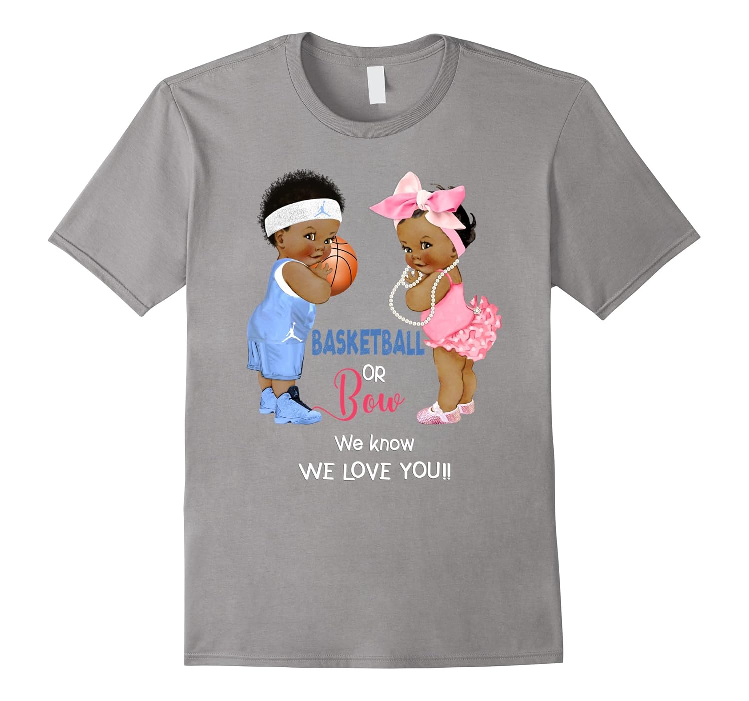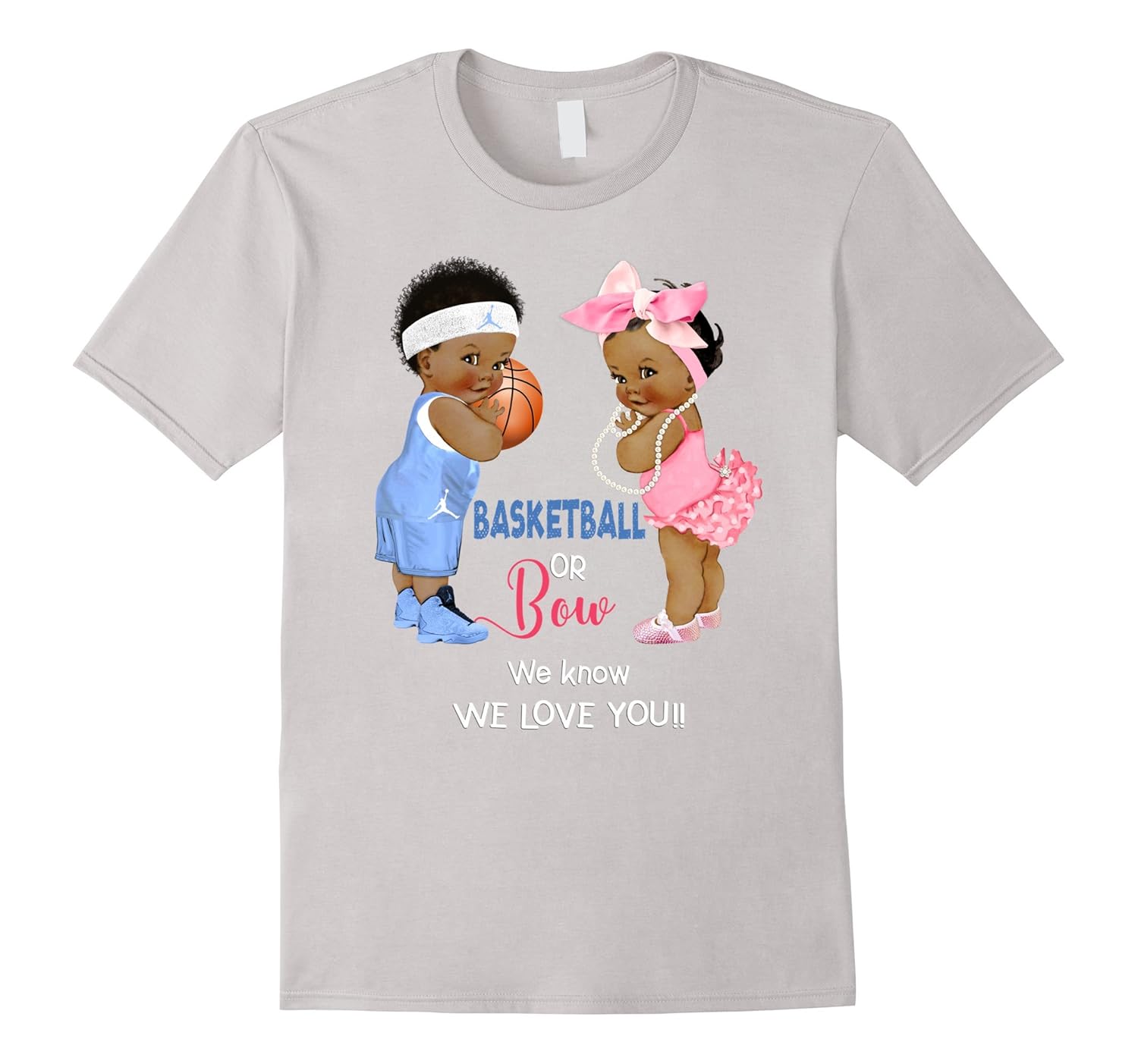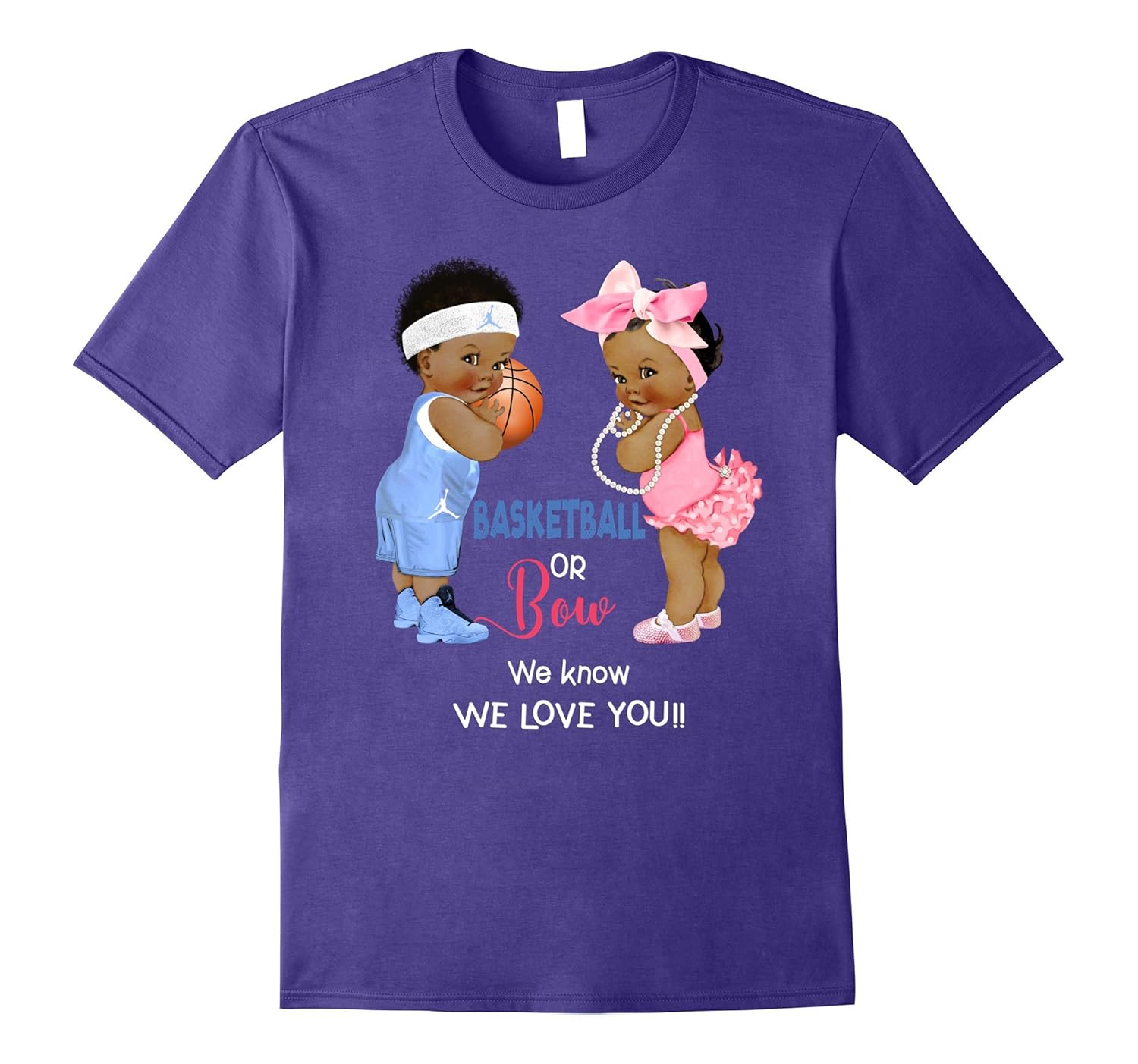 Solid colors: 100% Cotton; Heather Grey: 90% Cotton, 10% Polyester; All Other Heathers: 50% Cotton, 50% Polyester; Imported; Machine wash cold with like colors, dry low heat; Fun tee to wear to an African American Basketball or Bows theme gender reveal party baby shower. Pretty baby shower party favors for friends family guests. Cute gender reveal idea, baby shower gift item, baby shower party supplies.; Funny sports themed ethnic Basketball or Bow We Know We Love You vintage retro babies Basketball player team boy and Bows team girl shirt. Designed and printed to be fitted. For a more loose fit, please order a size up.; Lightweight, Classic fit, Double-needle sleeve and bottom hem