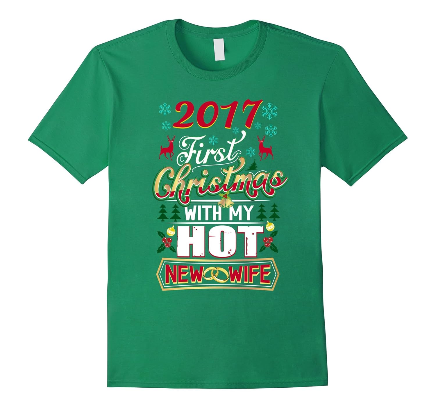 Solid colors: 100% Cotton; Heather Grey: 90% Cotton, 10% Polyester; All Other Heathers: 65% Cotton, 35% Polyester, Imported, Machine wash cold with like colors, dry low heat, A happy holiday celebration tee for newlywed couples that reads 2017 First Christmas WIth My Hot New Wife decorated in ugly sweater style with reindeers, snowflakes, ornaments, jingle bells and; mistletoe! A funny Mr. and; Mrs. outfit to wear this jolly season!, Makes a fun Christmas present, just married wedding anniversary or a beautiful birthday gift idea for your amazing partner to wear proud to parties and; family gatherings! Click on “Fun Newlyweds T Shirts” for matching designs with your lovely husband!, Lightweight, Classic fit, Double-needle sleeve and bottom hem