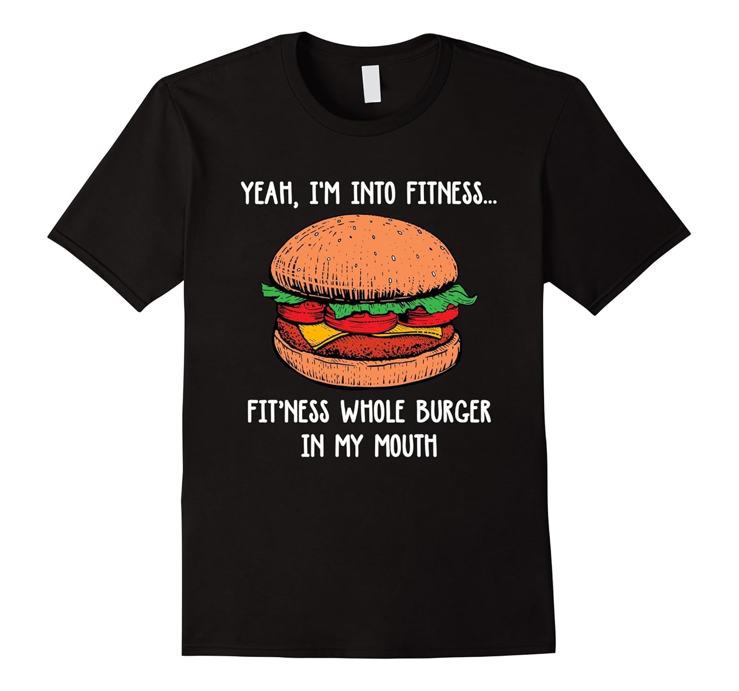 Solid colors: 100% Cotton; Heather Grey: 90% Cotton, 10% Polyester; All Other Heathers: 65% Cotton, 35% Polyester; Imported; Machine wash cold with like colors, dry low heat; perfect funny gift, present for man, woman, who love burger, meat, meatlover, carnivore, bbq, grilling and just cant get enough cheeseburger.; Yeah Im Into Fitness Fitness Fitting Whole Burger In My Mouth Shirt; Lightweight, Classic fit, Double-needle sleeve and bottom hem