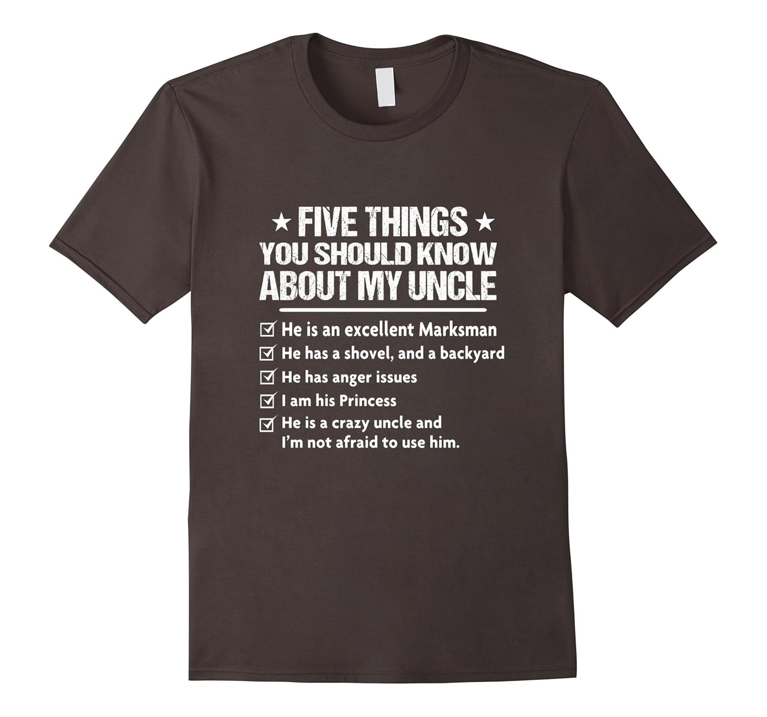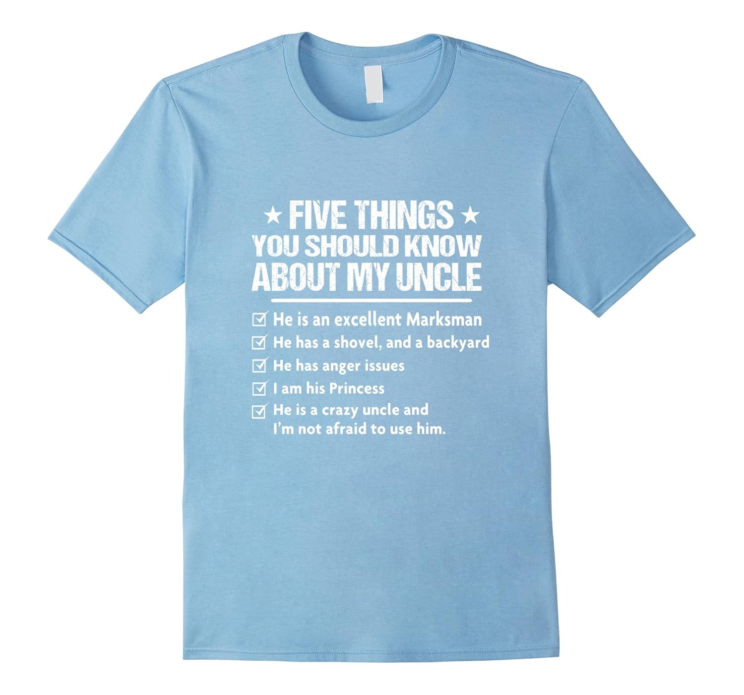Solid colors: 100% Cotton; Heather Grey: 90% Cotton, 10% Polyester; All Other Heathers: 65% Cotton, 35% Polyester, Imported, Machine wash cold with like colors, dry low heat, 5 Things You should Know About My Uncle Shirt, Lightweight, Classic fit, Double-needle sleeve and bottom hem