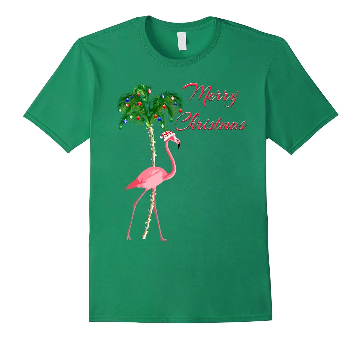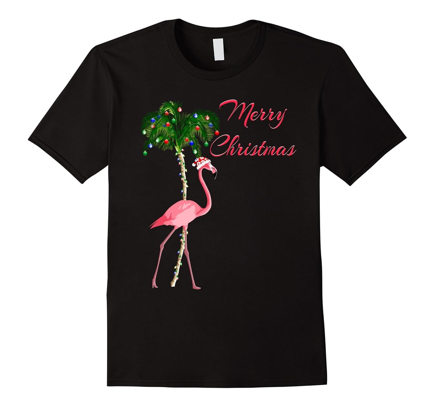 Solid colors: 100% Cotton; Heather Grey: 90% Cotton, 10% Polyester; All Other Heathers: 65% Cotton, 35% Polyester; Imported; Machine wash cold with like colors, dry low heat; This is the perfect shirt for anyone celebrating the Christmas holidays in a warm weather state like Hawaii, California, or Florida. This Xmas tee features a funny Flamingo wearing a Santa hat in front of a Christmas decorated palm tree.; If you having a tropical Christmas this winter then you will love this funny Christmas Flamingo tshirt. If you dream of the beach during Christmas then this holiday tshirt will keep you in a tropical mood. Merry Christmas!; Lightweight, Classic fit, Double-needle sleeve and bottom hem