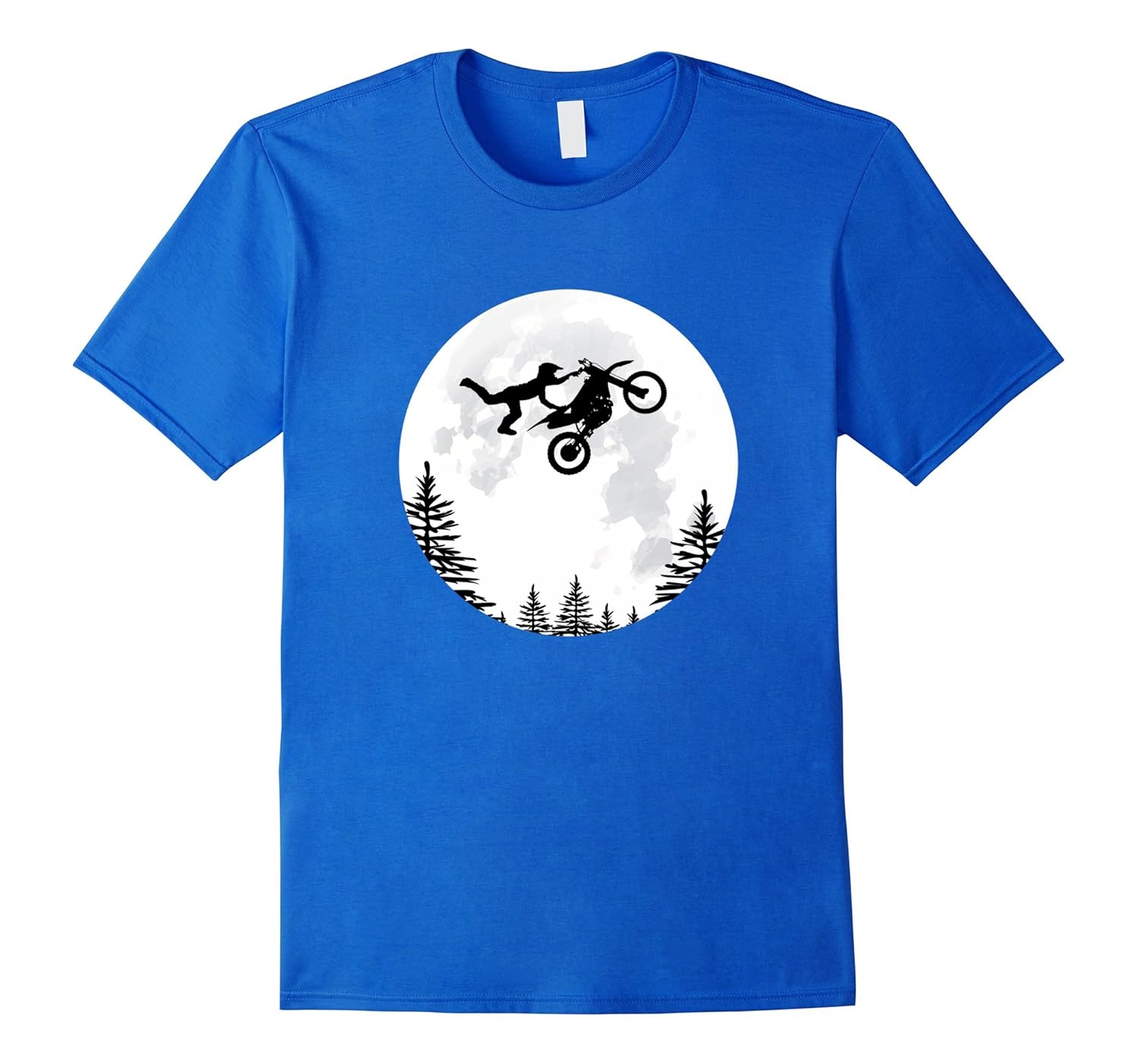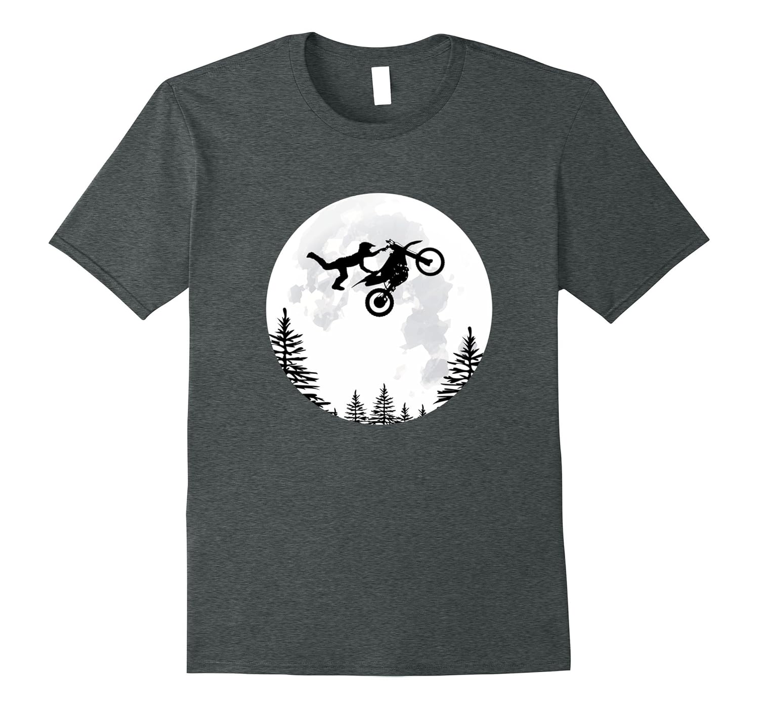 Solid colors: 100% Cotton; Heather Grey: 90% Cotton, 10% Polyester; All Other Heathers: 65% Cotton, 35% Polyester, Imported, Machine wash cold with like colors, dry low heat, T-shirt featuring a boy, girl or dad doing a big trick on a motorbike jumping in the air over the trees and moon. Great funny tee shirt is best for kids and adults boys and girls, Your grandson or granddaughter will love this funny shirt parody of the iconic flying bicycle scene from a famous movie, Lightweight, Classic fit, Double-needle sleeve and bottom hem