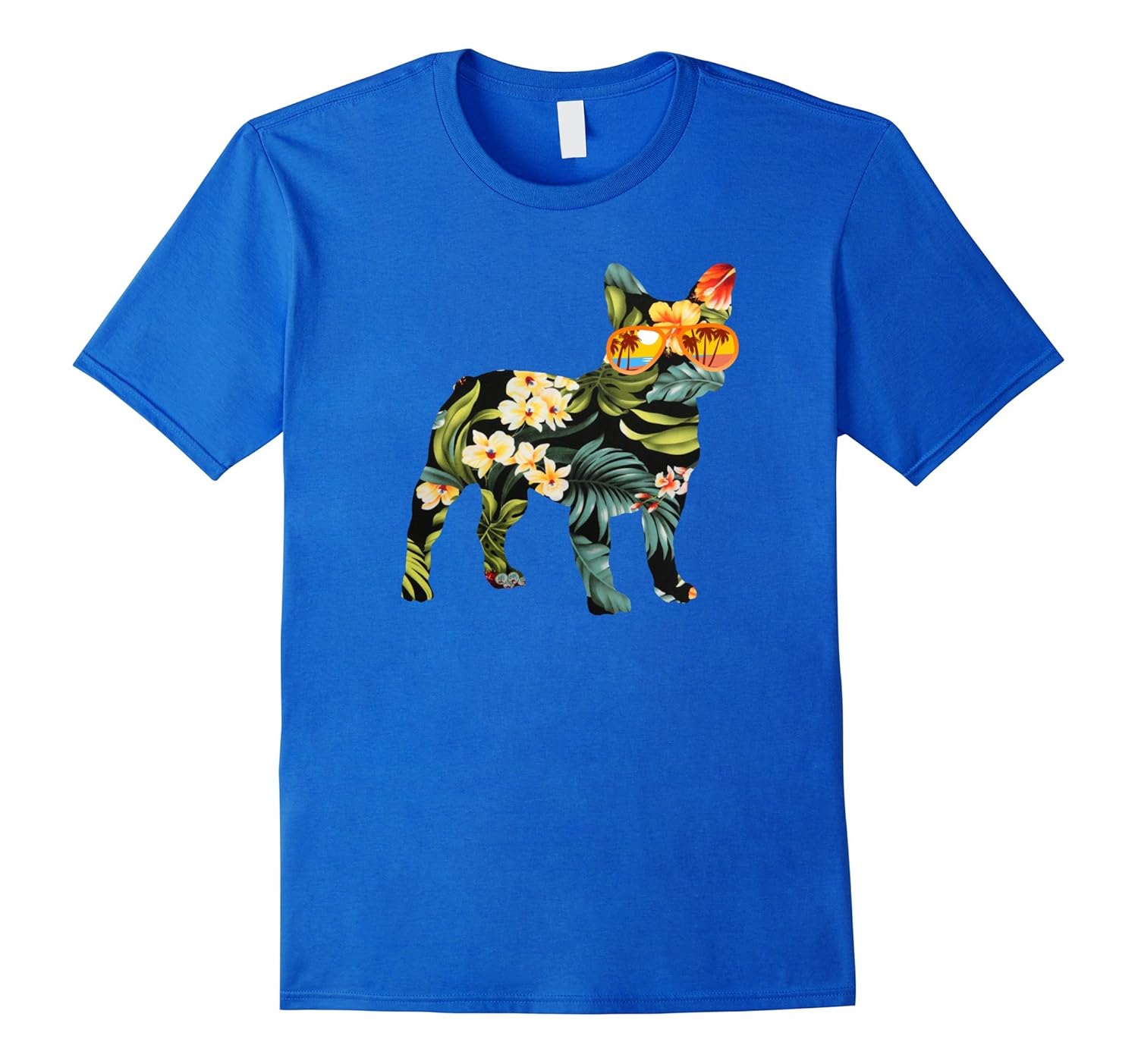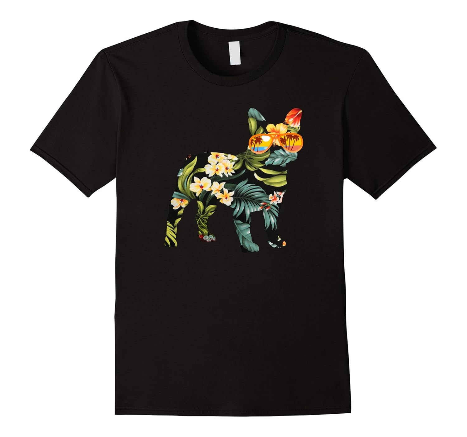 Solid colors: 100% Cotton; Heather Grey: 90% Cotton, 10% Polyester; All Other Heathers: 65% Cotton, 35% Polyester; Imported; Machine wash cold with like colors, dry low heat; Vintage Hawaiian French Bulldog Frenchie T-Shirt with Beach Sunglasses.; Super cool top selling Floral graphic shirt featuring a French Bulldog / Frenchie in a Vintage Hawaiian silhouette.; Lightweight, Classic fit, Double-needle sleeve and bottom hem
