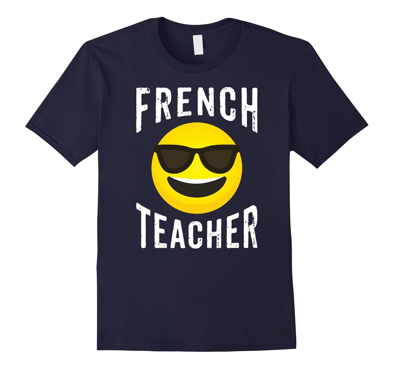 Solid colors: 100% Cotton; Heather Grey: 90% Cotton, 10% Polyester; All Other Heathers: 65% Cotton, 35% Polyester, Imported, Machine wash cold with like colors, dry low heat, Show your pride in teaching French with this cool yellow smiley face shirt with sunglasses tee. French teachers work hard day in and day out helping students learn and grow. This distressed, novelty French teacher t-shirt will emphasize how cool they are. This sunglass emoji French teacher t-shirt is fitted. For a looser fit please order a size larger than typical. This emoticon smiley face French teacher tee shirt is a perfect birthday or Christmas gift for any French teacher. Lightweight, Classic fit, Double-needle sleeve and bottom hem