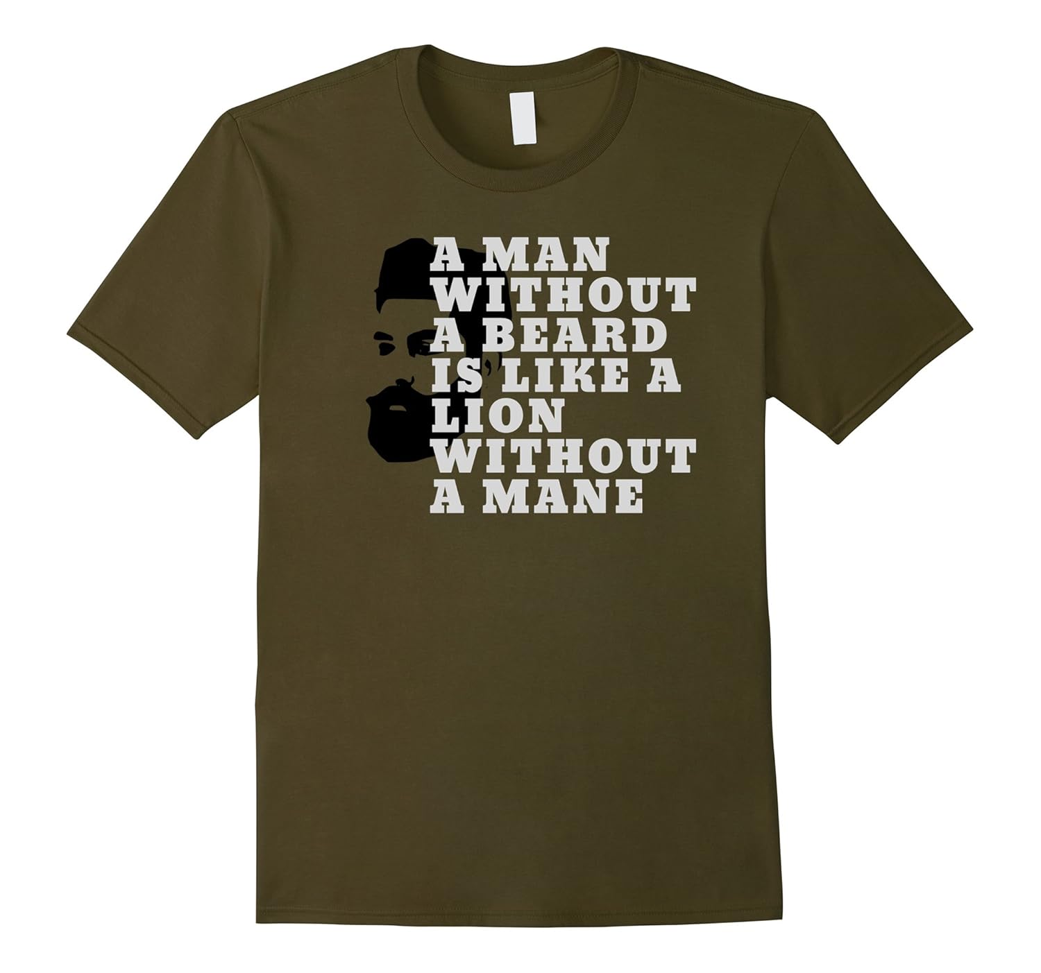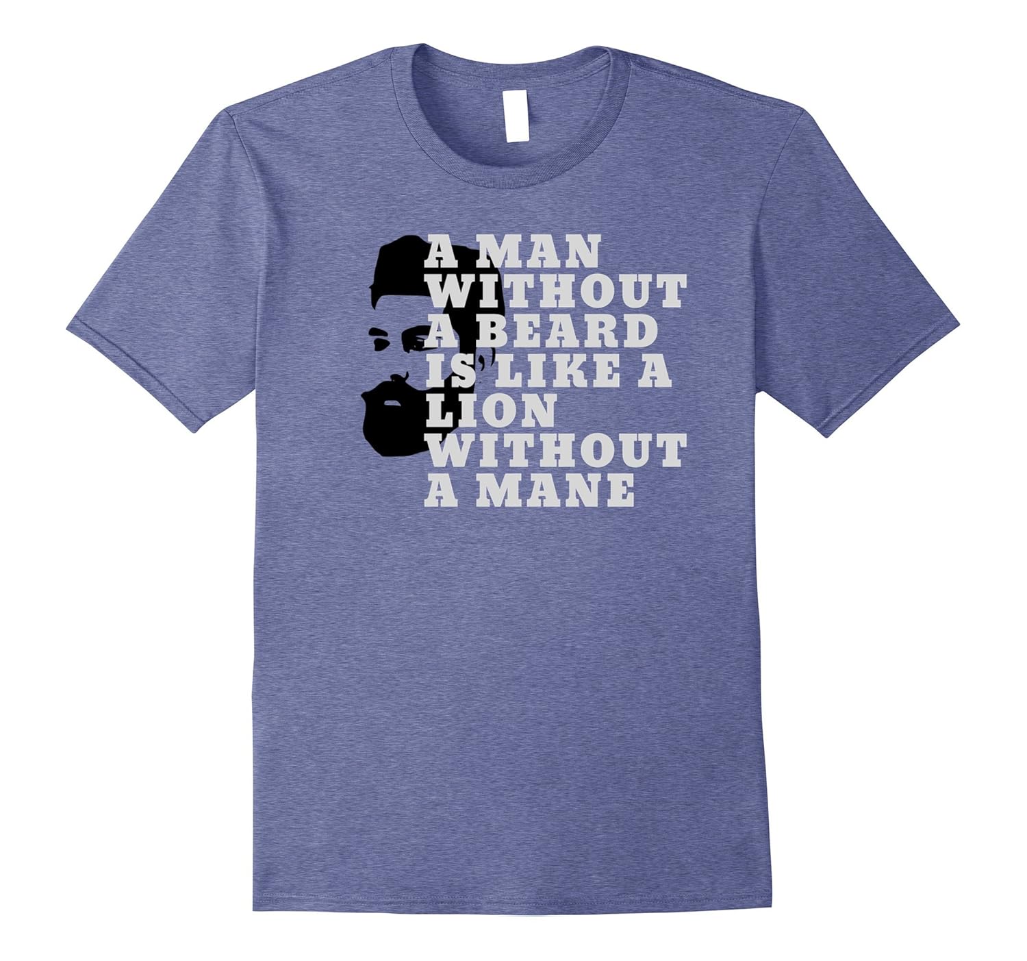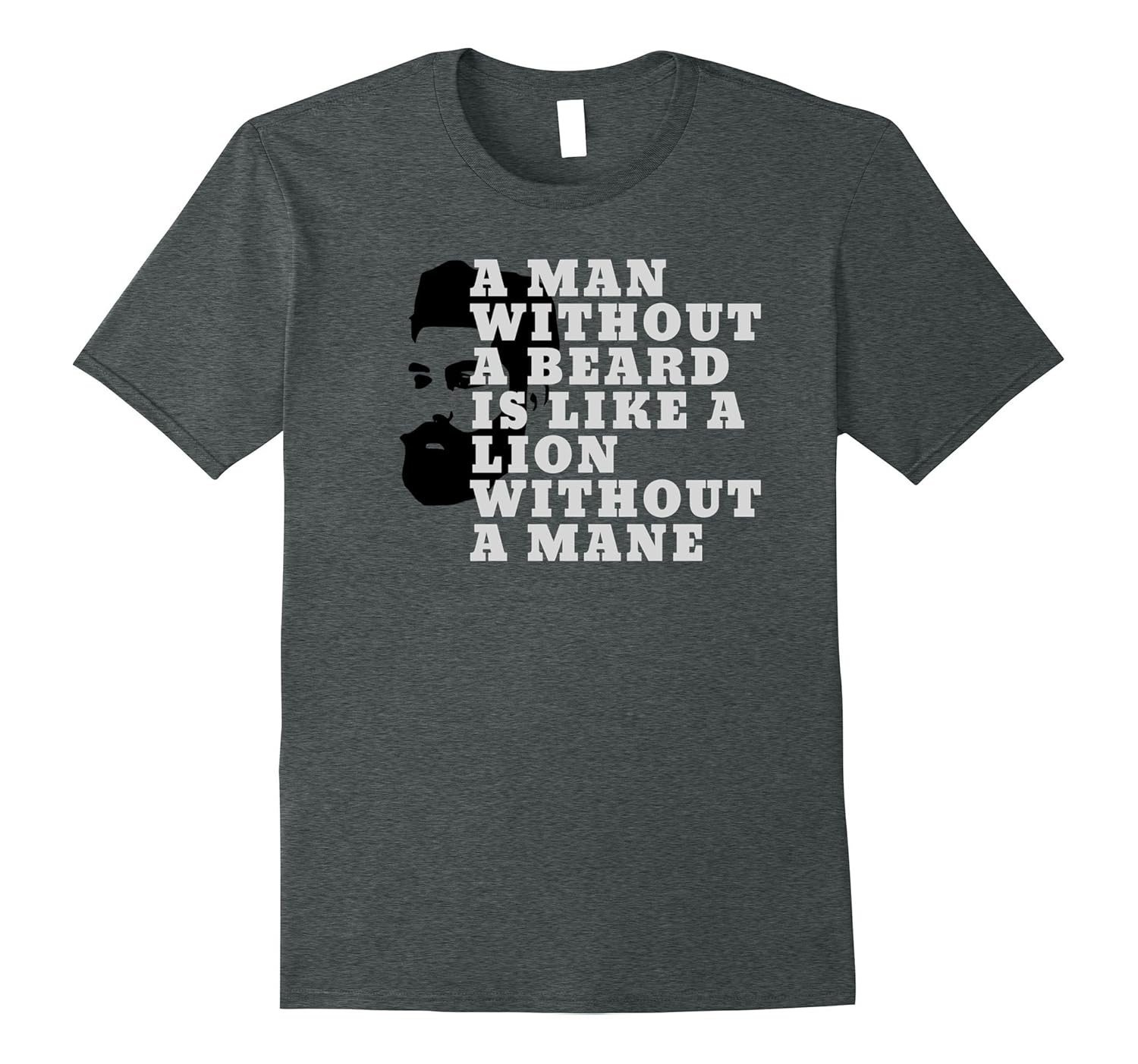 Solid colors: 100% Cotton; Heather Grey: 90% Cotton, 10% Polyester; All Other Heathers: 65% Cotton, 35% Polyester, Imported, Machine wash cold with like colors, dry low heat, Black and gray graphic featuring the image of a bearded man, Text reads “A Man Without a Beard is Like a Lion Without a Mane”, Lightweight, Classic fit, Double-needle sleeve and bottom hem