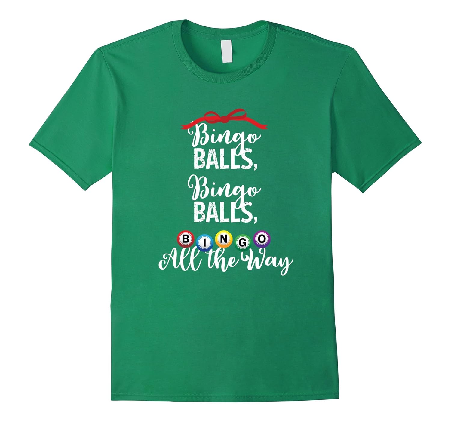 Solid colors: 100% Cotton; Heather Grey: 90% Cotton, 10% Polyester; All Other Heathers: 65% Cotton, 35% Polyester; Imported; Machine wash cold with like colors, dry low heat; Love to yell Bingo? T shirt features Christmas carol song: Bingo Balls, Bingo Balls, Bingo All The Way. Great shirt for bingo hall and funny gift for bingo queen, bingo grandma, bingo friend.; Grab your bingo cards, bingo markers and daubers and let the caller know you came to win with this Christmas holiday t-shirt.; Lightweight, Classic fit, Double-needle sleeve and bottom hem