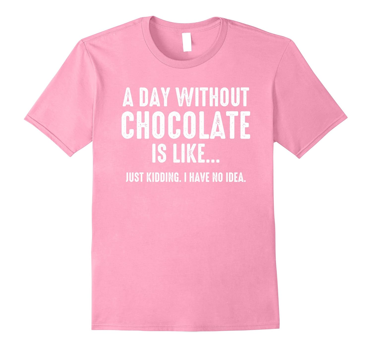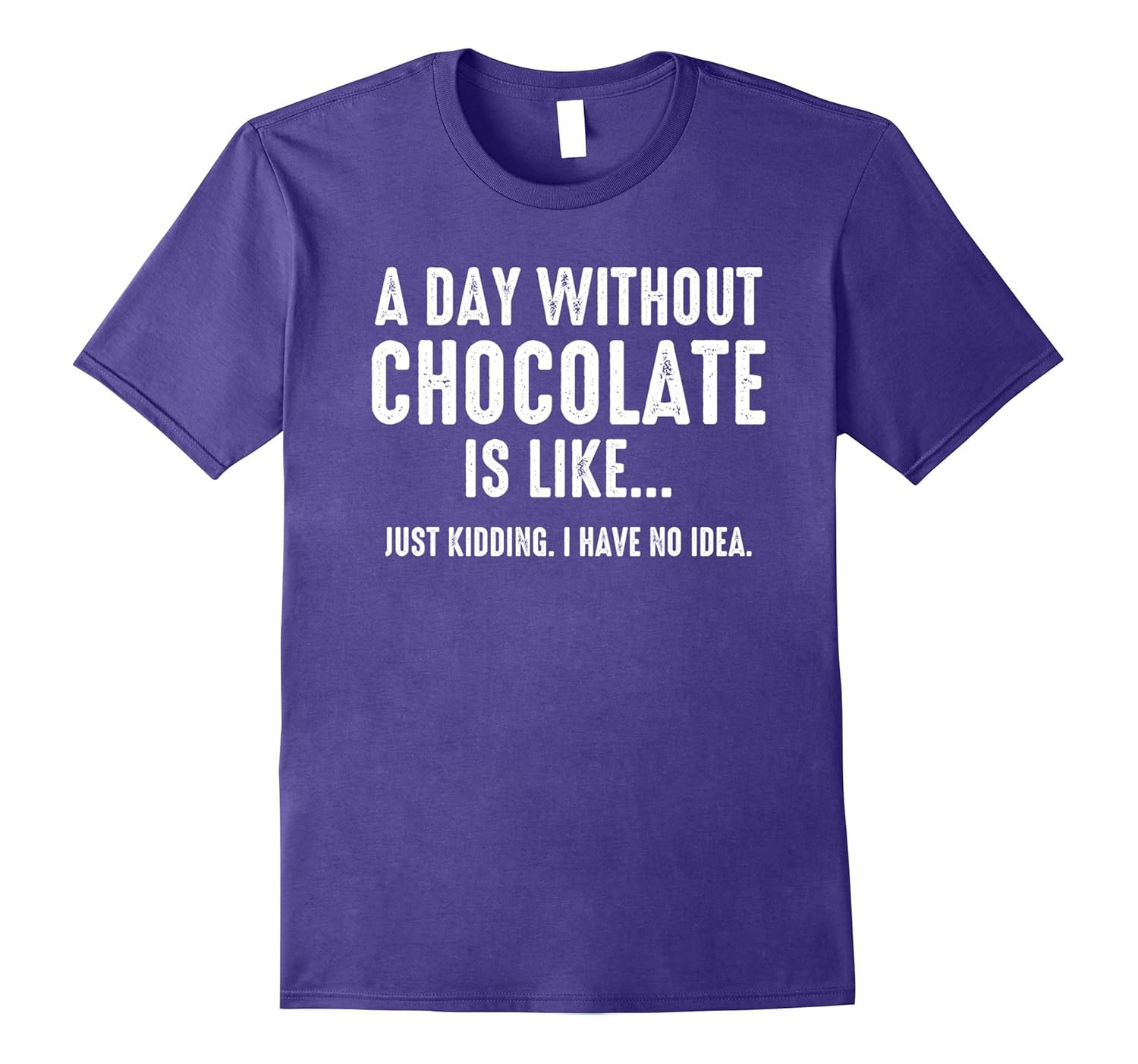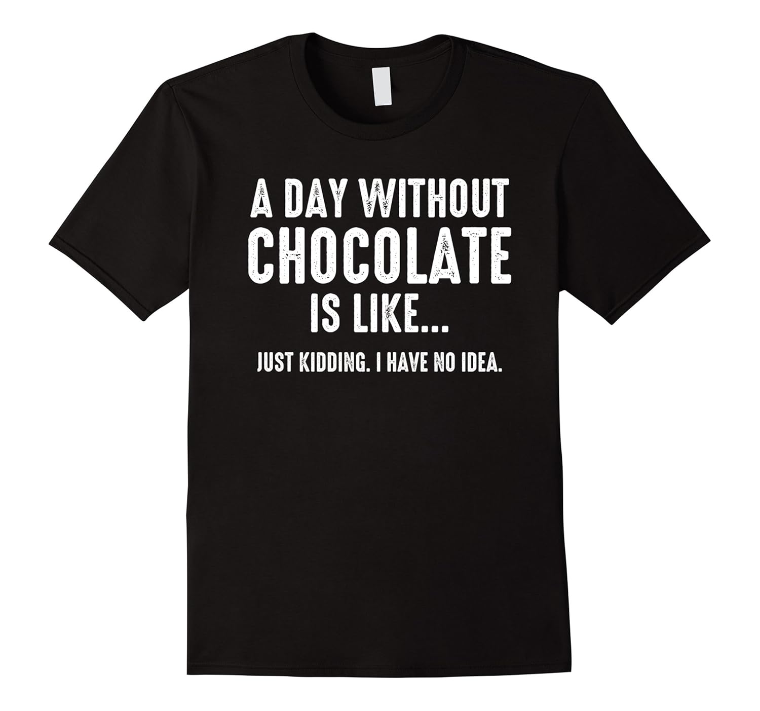 Solid colors: 100% Cotton; Heather Grey: 90% Cotton, 10% Polyester; All Other Heathers: 50% Cotton, 50% Polyester; Imported; Machine wash cold with like colors, dry low heat; Shirt with funny saying says A Day Without Chocolate Is Like… Just Kidding. I Have No Idea.; Gift tee for anyone who loves milk chocolate, dark chocolate, any kind of chocolate.; Lightweight, Classic fit, Double-needle sleeve and bottom hem