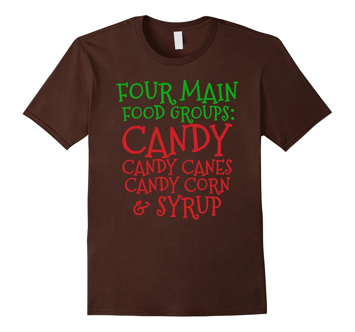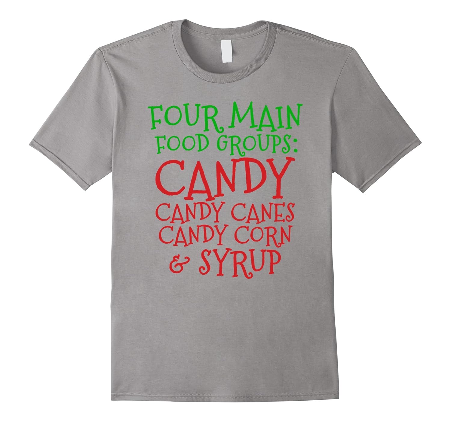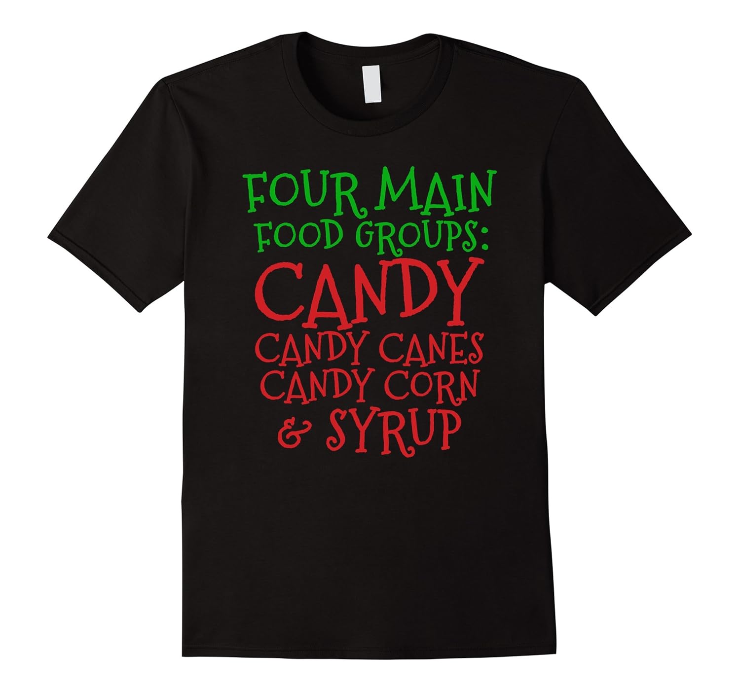 Solid colors: 100% Cotton; Heather Grey: 90% Cotton, 10% Polyester; All Other Heathers: 65% Cotton, 35% Polyester; Imported; Machine wash cold with like colors, dry low heat; Four Main Food Groups Christmas Elf T-Shirt. This hilarious Christmas elf shirt is perfect for the holiday season!; Candy, candy canes, candy corn, and syrup hilarious tshirt! Perfect for kids Christmas or adult Christmas parties!; Lightweight, Classic fit, Double-needle sleeve and bottom hem