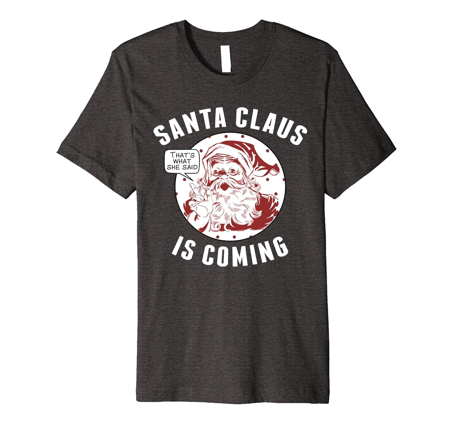 Solid colors: 100% Cotton; Heather Grey: 90% Cotton, 10% Polyester; All Other Heathers: 58% Cotton, 42% Polyester; Imported; Machine wash cold with like colors, dry low heat; Santa Claus is Coming, Thats What She Said. Funny Christmas T-Shirts for Holidays and Celebrations and the winter. Ugly Christmas Sweater Shirt.; Fit: Slim (consider ordering a larger size for a looser fit); Hilarious Christmas Shirt for parties and ugly sweater celebrations. Great xmas gift for mom and dad who enjoy Santa Claus tees. Great gag gift idea too!; This premium t-shirt is made of lightweight fine jersey fabric
