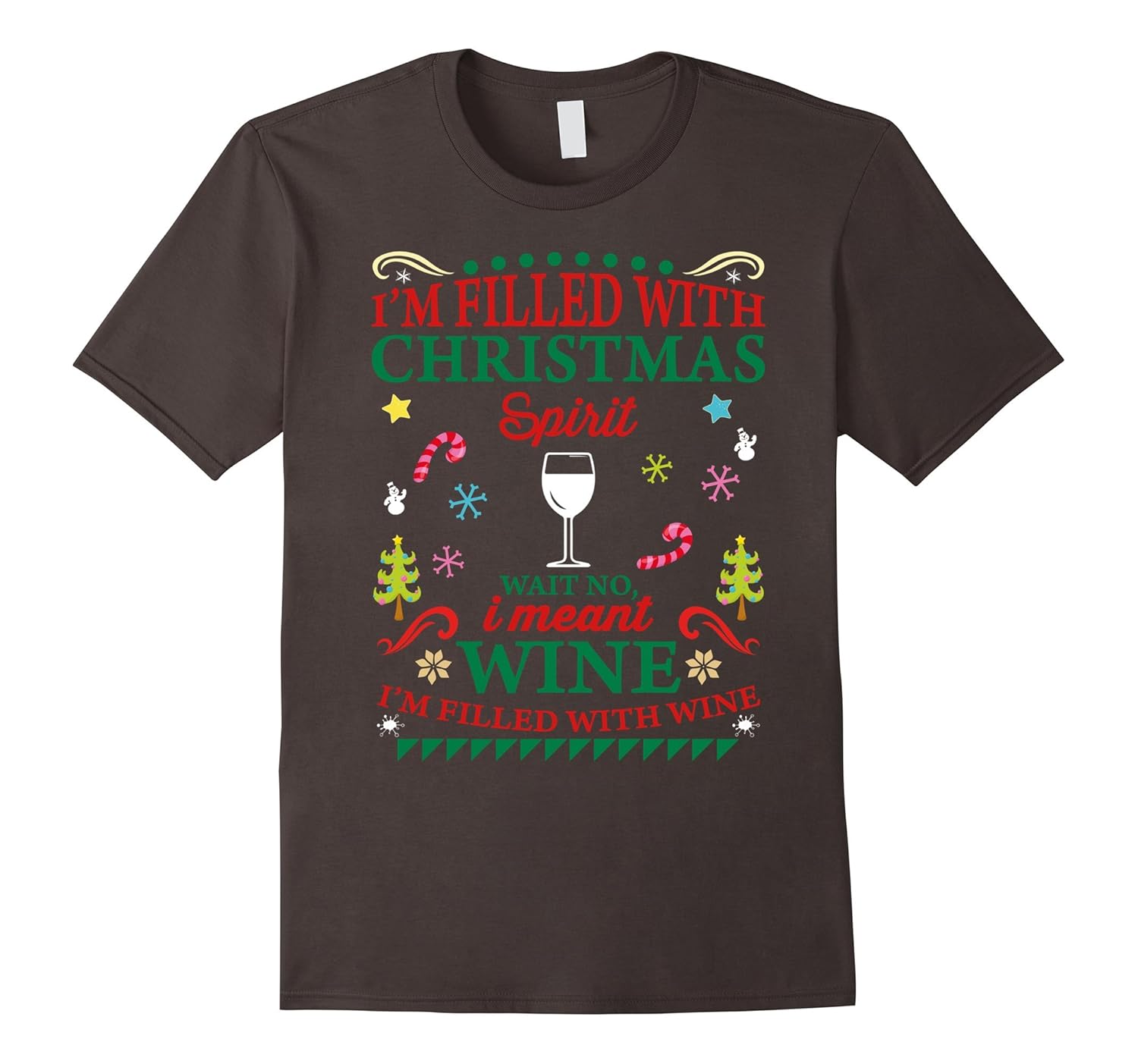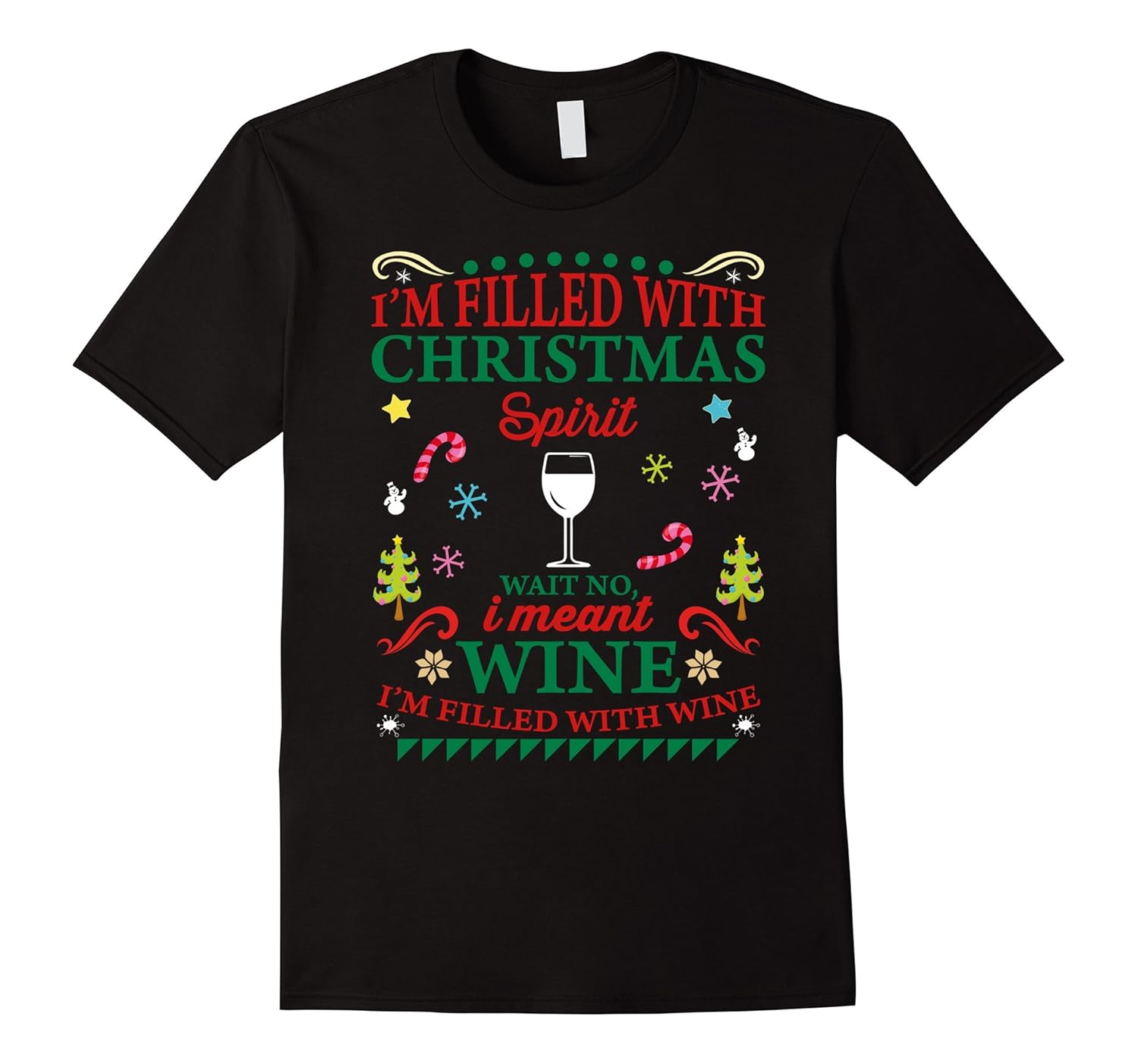 Solid colors: 100% Cotton; Heather Grey: 90% Cotton, 10% Polyester; All Other Heathers: 65% Cotton, 35% Polyester; Imported; Machine wash cold with like colors, dry low heat; Im Filled With Christmas Spirit Oh Wait I Meant Wine Im Filled With Wine.; This Funny Tee Shirt is perfect for Wine Lovers and Those Wanting to Share Their Xmas Spirit and would make a great gift idea for Birthday, Christmas, or any gift giving occasion. For a looser fit, please order a larger sized top.; Lightweight, Classic fit, Double-needle sleeve and bottom hem