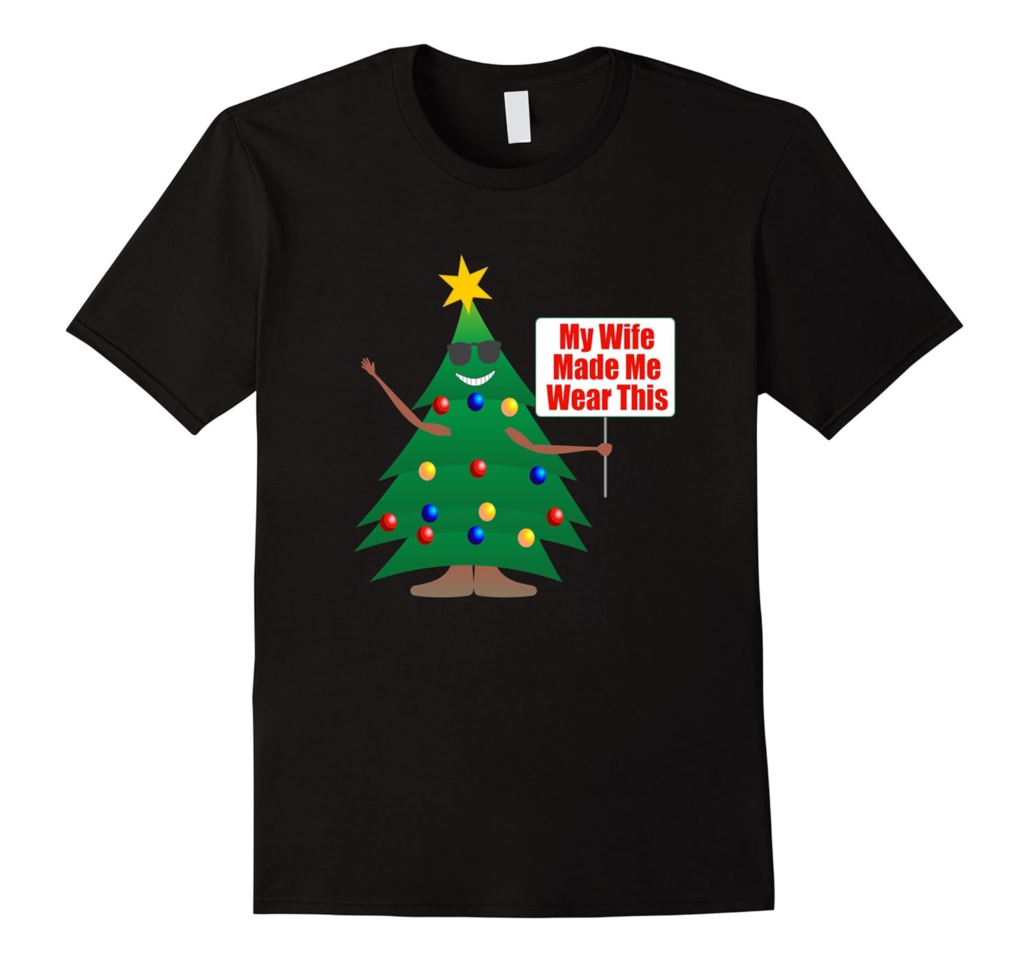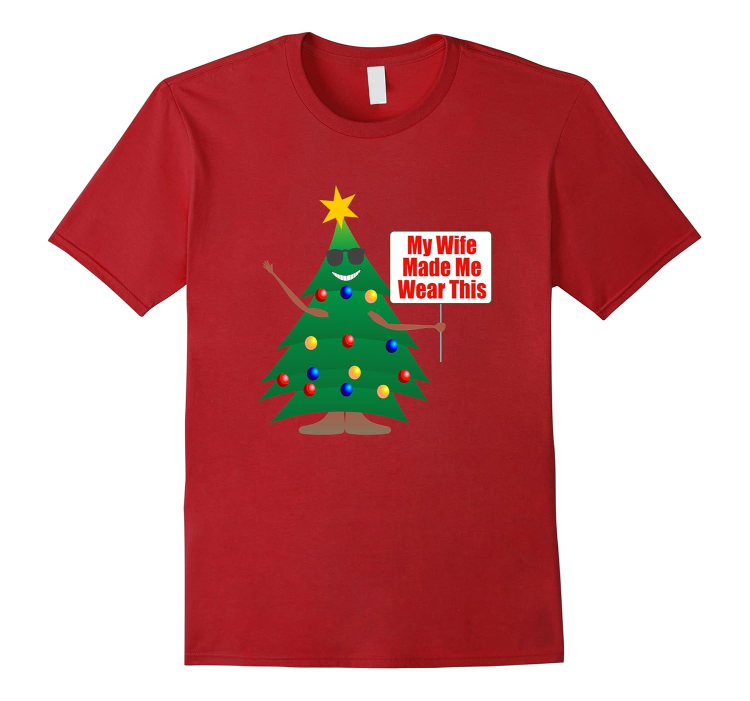 Solid colors: 100% Cotton; Heather Grey: 90% Cotton, 10% Polyester; All Other Heathers: 65% Cotton, 35% Polyester; Imported; Machine wash cold with like colors, dry low heat; Funny Xmas Tee Shirt My Wife Made Me Wear This.; This Tee Shirt is perfect for people who loves ugly Xmas sweaters and would make a great gift idea for any birthday, Christmas, graduation or gift giving occasion. For a looser fit, please order a larger sized top.; Lightweight, Classic fit, Double-needle sleeve and bottom hem