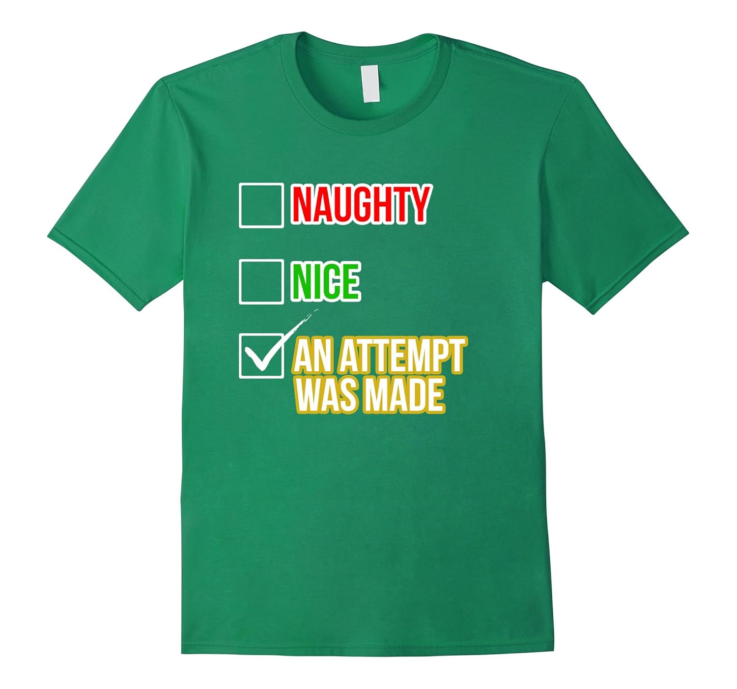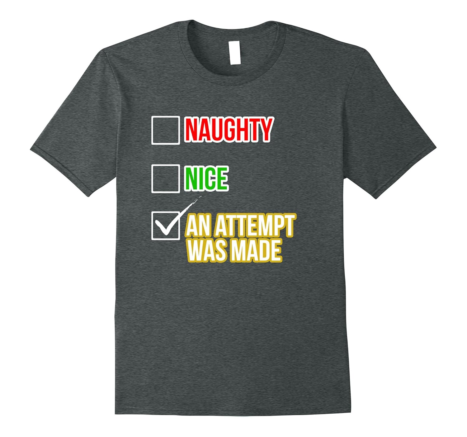 Solid colors: 100% Cotton; Heather Grey: 90% Cotton, 10% Polyester; All Other Heathers: 65% Cotton, 35% Polyester; Imported; Machine wash cold with like colors, dry low heat; Have you been naughty or nice? Santa Claus has been watching you, and Santas List says NAUGHTY, NICE, and AN ATTEMPT WAS MADE. Since Santa has seen some of what youve done this year, a check mark has been placed by your name for AN ATTEMPT WAS MADE.; Santa made his list Andamp; checked it twice! This funny NAUGHTY or NICE shirt is sized to be FITTED. For a RELAXED FIT, please order one size larger than normal. If YOU TRIED to be good, youll love this AN ATTEMPT WAS MADE meme funny santa NAUGHTY LIST shirt!; Lightweight, Classic fit, Double-needle sleeve and bottom hem