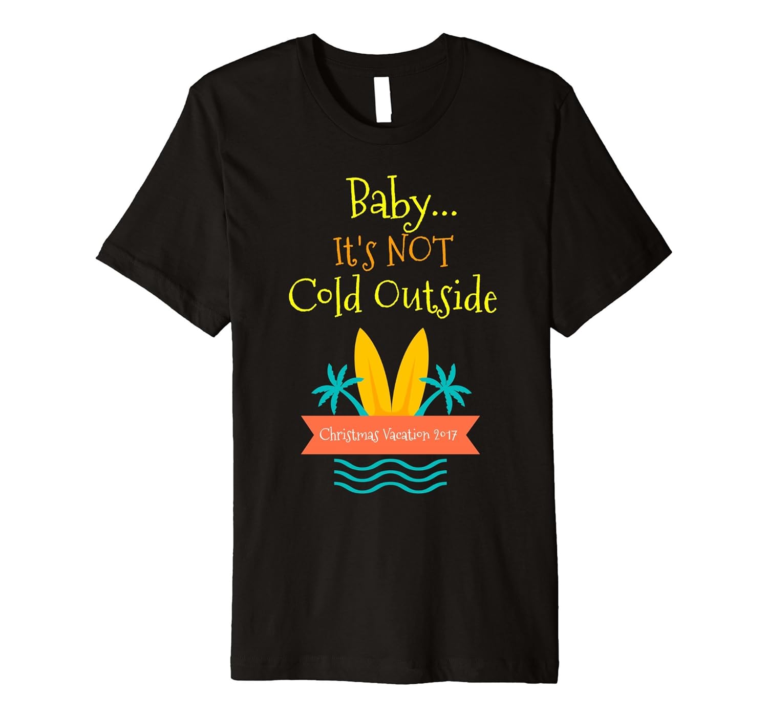 Solid colors: 100% Cotton; Heather Grey: 90% Cotton, 10% Polyester; All Other Heathers: 58% Cotton, 42% Polyester; Imported; Machine wash cold with like colors, dry low heat; KW Designs Funny Christmas Tropical Family Vacation Holiday T-Shirt; Fit: Slim (consider ordering a larger size for a looser fit); Baby, Its Not Cold Outside!; This premium t-shirt is made of lightweight fine jersey fabric