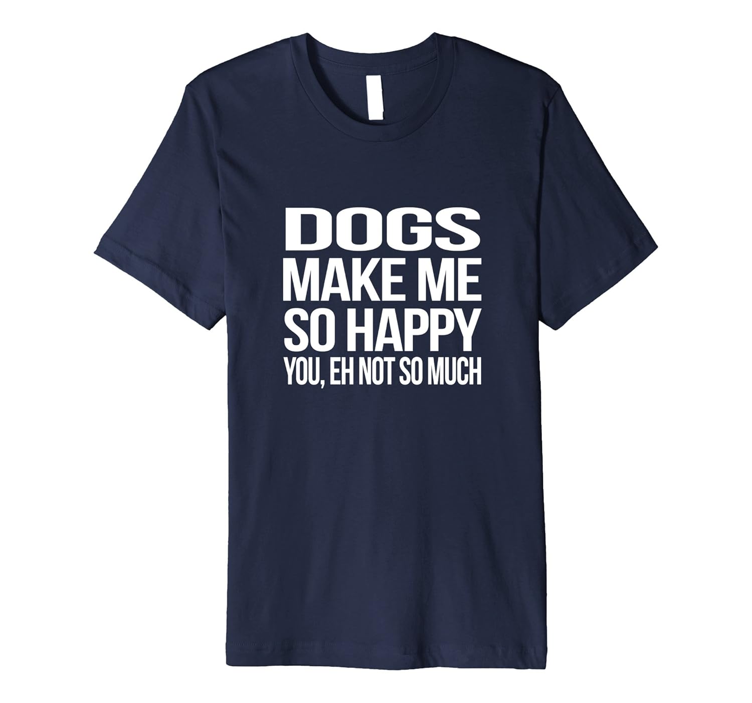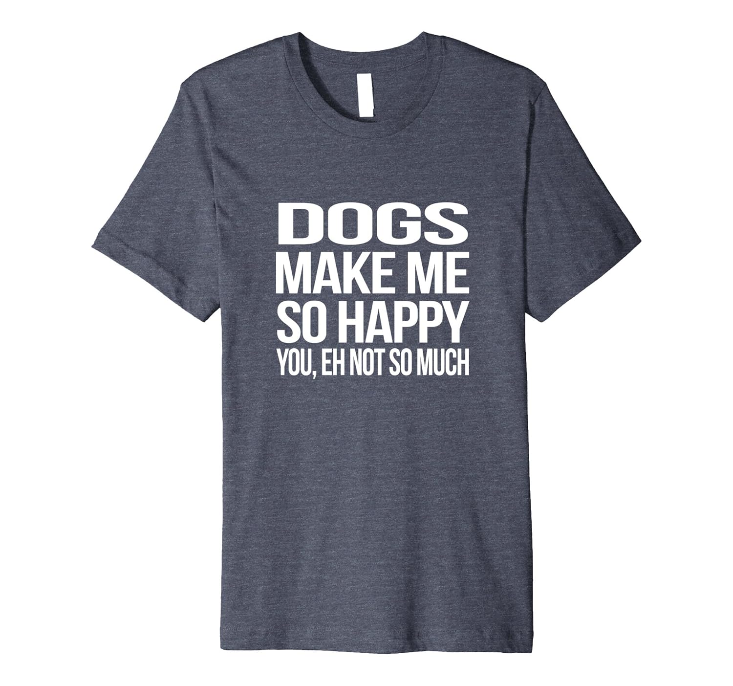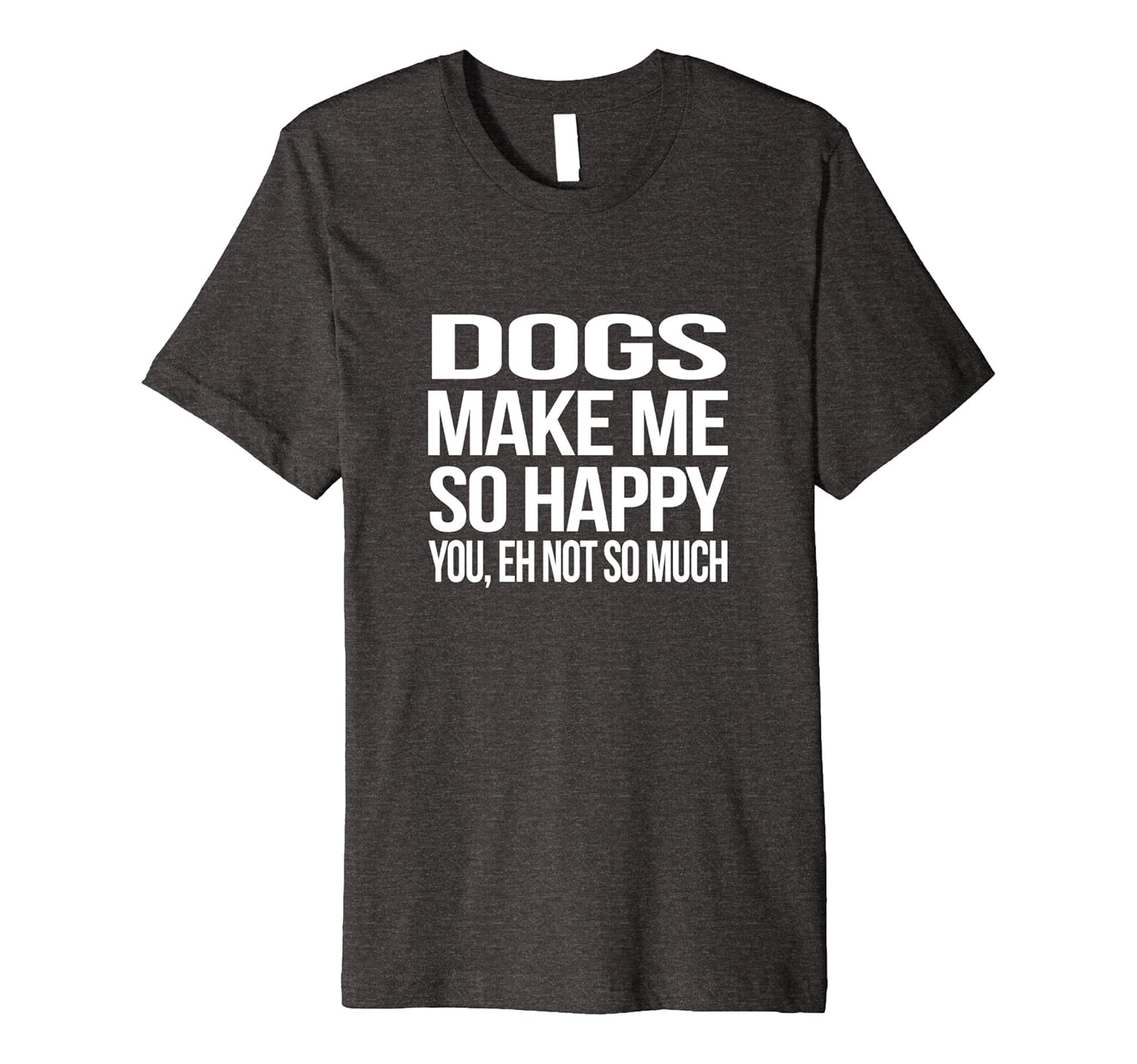 Solid colors: 100% Cotton; Heather Grey: 90% Cotton, 10% Polyester; All Other Heathers: 58% Cotton, 42% Polyester; Imported; Machine wash cold with like colors, dry low heat; DOGS MAKE ME SO HAPPY YOU EH NOT SO MUCH; Fit: Slim (consider ordering a larger size for a looser fit); This funny novelty shirt makes a unique gift for the dog mom or dog dad in your life.; This premium t-shirt is made of lightweight fine jersey fabric