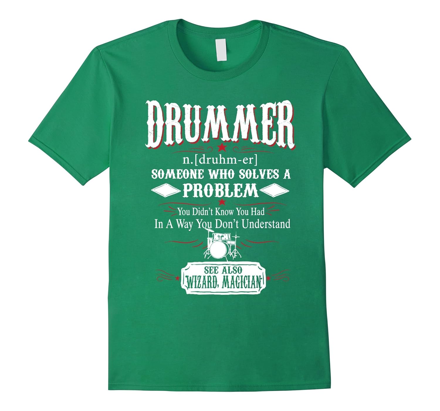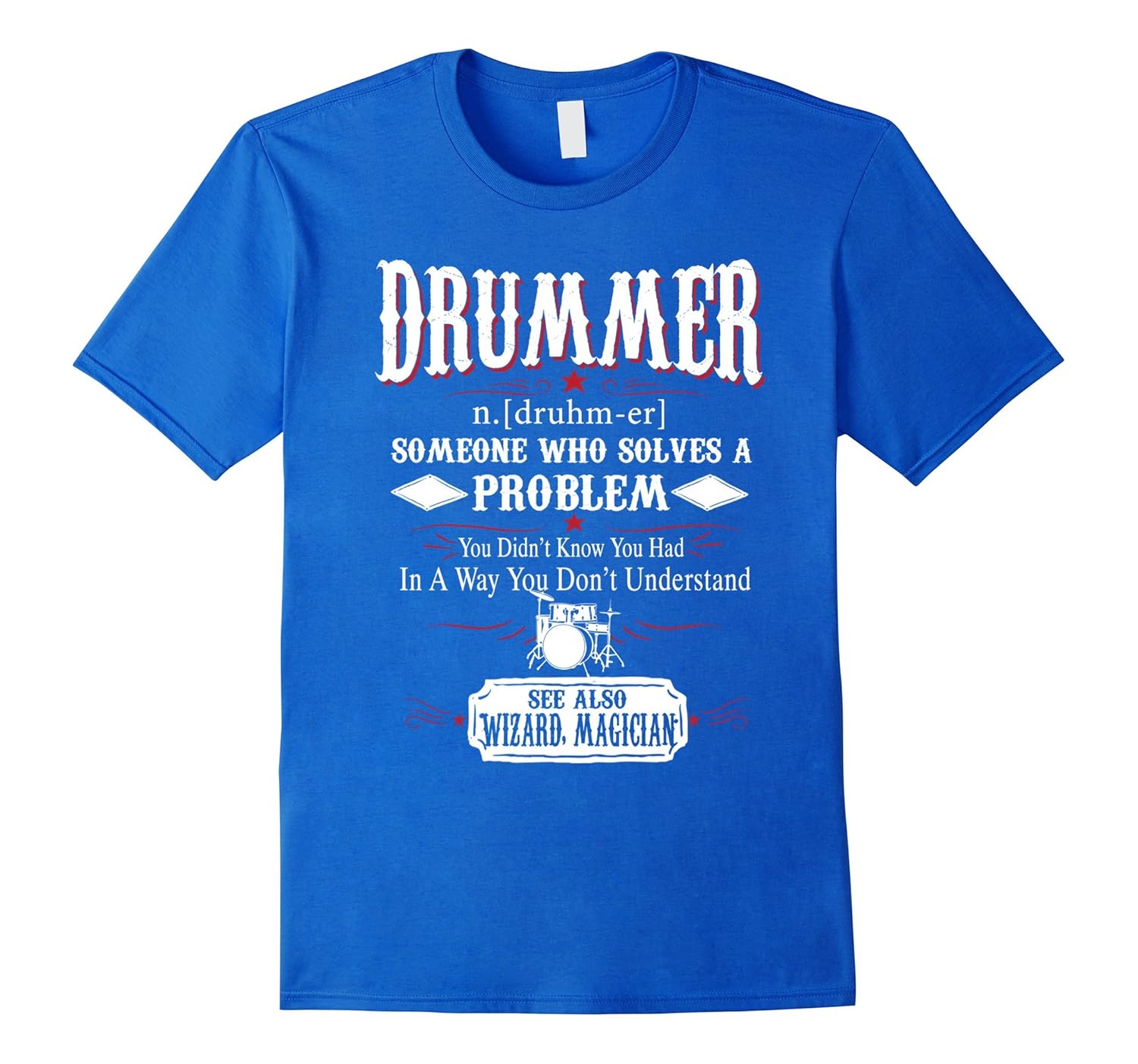Solid colors: 100% Cotton; Heather Grey: 90% Cotton, 10% Polyester; All Other Heathers: 65% Cotton, 35% Polyester, Imported, Machine wash cold with like colors, dry low heat, Drummer n.[druhm-er] Someone who solves a problem you didn”t know you had in a way you don”t understand See also wizard, magician, Drummer shirt, Drummer t shirt, Drummer tee shirts, t shirts Drummer, funny Drummer shirts, Drummer t shirt gift, Drummer gift, Lightweight, Classic fit, Double-needle sleeve and bottom hem