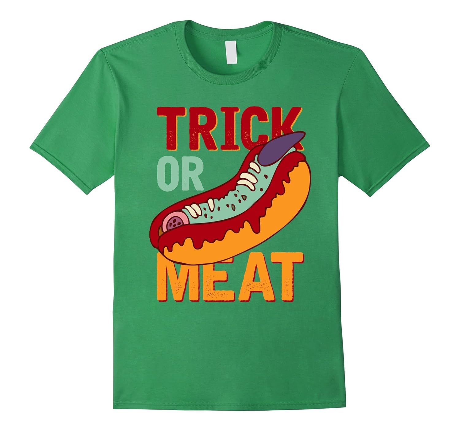 Solid colors: 100% Cotton; Heather Grey: 90% Cotton, 10% Polyester; All Other Heathers: 65% Cotton, 35% Polyester; Imported; Machine wash cold with like colors, dry low heat; Everyday is always a good day for hot dog and Halloween. Scary trick or meat Halloween t-shirt features a hot dog finger inside is perfect for any hot dog lovers, junk food fans. When we say trick or treat, we dont want candy, we want meat.; Wearing this tee and playing pranks on the spookiest night of the year. Trick or treating, passing out candy, Halloween party, hayride, ghost house. Getting this Halloween hot dog t-shirt and show your sense of humor.; Lightweight, Classic fit, Double-needle sleeve and bottom hem