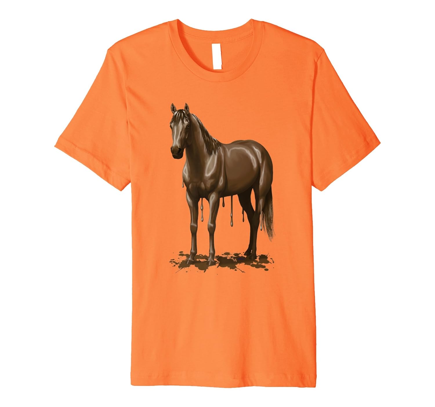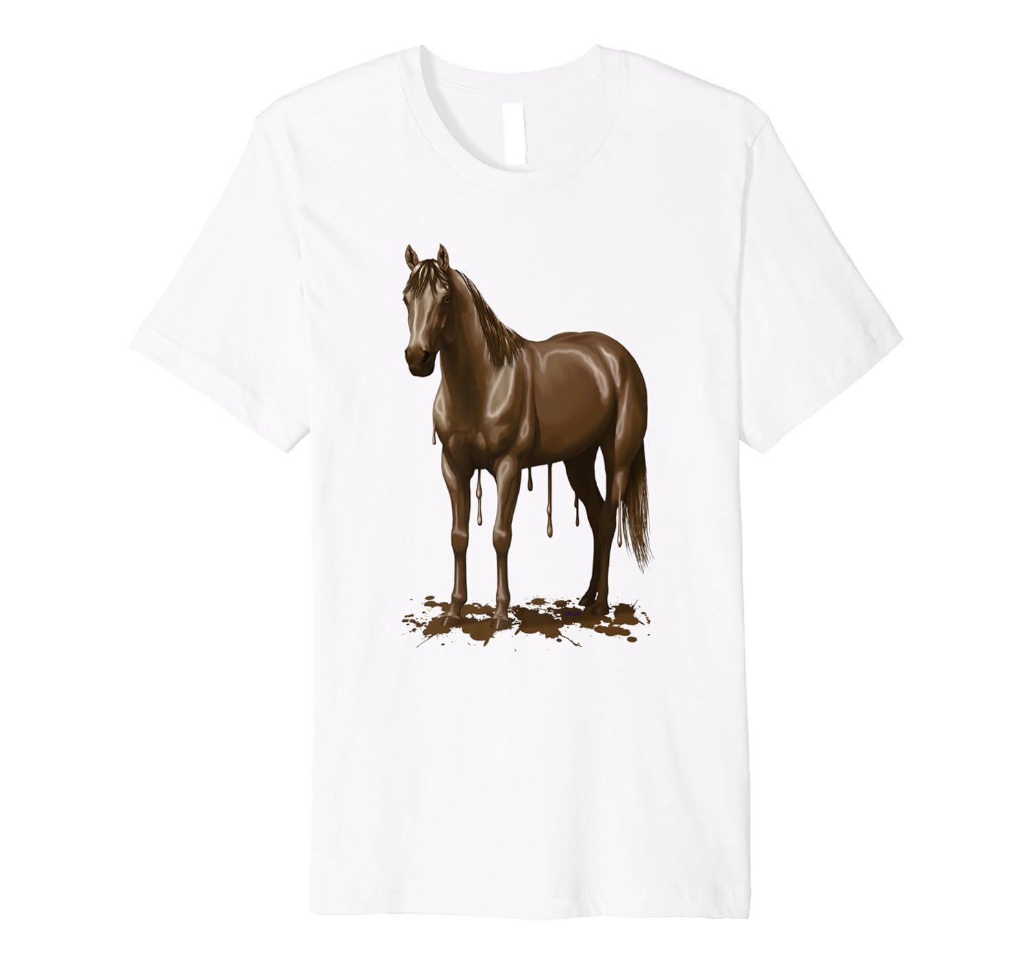 Solid colors: 100% Cotton; Heather Grey: 90% Cotton, 10% Polyester; All Other Heathers: 58% Cotton, 42% Polyester; Imported; Machine wash cold with like colors, dry low heat; Do you love horses? Do you love chocolate? Then whats better than a chocolate horse!? Original artwork featuring a brown horse made of chocolate, melting and dripping chocolate on the ground.; Great for horse lover who also love chocolate. Wear to celebrate Milk Chocolate Day in July.; This premium t-shirt is made of lightweight fine jersey fabric; Fit: Slim (consider ordering a larger size for a looser fit)