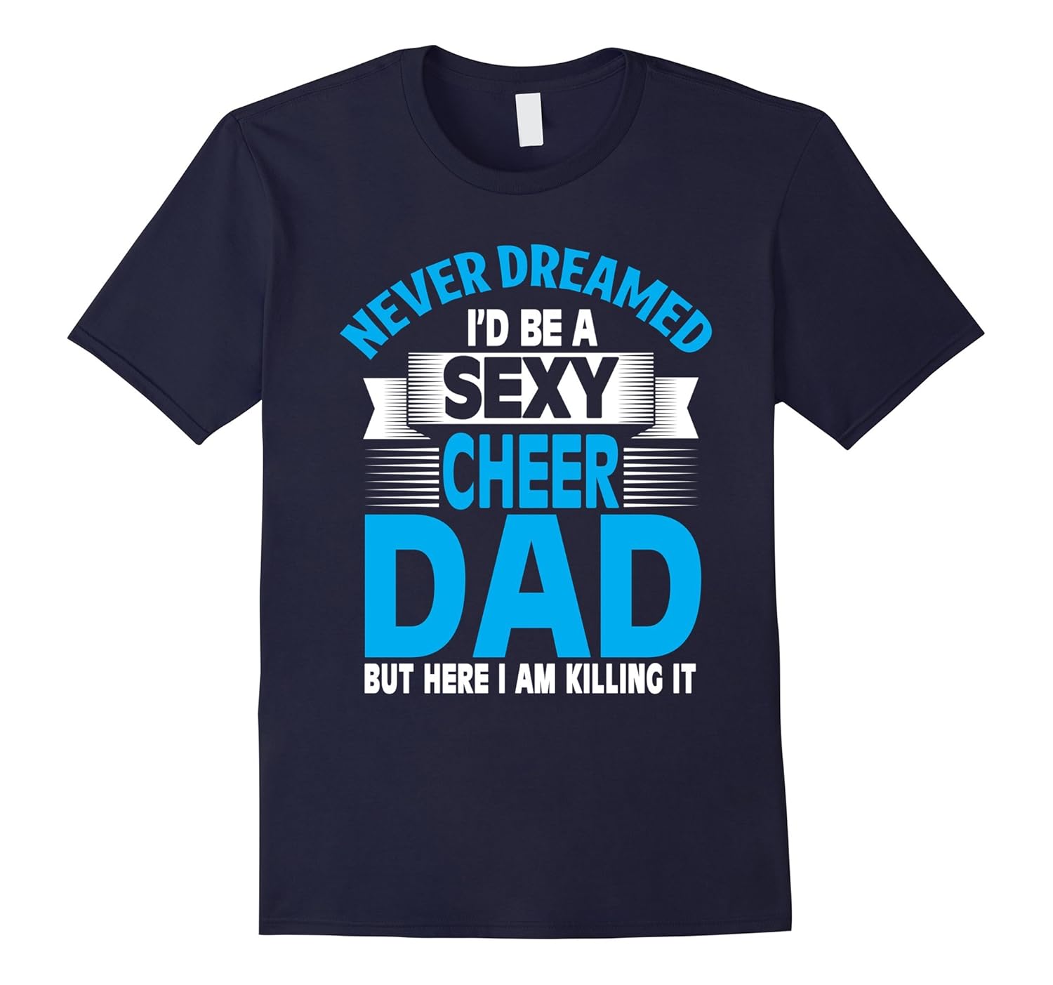 Solid colors: 100% Cotton; Heather Grey: 90% Cotton, 10% Polyester; All Other Heathers: 50% Cotton, 50% Polyester; Imported; Machine wash cold with like colors, dry low heat; Never Dreamed Id Be A Sexy Cheer Dad But Here I Am Killing It shirt is perfect for the encouraging and dedicated cheer and dance father in your life! Give this as a gift to the best dad in the world, and thank him for all of his time and energy!; Funny Never Dreamed Id Be A Sexy Cheer Dad T-Shirt is designed and printed to be fitted. If you prefer a looser fit please order one size larger.; Lightweight, Classic fit, Double-needle sleeve and bottom hem