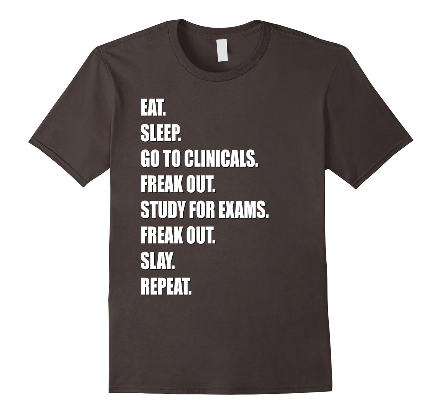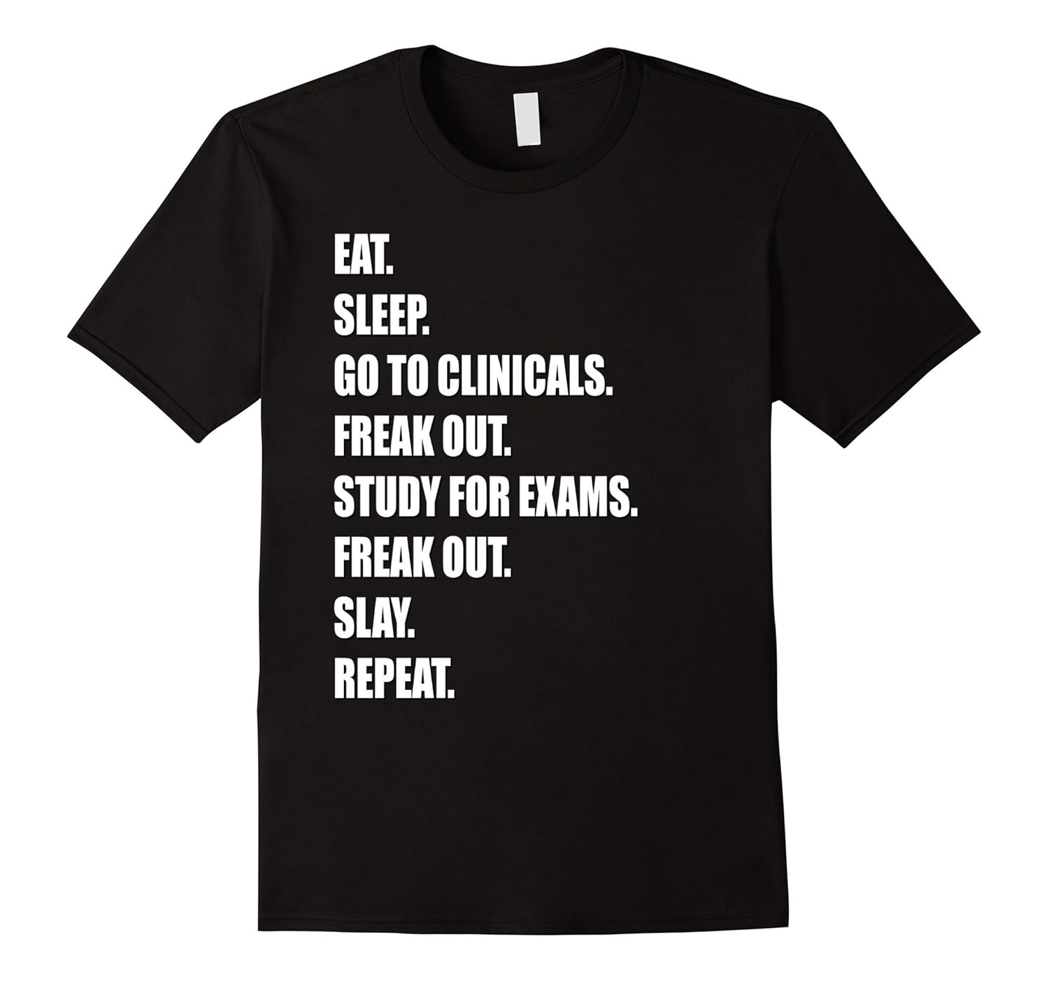 Solid colors: 100% Cotton; Heather Grey: 90% Cotton, 10% Polyester; All Other Heathers: 65% Cotton, 35% Polyester, Imported, Machine wash cold with like colors, dry low heat, Funny Nurse Shirt Reads: Eat Sleep Go To Clinicals Freak Out Study Slay Repeat, Lightweight, Classic fit, Double-needle sleeve and bottom hem