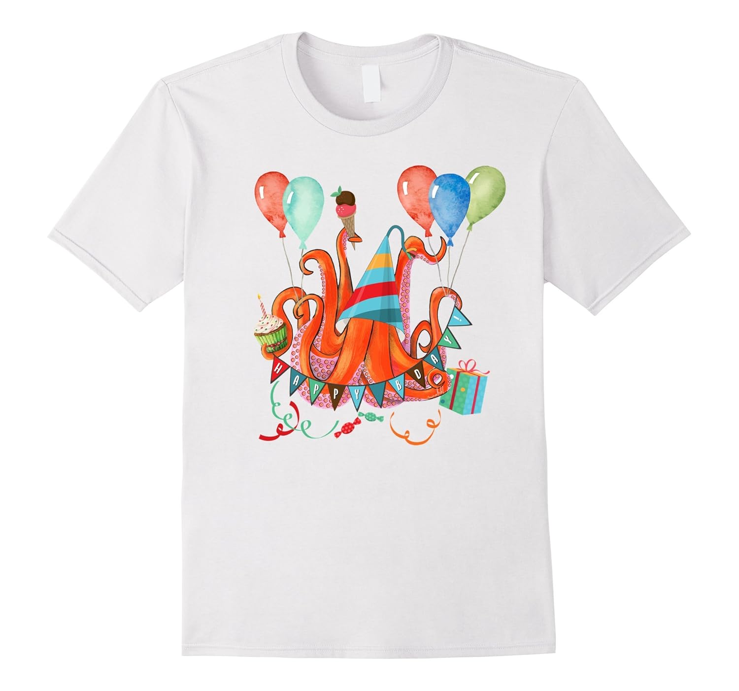 Solid colors: 100% Cotton; Heather Grey: 90% Cotton, 10% Polyester; All Other Heathers: 65% Cotton, 35% Polyester, Imported, Machine wash cold with like colors, dry low heat, This cute illustrative Octopus Tee shows an orange and pink octopus dressed up for a birthday party with balloons, cake, ice cream, gift, and birthday banner. Perfect gift for any parent, child, student, or friend who is having a birthday. Wear to a birthday party or give as a birthday gift. Lightweight, Classic fit, Double-needle sleeve and bottom hem