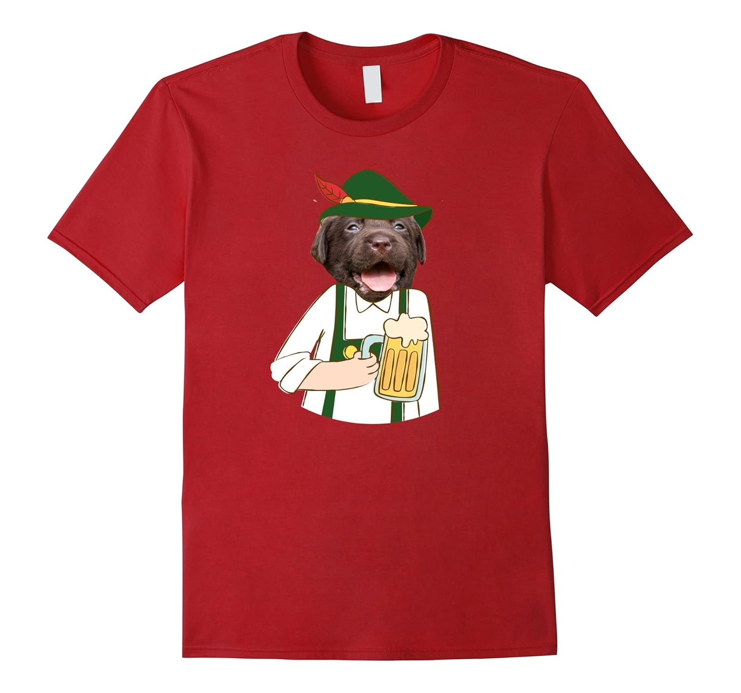 Solid colors: 100% Cotton; Heather Grey: 90% Cotton, 10% Polyester; All Other Heathers: 65% Cotton, 35% Polyester; Imported; Machine wash cold with like colors, dry low heat; Awesome tee shirt for Oktoberfest beer lovers, dog owners, beer masters, craft brewers. Humorous design with a cute Chocolate Lab puppy wearing a mens traditional leather lederhosen costume, a green German Tyrol Hat and holding a beer stein.; Wear this Oktoberfest shirt to your Autumn Beer Tasting party or Fall Festival. Also hilarious as a birthday or Christmas gift for bavarian beer drinkers or Black Lab or Yellow Lab pet parents, dog moms, dads. Lots of smiles and laughs with this t-shirt.; Lightweight, Classic fit, Double-needle sleeve and bottom hem