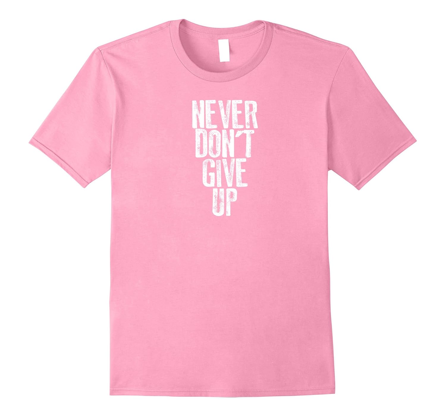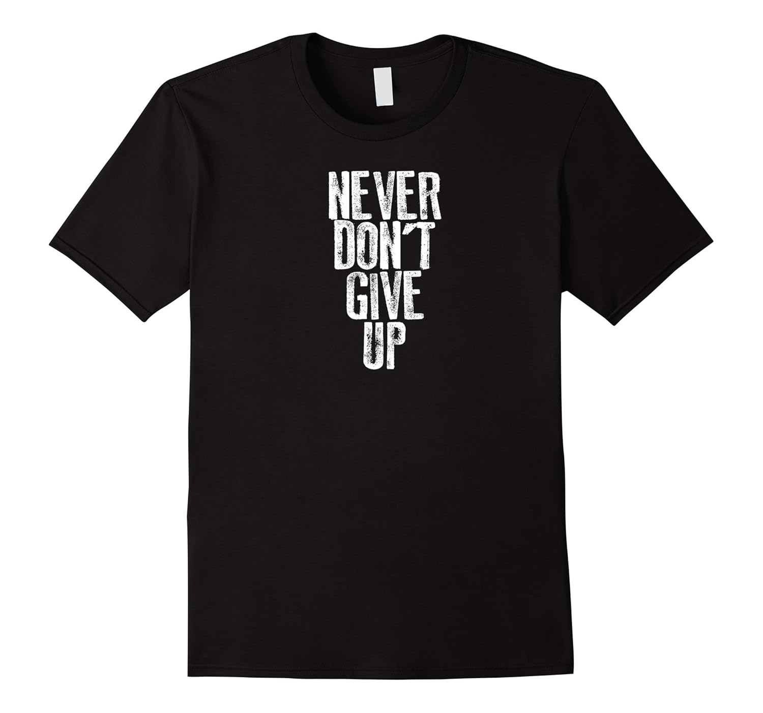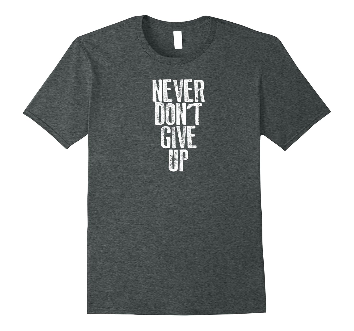 Solid colors: 100% Cotton; Heather Grey: 90% Cotton, 10% Polyester; All Other Heathers: 65% Cotton, 35% Polyester, Imported, Machine wash cold with like colors, dry low heat, “NEVER DON”T GIVE UP” Motivational Tee Shirt! What started as a grammatically horrible tattoo mistake is now the battle cry of mediocre achievers everywhere!, The perfect t-shirt for your average buddy, family, friends, for birthday, BBQ, exercise, work, holidays, Christmas, 1st/last dates, etc. Whenever!, Lightweight, Classic fit, Double-needle sleeve and bottom hem