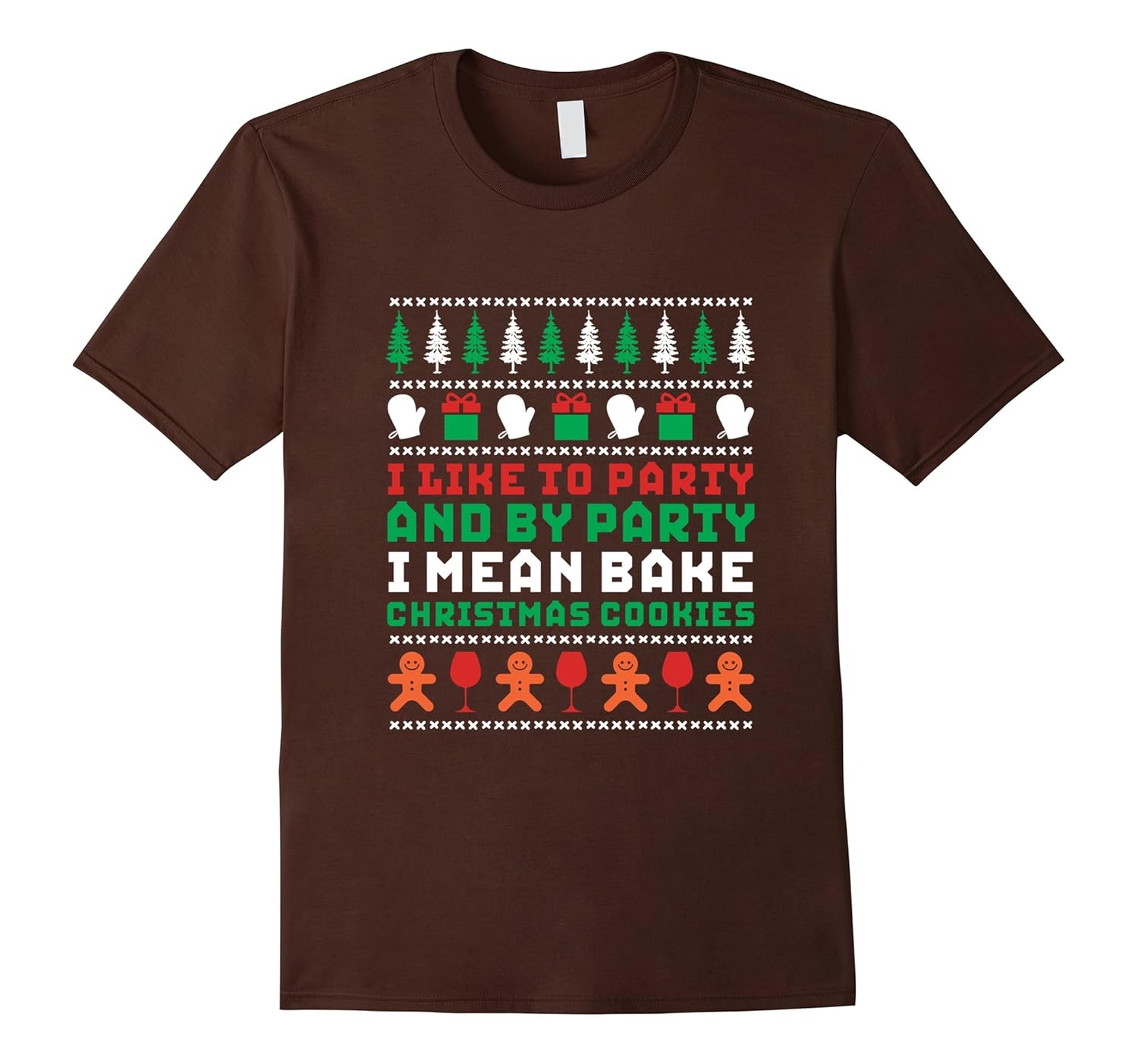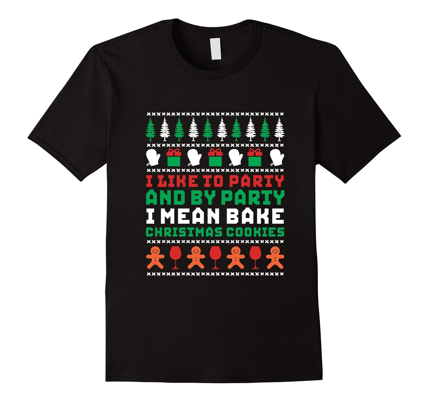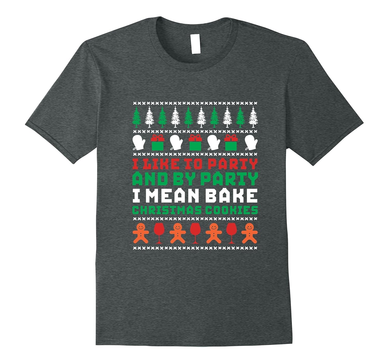 Solid colors: 100% Cotton; Heather Grey: 90% Cotton, 10% Polyester; All Other Heathers: 65% Cotton, 35% Polyester; Imported; Machine wash cold with like colors, dry low heat; Funny and sarcastic Christmas t-shirt in ugly sweater style. I like to party and by party I mean bake Christmas cookies. Cool and hilarious shirt to wear during Christmas party or family gathering. With gingerbread, wine glass, Christmas tree pattern.; This graphic tee makes a cute and funny gift for her, your sister, aunt, colleague, grandma who love baking, holiday humor, puns, jokes and sarcasm. Vintage and retro design. Style available for men, women, ladies, youth, teen, boy, girl, kids, children.; Lightweight, Classic fit, Double-needle sleeve and bottom hem